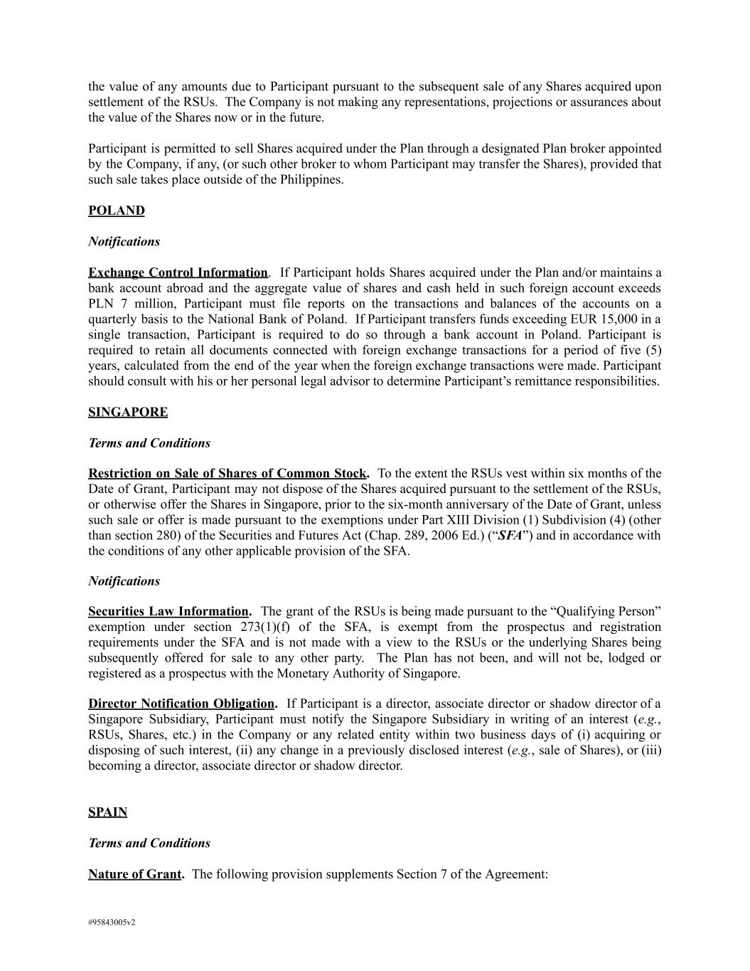 the value of any amounts due to Participant pursuant to the subsequent sale of any Shares acquired upon settlement of the RSUs. The Company is not making any representations, projections or assurances about the value of the Shares now or in the future. Participant is permitted to sell Shares acquired under the Plan through a designated Plan broker appointed by the Company, if any, (or such other broker to whom Participant may transfer the Shares), provided that such sale takes place outside of the Philippines. POLAND Notifications Exchange Control Information. If Participant holds Shares acquired under the Plan and/or maintains a bank account abroad and the aggregate value of shares and cash held in such foreign account exceeds PLN 7 million, Participant must file reports on the transactions and balances of the accounts on a quarterly basis to the National Bank of Poland. If Participant transfers funds exceeding EUR 15,000 in a single transaction, Participant is required to do so through a bank account in Poland. Participant is required to retain all documents connected with foreign exchange transactions for a period of five (5) years, calculated from the end of the year when the foreign exchange transactions were made. Participant should consult with his or her personal legal advisor to determine Participant’s remittance responsibilities. SINGAPORE Terms and Conditions Restriction on Sale of Shares of Common Stock. To the extent the RSUs vest within six months of the Date of Grant, Participant may not dispose of the Shares acquired pursuant to the settlement of the RSUs, or otherwise offer the Shares in Singapore, prior to the six-month anniversary of the Date of Grant, unless such sale or offer is made pursuant to the exemptions under Part XIII Division (1) Subdivision (4) (other than section 280) of the Securities and Futures Act (Chap. 289, 2006 Ed.) (“SFA”) and in accordance with the conditions of any other applicable provision of the SFA. Notifications Securities Law Information. The grant of the RSUs is being made pursuant to the “Qualifying Person” exemption under section 273(1)(f) of the SFA, is exempt from the prospectus and registration requirements under the SFA and is not made with a view to the RSUs or the underlying Shares being subsequently offered for sale to any other party. The Plan has not been, and will not be, lodged or registered as a prospectus with the Monetary Authority of Singapore. Director Notification Obligation. If Participant is a director, associate director or shadow director of a Singapore Subsidiary, Participant must notify the Singapore Subsidiary in writing of an interest (e.g., RSUs, Shares, etc.) in the Company or any related entity within two business days of (i) acquiring or disposing of such interest, (ii) any change in a previously disclosed interest (e.g., sale of Shares), or (iii) becoming a director, associate director or shadow director. SPAIN Terms and Conditions Nature of Grant. The following provision supplements Section 7 of the Agreement: #95843005v2
