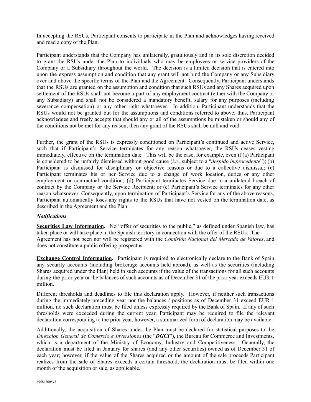 In accepting the RSUs, Participant consents to participate in the Plan and acknowledges having received and read a copy of the Plan. Participant understands that the Company has unilaterally, gratuitously and in its sole discretion decided to grant the RSUs under the Plan to individuals who may be employees or service providers of the Company or a Subsidiary throughout the world. The decision is a limited decision that is entered into upon the express assumption and condition that any grant will not bind the Company or any Subsidiary over and above the specific terms of the Plan and the Agreement. Consequently, Participant understands that the RSUs are granted on the assumption and condition that such RSUs and any Shares acquired upon settlement of the RSUs shall not become a part of any employment contract (either with the Company or any Subsidiary) and shall not be considered a mandatory benefit, salary for any purposes (including severance compensation) or any other right whatsoever. In addition, Participant understands that the RSUs would not be granted but for the assumptions and conditions referred to above; thus, Participant acknowledges and freely accepts that should any or all of the assumptions be mistaken or should any of the conditions not be met for any reason, then any grant of the RSUs shall be null and void. Further, the grant of the RSUs is expressly conditioned on Participant’s continued and active Service, such that if Participant’s Service terminates for any reason whatsoever, the RSUs ceases vesting immediately, effective on the termination date. This will be the case, for example, even if (a) Participant is considered to be unfairly dismissed without good cause (i.e., subject to a “despido improcedente”); (b) Participant is dismissed for disciplinary or objective reasons or due to a collective dismissal; (c) Participant terminates his or her Service due to a change of work location, duties or any other employment or contractual condition; (d) Participant terminates Service due to a unilateral breach of contract by the Company or the Service Recipient; or (e) Participant’s Service terminates for any other reason whatsoever. Consequently, upon termination of Participant’s Service for any of the above reasons, Participant automatically loses any rights to the RSUs that have not vested on the termination date, as described in the Agreement and the Plan. Notifications Securities Law Information. No “offer of securities to the public,” as defined under Spanish law, has taken place or will take place in the Spanish territory in connection with the offer of the RSUs. The Agreement has not been nor will be registered with the Comisión Nacional del Mercado de Valores, and does not constitute a public offering prospectus. Exchange Control Information. Participant is required to electronically declare to the Bank of Spain any security accounts (including brokerage accounts held abroad), as well as the securities (including Shares acquired under the Plan) held in such accounts if the value of the transactions for all such accounts during the prior year or the balances of such accounts as of December 31 of the prior year exceeds EUR 1 million. Different thresholds and deadlines to file this declaration apply. However, if neither such transactions during the immediately preceding year nor the balances / positions as of December 31 exceed EUR 1 million, no such declaration must be filed unless expressly required by the Bank of Spain. If any of such thresholds were exceeded during the current year, Participant may be required to file the relevant declaration corresponding to the prior year, however, a summarized form of declaration may be available. Additionally, the acquisition of Shares under the Plan must be declared for statistical purposes to the Direccion General de Comercio e Inversiones (the “DGCI”), the Bureau for Commerce and Investments, which is a department of the Ministry of Economy, Industry and Competitiveness. Generally, the declaration must be filed in January for shares (and any other securities) owned as of December 31 of each year; however, if the value of the Shares acquired or the amount of the sale proceeds Participant realizes from the sale of Shares exceeds a certain threshold, the declaration must be filed within one month of the acquisition or sale, as applicable. #95843005v2