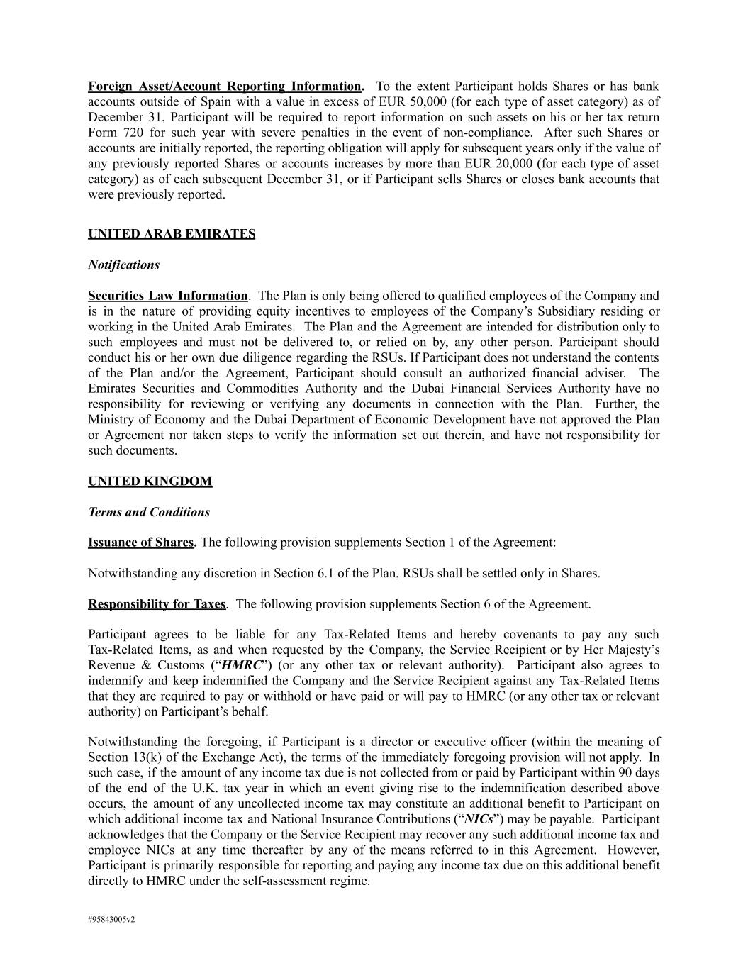 Foreign Asset/Account Reporting Information. To the extent Participant holds Shares or has bank accounts outside of Spain with a value in excess of EUR 50,000 (for each type of asset category) as of December 31, Participant will be required to report information on such assets on his or her tax return Form 720 for such year with severe penalties in the event of non-compliance. After such Shares or accounts are initially reported, the reporting obligation will apply for subsequent years only if the value of any previously reported Shares or accounts increases by more than EUR 20,000 (for each type of asset category) as of each subsequent December 31, or if Participant sells Shares or closes bank accounts that were previously reported. UNITED ARAB EMIRATES Notifications Securities Law Information. The Plan is only being offered to qualified employees of the Company and is in the nature of providing equity incentives to employees of the Company’s Subsidiary residing or working in the United Arab Emirates. The Plan and the Agreement are intended for distribution only to such employees and must not be delivered to, or relied on by, any other person. Participant should conduct his or her own due diligence regarding the RSUs. If Participant does not understand the contents of the Plan and/or the Agreement, Participant should consult an authorized financial adviser. The Emirates Securities and Commodities Authority and the Dubai Financial Services Authority have no responsibility for reviewing or verifying any documents in connection with the Plan. Further, the Ministry of Economy and the Dubai Department of Economic Development have not approved the Plan or Agreement nor taken steps to verify the information set out therein, and have not responsibility for such documents. UNITED KINGDOM Terms and Conditions Issuance of Shares. The following provision supplements Section 1 of the Agreement: Notwithstanding any discretion in Section 6.1 of the Plan, RSUs shall be settled only in Shares. Responsibility for Taxes. The following provision supplements Section 6 of the Agreement. Participant agrees to be liable for any Tax-Related Items and hereby covenants to pay any such Tax-Related Items, as and when requested by the Company, the Service Recipient or by Her Majesty’s Revenue & Customs (“HMRC”) (or any other tax or relevant authority). Participant also agrees to indemnify and keep indemnified the Company and the Service Recipient against any Tax-Related Items that they are required to pay or withhold or have paid or will pay to HMRC (or any other tax or relevant authority) on Participant’s behalf. Notwithstanding the foregoing, if Participant is a director or executive officer (within the meaning of Section 13(k) of the Exchange Act), the terms of the immediately foregoing provision will not apply. In such case, if the amount of any income tax due is not collected from or paid by Participant within 90 days of the end of the U.K. tax year in which an event giving rise to the indemnification described above occurs, the amount of any uncollected income tax may constitute an additional benefit to Participant on which additional income tax and National Insurance Contributions (“NICs”) may be payable. Participant acknowledges that the Company or the Service Recipient may recover any such additional income tax and employee NICs at any time thereafter by any of the means referred to in this Agreement. However, Participant is primarily responsible for reporting and paying any income tax due on this additional benefit directly to HMRC under the self-assessment regime. #95843005v2