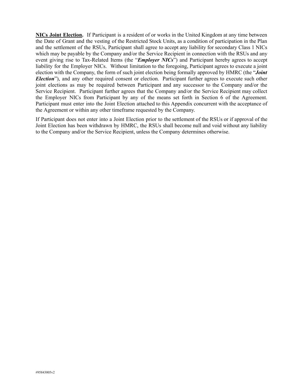 NICs Joint Election. If Participant is a resident of or works in the United Kingdom at any time between the Date of Grant and the vesting of the Restricted Stock Units, as a condition of participation in the Plan and the settlement of the RSUs, Participant shall agree to accept any liability for secondary Class 1 NICs which may be payable by the Company and/or the Service Recipient in connection with the RSUs and any event giving rise to Tax-Related Items (the “Employer NICs”) and Participant hereby agrees to accept liability for the Employer NICs. Without limitation to the foregoing, Participant agrees to execute a joint election with the Company, the form of such joint election being formally approved by HMRC (the “Joint Election”), and any other required consent or election. Participant further agrees to execute such other joint elections as may be required between Participant and any successor to the Company and/or the Service Recipient. Participant further agrees that the Company and/or the Service Recipient may collect the Employer NICs from Participant by any of the means set forth in Section 6 of the Agreement. Participant must enter into the Joint Election attached to this Appendix concurrent with the acceptance of the Agreement or within any other timeframe requested by the Company. If Participant does not enter into a Joint Election prior to the settlement of the RSUs or if approval of the Joint Election has been withdrawn by HMRC, the RSUs shall become null and void without any liability to the Company and/or the Service Recipient, unless the Company determines otherwise. #95843005v2