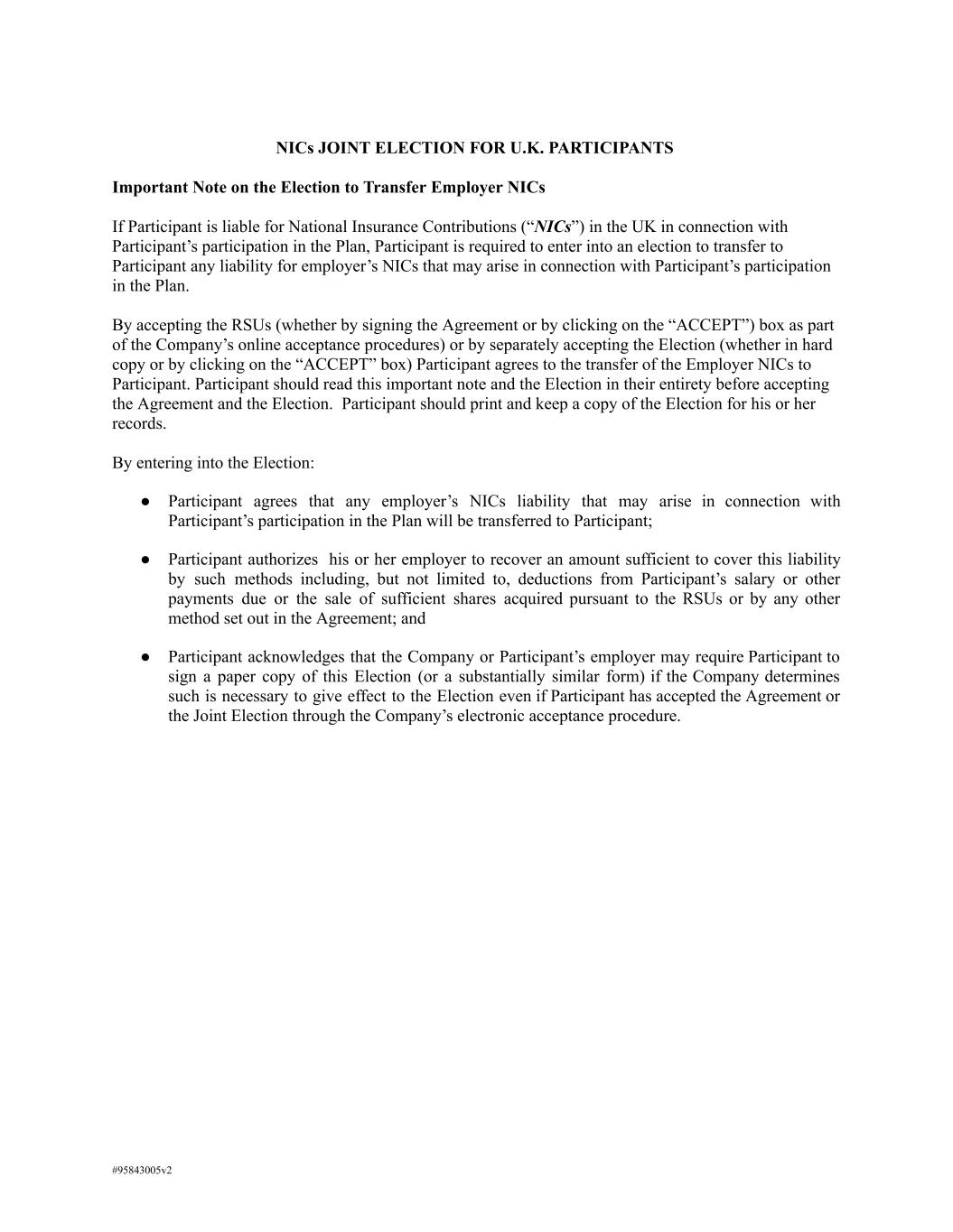 NICs JOINT ELECTION FOR U.K. PARTICIPANTS Important Note on the Election to Transfer Employer NICs If Participant is liable for National Insurance Contributions (“NICs”) in the UK in connection with Participant’s participation in the Plan, Participant is required to enter into an election to transfer to Participant any liability for employer’s NICs that may arise in connection with Participant’s participation in the Plan. By accepting the RSUs (whether by signing the Agreement or by clicking on the “ACCEPT”) box as part of the Company’s online acceptance procedures) or by separately accepting the Election (whether in hard copy or by clicking on the “ACCEPT” box) Participant agrees to the transfer of the Employer NICs to Participant. Participant should read this important note and the Election in their entirety before accepting the Agreement and the Election. Participant should print and keep a copy of the Election for his or her records. By entering into the Election: ● Participant agrees that any employer’s NICs liability that may arise in connection with Participant’s participation in the Plan will be transferred to Participant; ● Participant authorizes his or her employer to recover an amount sufficient to cover this liability by such methods including, but not limited to, deductions from Participant’s salary or other payments due or the sale of sufficient shares acquired pursuant to the RSUs or by any other method set out in the Agreement; and ● Participant acknowledges that the Company or Participant’s employer may require Participant to sign a paper copy of this Election (or a substantially similar form) if the Company determines such is necessary to give effect to the Election even if Participant has accepted the Agreement or the Joint Election through the Company’s electronic acceptance procedure. #95843005v2