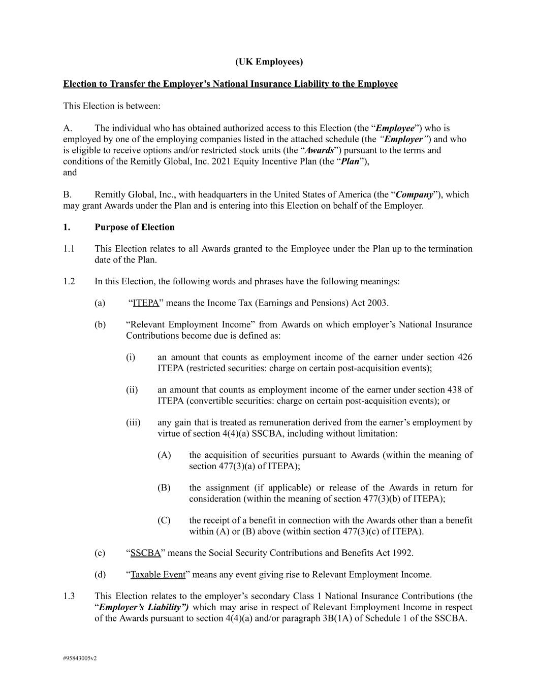 (UK Employees) Election to Transfer the Employer’s National Insurance Liability to the Employee This Election is between: A. The individual who has obtained authorized access to this Election (the “Employee”) who is employed by one of the employing companies listed in the attached schedule (the “Employer”) and who is eligible to receive options and/or restricted stock units (the “Awards”) pursuant to the terms and conditions of the Remitly Global, Inc. 2021 Equity Incentive Plan (the “Plan”), and B. Remitly Global, Inc., with headquarters in the United States of America (the “Company”), which may grant Awards under the Plan and is entering into this Election on behalf of the Employer. 1. Purpose of Election 1.1 This Election relates to all Awards granted to the Employee under the Plan up to the termination date of the Plan. 1.2 In this Election, the following words and phrases have the following meanings: (a) “ITEPA” means the Income Tax (Earnings and Pensions) Act 2003. (b) “Relevant Employment Income” from Awards on which employer’s National Insurance Contributions become due is defined as: (i) an amount that counts as employment income of the earner under section 426 ITEPA (restricted securities: charge on certain post-acquisition events); (ii) an amount that counts as employment income of the earner under section 438 of ITEPA (convertible securities: charge on certain post-acquisition events); or (iii) any gain that is treated as remuneration derived from the earner’s employment by virtue of section 4(4)(a) SSCBA, including without limitation: (A) the acquisition of securities pursuant to Awards (within the meaning of section 477(3)(a) of ITEPA); (B) the assignment (if applicable) or release of the Awards in return for consideration (within the meaning of section 477(3)(b) of ITEPA); (C) the receipt of a benefit in connection with the Awards other than a benefit within (A) or (B) above (within section 477(3)(c) of ITEPA). (c) “SSCBA” means the Social Security Contributions and Benefits Act 1992. (d) “Taxable Event” means any event giving rise to Relevant Employment Income. 1.3 This Election relates to the employer’s secondary Class 1 National Insurance Contributions (the “Employer’s Liability”) which may arise in respect of Relevant Employment Income in respect of the Awards pursuant to section 4(4)(a) and/or paragraph 3B(1A) of Schedule 1 of the SSCBA. #95843005v2