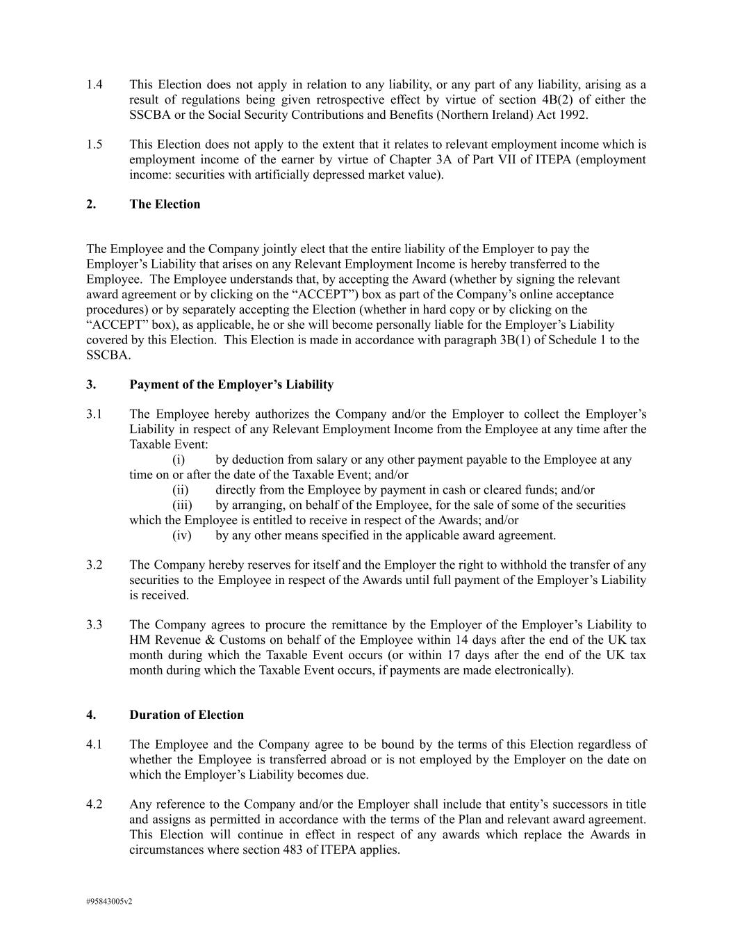 1.4 This Election does not apply in relation to any liability, or any part of any liability, arising as a result of regulations being given retrospective effect by virtue of section 4B(2) of either the SSCBA or the Social Security Contributions and Benefits (Northern Ireland) Act 1992. 1.5 This Election does not apply to the extent that it relates to relevant employment income which is employment income of the earner by virtue of Chapter 3A of Part VII of ITEPA (employment income: securities with artificially depressed market value). 2. The Election The Employee and the Company jointly elect that the entire liability of the Employer to pay the Employer’s Liability that arises on any Relevant Employment Income is hereby transferred to the Employee. The Employee understands that, by accepting the Award (whether by signing the relevant award agreement or by clicking on the “ACCEPT”) box as part of the Company’s online acceptance procedures) or by separately accepting the Election (whether in hard copy or by clicking on the “ACCEPT” box), as applicable, he or she will become personally liable for the Employer’s Liability covered by this Election. This Election is made in accordance with paragraph 3B(1) of Schedule 1 to the SSCBA. 3. Payment of the Employer’s Liability 3.1 The Employee hereby authorizes the Company and/or the Employer to collect the Employer’s Liability in respect of any Relevant Employment Income from the Employee at any time after the Taxable Event: (i) by deduction from salary or any other payment payable to the Employee at any time on or after the date of the Taxable Event; and/or (ii) directly from the Employee by payment in cash or cleared funds; and/or (iii) by arranging, on behalf of the Employee, for the sale of some of the securities which the Employee is entitled to receive in respect of the Awards; and/or (iv) by any other means specified in the applicable award agreement. 3.2 The Company hereby reserves for itself and the Employer the right to withhold the transfer of any securities to the Employee in respect of the Awards until full payment of the Employer’s Liability is received. 3.3 The Company agrees to procure the remittance by the Employer of the Employer’s Liability to HM Revenue & Customs on behalf of the Employee within 14 days after the end of the UK tax month during which the Taxable Event occurs (or within 17 days after the end of the UK tax month during which the Taxable Event occurs, if payments are made electronically). 4. Duration of Election 4.1 The Employee and the Company agree to be bound by the terms of this Election regardless of whether the Employee is transferred abroad or is not employed by the Employer on the date on which the Employer’s Liability becomes due. 4.2 Any reference to the Company and/or the Employer shall include that entity’s successors in title and assigns as permitted in accordance with the terms of the Plan and relevant award agreement. This Election will continue in effect in respect of any awards which replace the Awards in circumstances where section 483 of ITEPA applies. #95843005v2