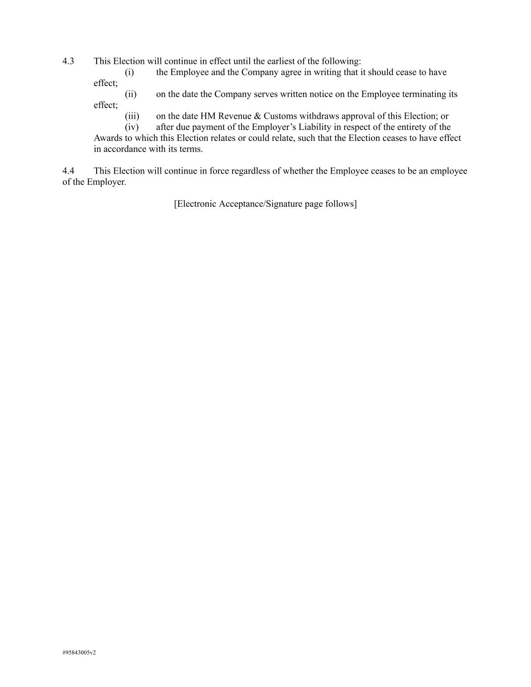 4.3 This Election will continue in effect until the earliest of the following: (i) the Employee and the Company agree in writing that it should cease to have effect; (ii) on the date the Company serves written notice on the Employee terminating its effect; (iii) on the date HM Revenue & Customs withdraws approval of this Election; or (iv) after due payment of the Employer’s Liability in respect of the entirety of the Awards to which this Election relates or could relate, such that the Election ceases to have effect in accordance with its terms. 4.4 This Election will continue in force regardless of whether the Employee ceases to be an employee of the Employer. [Electronic Acceptance/Signature page follows] #95843005v2