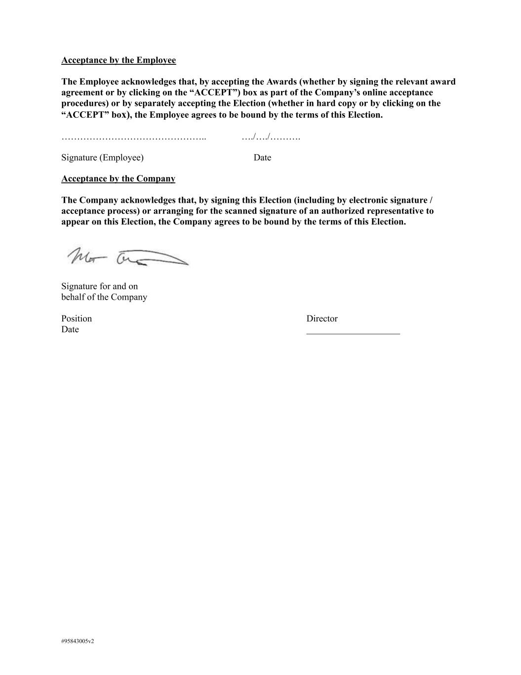 Acceptance by the Employee The Employee acknowledges that, by accepting the Awards (whether by signing the relevant award agreement or by clicking on the “ACCEPT”) box as part of the Company’s online acceptance procedures) or by separately accepting the Election (whether in hard copy or by clicking on the “ACCEPT” box), the Employee agrees to be bound by the terms of this Election. ……………………………………….. …./…./………. Signature (Employee) Date Acceptance by the Company The Company acknowledges that, by signing this Election (including by electronic signature / acceptance process) or arranging for the scanned signature of an authorized representative to appear on this Election, the Company agrees to be bound by the terms of this Election. Signature for and on behalf of the Company Position Director Date ____________________ #95843005v2