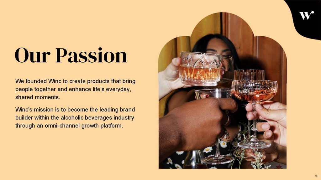 6 Our Passion We founded Winc to create products that bring people together and enhance life’s everyday, shared moments. Winc's mission is to become the leading brand builder within the alcoholic beverages industry through an omni - channel growth platform.