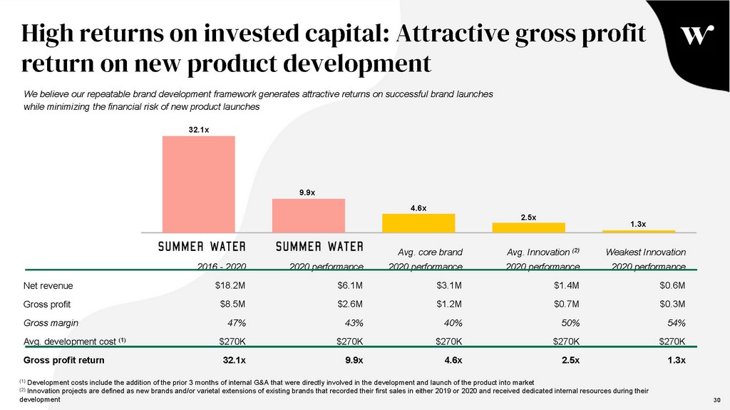 29 Returns on invested capital: Rapid development cycle with durable brands Traditional winemakers Brand development is risky and expensive (1) Development costs include the addition of the prior 3 months of internal G&A that were directly involved in the development a nd launch of the product into market (2) Using innovation projects that were launched online from 2019 - 2020 Cost Time Expensive, asset - heavy model with costs to own vineyards, grape supply and manufacturing facilities, overhead and marketing expenses required for launch Slow to react with timelines of 6 to over 12 months based on industry knowledge Our asset - light supply chain and data - driven insights allows us to beat our competitors from grape to glass Brand development is relatively inexpensive, rapid, and data - driven to ensure success Low - cost, asset - light model The average cost to develop and launch a new wine brand in 2019 and 2020 was $270,000 (1) , and data from the DTC launch is leveraged to help achieve success when bringing product to scale Rapid time from bottling to customer In approximately 2 months (2)
