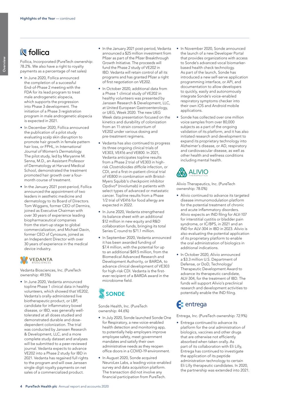 4 PureTech Health plc Annual report and accounts 2020 O ve rv ie w Highlights of the Year — continued Follica, Incorporated (PureTech ownership: 78.2%. We also have a right to royalty payments as a percentage of net sales) • In June 2020, Follica announced the completion of a successful End-of-Phase 2 meeting with the FDA for its lead program to treat male androgenetic alopecia, which supports the progression into Phase 3 development. The initiation of a Phase 3 registration program in male androgenetic alopecia is expected in 2021. • In December 2020, Follica announced the publication of a pilot study evaluating scalp skin disruption to promote hair growth in female pattern hair loss, or FPHL, in International Journal of Women’s Dermatology. The pilot study, led by Maryanne M. Senna, M.D., an Assistant Professor of Dermatology at Harvard Medical School, demonstrated the treatment promoted hair growth over a four- month course of treatment. • In the January 2021 post-period, Follica announced the appointment of two leaders in aesthetic medicine and dermatology to its Board of Directors. Tom Wiggans, former CEO of Dermira, joined as Executive Chairman with over 30 years of experience leading biopharmaceutical companies from the start-up stage to global commercialization, and Michael Davin, former CEO of Cynosure, joined as an Independent Director with over 30 years of experience in the medical device industry. Vedanta Biosciences, Inc. (PureTech ownership: 49.5%) • In June 2020, Vedanta announced topline Phase 1 clinical data in healthy volunteers, which showed that VE202, Vedanta’s orally-administered live biotherapeutic product, or LBP, candidate for inflammatory bowel disease, or IBD, was generally well- tolerated at all doses studied and demonstrated durable and dose- dependent colonization. The trial was conducted by Janssen Research & Development, LLC, and a more complete study dataset and analyses will be submitted to a peer-reviewed journal. Vedanta expects to advance VE202 into a Phase 2 study for IBD in 2021. Vedanta has regained full rights to the program and will owe Janssen single-digit royalty payments on net sales of a commercialized product. • In the January 2021 post-period, Vedanta announced a $25 million investment from Pfizer as part of the Pfizer Breakthrough Growth Initiative. The proceeds will fund the Phase 2 study of VE202 in IBD. Vedanta will retain control of all its programs and has granted Pfizer a right of first negotiation on VE202. • In October 2020, additional data from a Phase 1 clinical study of VE202 in healthy volunteers was presented by Janssen Research & Development, LLC, at United European Gastroenterology, or UEG, Week 2020. The new UEG Week data presentation focused on the kinetics and durability of colonization from an 11-strain consortium of VE202 under various dosing and pre-treatment regimens. • Vedanta has also continued to progress its three ongoing clinical trials of VE303, VE416 and VE800. In 2021, Vedanta anticipates topline results from a Phase 2 trial of VE303 in high- risk Clostridioides difficile infection, or CDI, and a first-in-patient clinical trial of VE800 in combination with Bristol- Myers Squibb’s checkpoint inhibitor Opdivo® (nivolumab) in patients with select types of advanced or metastatic cancer. Topline results from a Phase 1/2 trial of VE416 for food allergy are expected in 2022. • In June 2020, Vedanta strengthened its balance sheet with an additional $12 million in new equity and R&D collaboration funds, bringing its total Series C round to $71.1 million. • In September 2020, Vedanta announced it has been awarded funding of $7.4 million, with the potential for up to an additional $69.5 million, from the Biomedical Advanced Research and Development Authority, or BARDA, to advance clinical development of VE303 for high-risk CDI. Vedanta is the first- ever recipient of a BARDA award in the microbiome field. Sonde Health, Inc. (PureTech ownership: 44.6%) • In July 2020, Sonde launched Sonde One for Respiratory, a new voice-enabled health detection and monitoring app, to potentially help employers improve employee safety, meet government mandates and satisfy their own administrative needs as they reopen office doors in a COVID-19 environment. • In August 2020, Sonde acquired NeuroLex Labs, a leading voice-enabled survey and data acquisition platform. The transaction did not involve any financial participation from PureTech. • In November 2020, Sonde announced the launch of a new Developer Portal that provides organizations with access to Sonde’s advanced vocal biomarker- based health check technology. As part of the launch, Sonde has introduced a new self-serve application programming interface, or API, and documentation to allow developers to quickly, easily and autonomously integrate Sonde’s voice-enabled respiratory symptoms checker into their own iOS and Android mobile applications. • Sonde has collected over one million voice samples from over 80,000 subjects as a part of the ongoing validation of its platform, and it has also initiated research and development to expand its proprietary technology into Alzheimer’s disease, or AD, respiratory and cardiovascular disease, as well as other health and wellness conditions including mental health. Alivio Therapeutics, Inc. (PureTech ownership: 78.0%) • Alivio continued to advance its targeted disease immunomodulation platform for the potential treatment of chronic and acute inflammatory disorders. Alivio expects an IND filing for ALV-107 for interstitial cystitis or bladder pain syndrome, or IC/BPS, in 2021 and an IND for ALV-304 in IBD in 2023. Alivio is also evaluating the potential application of its proprietary platform to enable the oral administration of biologics in additional indications. • In October 2020, Alivio announced a $3.3 million U.S. Department of Defense, or DoD, Technology/ Therapeutic Development Award to advanc