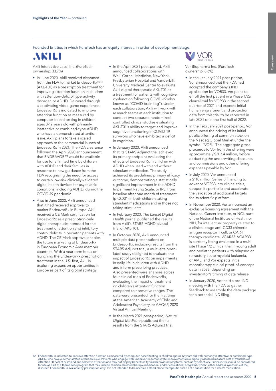 PureTech Health plc Annual report and accounts 2020 5 O ve rv ie w Highlights of the Year — continued Founded Entities in which PureTech has an equity interest, in order of development stage: Akili Interactive Labs, Inc. (PureTech ownership: 33.7%) • In June 2020, Akili received clearance from the FDA to market EndeavorRx™12 (AKL-T01) as a prescription treatment for improving attention function in children with attention-deficit/hyperactivity disorder, or ADHD. Delivered through a captivating video game experience, EndeavorRx is indicated to improve attention function as measured by computer-based testing in children ages 8-12 years old with primarily inattentive or combined-type ADHD, who have a demonstrated attention issue. Akili plans to take a scaled approach to the commercial launch of EndeavorRx in 2021. The FDA clearance followed the April 2020 announcement that ENDEAVOR™ would be available for use for a limited time by children with ADHD and their families in response to new guidance from the FDA recognizing the need for access to certain low-risk clinically-validated digital health devices for psychiatric conditions, including ADHD, during the COVID-19 pandemic. • Also in June 2020, Akili announced that it had received approval to market EndeavorRx in Europe. Akili received a CE Mark certification for EndeavorRx as a prescription-only digital therapeutic intended for the treatment of attention and inhibitory control deficits in pediatric patients with ADHD. The CE Mark approval enables the future marketing of EndeavorRx in European Economic Area member countries. With a near-term focus on launching the EndeavorRx prescription treatment in the U.S. first, Akili is exploring expansion opportunities in Europe as part of its global strategy. • In the April 2021 post-period, Akili announced collaborations with Weill Cornell Medicine, New York- Presbyterian Hospital and Vanderbilt University Medical Center to evaluate Akili digital therapeutic AKL-T01 as a treatment for patients with cognitive dysfunction following COVID-19 (also known as “COVID brain fog”). Under each collaboration, Akili will work with research teams at each institution to conduct two separate randomized, controlled clinical studies evaluating AKL-T01’s ability to target and improve cognitive functioning in COVID-19 survivors who have exhibited a deficit in cognition. • In January 2020, Akili announced that its STARS Adjunct trial achieved its primary endpoint evaluating the effects of EndeavorRx in children with ADHD when used with and without stimulant medication. The study achieved its predefined primary efficacy outcome, demonstrating a statistically significant improvement in the ADHD Impairment Rating Scale, or IRS, from baseline after one month of treatment (p<0.001) in both children taking stimulant medications and in those not taking stimulants. • In February 2020, The Lancet Digital Health journal published the results from Akili’s STARS-ADHD pivotal trial of AKL-T01. • In October 2020, Akili announced multiple data presentations on EndeavorRx, including results from the STARS Adjunct trial, a multi-site open- label study designed to evaluate the impact of EndeavorRx on impairments in daily life in children with ADHD and inform prescribing practices. Also presented were analyses across four clinical trials of EndeavorRx, evaluating the impact of treatment on children’s attention function compared to normative ranges. The data were presented for the first time at the American Academy of Child and Adolescent Psychiatry, or AACAP, 2020 Virtual Annual Meeting. • In the March 2021 post-period, Nature Digital Medicine published the full results from the STARS Adjunct trial. Vor Biopharma Inc. (PureTech ownership: 8.6%) • In the January 2021 post-period, Vor announced that the FDA had accepted the company’s IND application for VOR33. Vor plans to enroll the first patient in a Phase 1/2a clinical trial for VOR33 in the second quarter of 2021 and expects initial human engraftment and protection data from this trial to be reported in late 2021 or in the first half of 2022. • In the February 2021 post-period, Vor announced the pricing of its initial public offering of common stock on the Nasdaq Global Market under the symbol “VOR.” The aggregate gross proceeds to Vor from the offering were approximately $203.4 million, before deducting the underwriting discounts and commissions and other offering expenses payable by Vor. • In July 2020, Vor announced a $110 million Series B financing to advance VOR33 into clinical trials, deepen its portfolio and accelerate the validation of additional targets for its scientific platform. • In November 2020, Vor announced an exclusive licensing agreement with the National Cancer Institute, or NCI, part of the National Institutes of Health, or NIH, for intellectual property related to a clinical-stage anti-CD33 chimeric antigen receptor T cell, or CAR-T, therapy candidate, VCAR33. VCAR33 is currently being evaluated in a multi- site Phase 1/2 clinical trial in young adult and pediatric patients with relapsed or refractory acute myeloid leukemia, or AML, and Vor expects initial monotherapy clinical proof-of-concept data in 2022, depending on investigator’s timing of data release. • In January 2020, Vor held a pre-IND meeting with the FDA to gather feedback to assemble the data package for a potential IND filing. 12 EndeavorRx is indicated to improve attention function as measured by computer-based testing in children ages 8-12 years old with primarily inattentive or combined-type ADHD, who have a demonstrated attention issue. Patients who engage with EndeavorRx demonstrate improvements in a digitally assessed measure Test of Variables of Attention (TOVA) of sustained and selective attention and may not display benefits in typical behavioral symptoms, such as hyperactivity. EndeavorRx should be considered for use as part of a therapeutic p