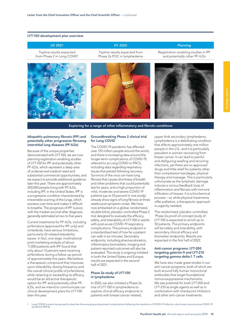 PureTech Health plc Annual report and accounts 2020 15 S tr a te g ic r e p o rt Letter from the Chief Innovation Officer and the Chief Scientific Officer — continued LYT-100 development plan overview H2 2021 H1 2022 Planning Topline results expected from Phase 2 in Long COVID1 Topline results expected from Phase 2a POC in lymphedema Registration-enabling studies in IPF and potentially other PF-ILDs Exploring for a range of other inflammatory and fibrotic conditions Idiopathic pulmonary fibrosis (IPF) and potentially other progressive fibrosing interstitial lung diseases (PF-ILDs) Because of the unique properties demonstrated with LYT-100, we are now planning registration-enabling studies of LYT-100 for IPF and potentially other PF-ILDs, which represent a deep area of underserved medical need and substantial commercial opportunities, and we expect to provide additional guidance later this year. There are approximately 200,000 people living with PF-ILDs, including IPF, in the United States. IPF is a progressive condition characterized by irreversible scarring of the lungs, which worsens over time and makes it difficult to breathe. The prognosis of IPF is poor, with the median survival after diagnosis generally estimated at two to five years. Current treatments for PF-ILDs, including pirfenidone (approved for IPF only) and nintedanib, have serious limitations, particularly GI-related tolerability issues. In fact, one large, multinational post-marketing analysis of about 11,000 patients with IPF found that only about 13 percent were receiving pirfenidone during a follow-up period of approximately five years. We believe a therapeutic compound that improves upon tolerability, dosing frequency and the overall clinical profile of pirfenidone, while retaining or exceeding its efficacy, would be an attractive therapeutic option for IPF and potentially other PF- ILDs, and we intend to communicate our clinical development plans for LYT-100 later this year. Groundbreaking Phase 2 clinical trial for Long COVID The COVID-19 pandemic has affected over 125 million people around the world, and there is increasing data around the longer-term complications of COVID-19, referred to as Long COVID or PACS, including data regarding respiratory issues that persist following recovery. Survivors of the virus can have lung fibrosis that causes shortness of breath and other problems that could potentially last for years, and a high proportion of mild, moderate and severe COVID-19 patients (up to 53 percent in one study) already show signs of lung fibrosis at three weeks post symptom onset. We have now embarked on a global, randomized, double-blind, placebo-controlled Phase 2 trial designed to evaluate the efficacy, safety, and tolerability of LYT-100 in adults with post-acute COVID-19 respiratory complications. The primary endpoint is a standardized test of how far a patient can walk in six minutes. Secondary endpoints, including pharmacokinetics, inflammatory biomarkers, imaging and patient-reported outcomes will also be evaluated. The study is ongoing initiated in both the United States and Europe; results are expected in the second half of 2021. Phase 2a study of LYT-100 in lymphedema In 2020, we also initiated a Phase 2a trial of LYT-100 in lymphedema to explore clinical efficacy endpoints in patients with breast-cancer related, upper limb secondary lymphedema. Lymphedema is a debilitating condition that affects approximately one million people in the U.S., and it is particularly prevalent in women recovering from breast cancer. It can lead to painful and disfiguring swelling and recurring infections, yet there are no approved drugs and little relief for patients other than compression bandages, physical therapy and massage. This is particularly unfortunate as the lymphatic damage induces a vicious feedback loop of inflammation and fibrosis with immune infiltration of tissues. It is a biochemical process – so while physical treatments offer palliation, a therapeutic approach is urgently needed. The randomized, placebo-controlled, Phase 2a proof-of-concept study of LYT-100 is expected to enroll up to 50 patients. The primary endpoints will be safety and tolerability, with secondary clinical efficacy and biomarker endpoints. Results are expected in the first half of 2022. Anti-cancer programs: LYT-200 targeting galectin-9 and LYT-210 targeting gamma delta-1 T cells We have also made great strides in our anti-cancer programs, both of which are built around fully human monoclonal antibodies that target foundational immunosuppressive mechanisms. We see potential for both LYT-200 and LYT-210 as single agents as well as in combination with checkpoint inhibitors and other anti-cancer treatments. 1 Long COVID is a term being used to describe the emerging and persistent complications following the resolution of COVID-19 infection, also known as post-acute COVID-19 syndrome (PACS).