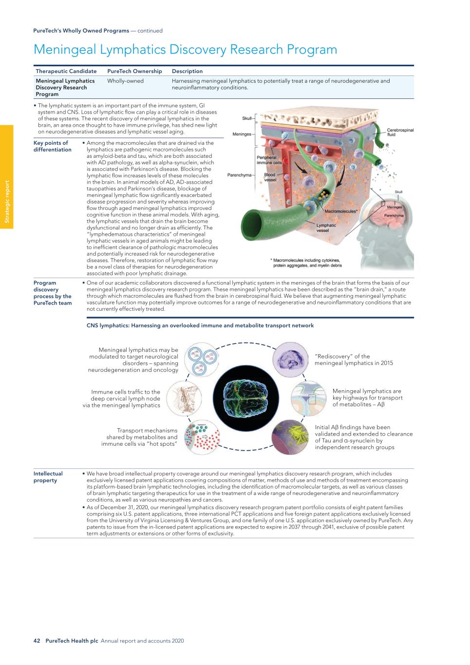 42 PureTech Health plc Annual report and accounts 2020 S tr a te g ic r e p o rt Meningeal Lymphatics Discovery Research Program Therapeutic Candidate PureTech Ownership Description Meningeal Lymphatics Discovery Research Program Wholly-owned Harnessing meningeal lymphatics to potentially treat a range of neurodegenerative and neuroinflammatory conditions. • The lymphatic system is an important part of the immune system, GI system and CNS. Loss of lymphatic flow can play a critical role in diseases of these systems. The recent discovery of meningeal lymphatics in the brain, an area once thought to have immune privilege, has shed new light on neurodegenerative diseases and lymphatic vessel aging. Key points of differentiation • Among the macromolecules that are drained via the lymphatics are pathogenic macromolecules such as amyloid-beta and tau, which are both associated with AD pathology, as well as alpha-synuclein, which is associated with Parkinson’s disease. Blocking the lymphatic flow increases levels of these molecules in the brain. In animal models of AD, AD-associated tauopathies and Parkinson’s disease, blockage of meningeal lymphatic flow significantly exacerbated disease progression and severity whereas improving flow through aged meningeal lymphatics improved cognitive function in these animal models. With aging, the lymphatic vessels that drain the brain become dysfunctional and no longer drain as efficiently. The “lymphedematous characteristics” of meningeal lymphatic vessels in aged animals might be leading to inefficient clearance of pathologic macromolecules and potentially increased risk for neurodegenerative diseases. Therefore, restoration of lymphatic flow may be a novel class of therapies for neurodegeneration associated with poor lymphatic drainage. Program discovery process by the PureTech team • One of our academic collaborators discovered a functional lymphatic system in the meninges of the brain that forms the basis of our meningeal lymphatics discovery research program. These meningeal lymphatics have been described as the “brain drain,” a route through which macromolecules are flushed from the brain in cerebrospinal fluid. We believe that augmenting meningeal lymphatic vasculature function may potentially improve outcomes for a range of neurodegenerative and neuroinflammatory conditions that are not currently effectively treated. CNS lymphatics: Harnessing an overlooked immune and metabolite transport network Meningeal lymphatics may be modulated to target neurological disorders – spanning neurodegeneration and oncology Immune cells trafc to the deep cervical lymph node via the meningeal lymphatics Transport mechanisms shared by metabolites and immune cells via “hot spots” “Rediscovery” of the meningeal lymphatics in 2015 Meningeal lymphatics are key highways for transport of metabolites – A Initial A ndings have been validated and extended to clearance of Tau and -synuclein by independent research groups Intellectual property • We have broad intellectual property coverage around our meningeal lymphatics discovery research program, which includes exclusively licensed patent applications covering compositions of matter, methods of use and methods of treatment encompassing its platform-based brain lymphatic technologies, including the identification of macromolecular targets, as well as various classes of brain lymphatic targeting therapeutics for use in the treatment of a wide range of neurodegenerative and neuroinflammatory conditions, as well as various neuropathies and cancers. • As of December 31, 2020, our meningeal lymphatics discovery research program patent portfolio consists of eight patent families comprising six U.S. patent applications, three international PCT applications and five foreign patent applications exclusively licensed from the University of Virginia Licensing & Ventures Group, and one family of one U.S. application exclusively owned by PureTech. Any patents to issue from the in-licensed patent applications are expected to expire in 2037 through 2041, exclusive of possible patent term adjustments or extensions or other forms of exclusivity. PureTech’s Wholly Owned Programs — continued
