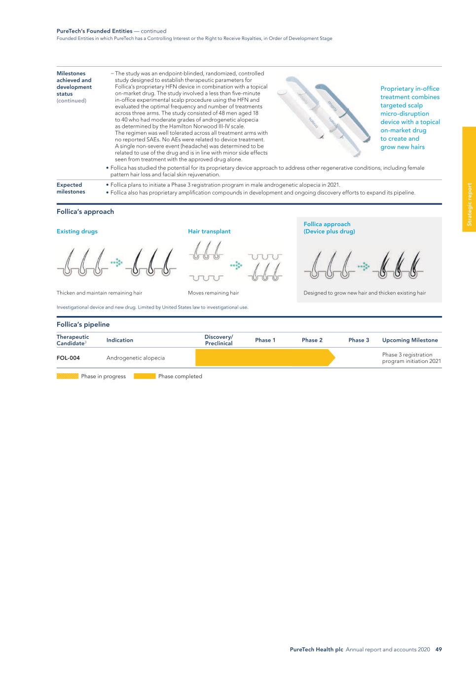 PureTech Health plc Annual report and accounts 2020 49 S tr a te g ic r e p o rt Milestones achieved and development status (continued) − The study was an endpoint-blinded, randomized, controlled study designed to establish therapeutic parameters for Follica’s proprietary HFN device in combination with a topical on-market drug. The study involved a less than five-minute in-office experimental scalp procedure using the HFN and evaluated the optimal frequency and number of treatments across three arms. The study consisted of 48 men aged 18 to 40 who had moderate grades of androgenetic alopecia as determined by the Hamilton Norwood III-IV scale. The regimen was well tolerated across all treatment arms with no reported SAEs. No AEs were related to device treatment. A single non-severe event (headache) was determined to be related to use of the drug and is in line with minor side effects seen from treatment with the approved drug alone. Proprietary in-office treatment combines targeted scalp micro-disruption device with a topical on-market drug to create and grow new hairs • Follica has studied the potential for its proprietary device approach to address other regenerative conditions, including female pattern hair loss and facial skin rejuvenation. Expected milestones • Follica plans to initiate a Phase 3 registration program in male androgenetic alopecia in 2021. • Follica also has proprietary amplification compounds in development and ongoing discovery efforts to expand its pipeline. Follica’s approach Existing drugs Hair transplant Follica approach (Device plus drug) Thicken and maintain remaining hair Moves remaining hair Designed to grow new hair and thicken existing hair Investigational device and new drug. Limited by United States law to investigational use. Follica’s pipeline Therapeutic Candidate3 Indication Discovery/ Preclinical Phase 1 Phase 2 Phase 3 Upcoming Milestone FOL-004 Androgenetic alopecia Phase 3 registration program initiation 2021 Phase in progress Phase completed PureTech’s Founded Entities — continued Founded Entities in which PureTech has a Controlling Interest or the Right to Receive Royalties, in Order of Development Stage