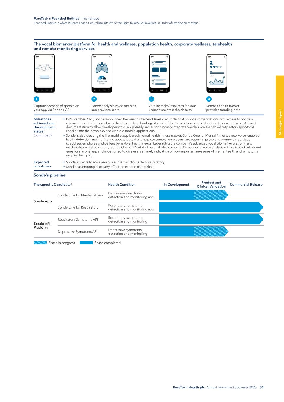 PureTech Health plc Annual report and accounts 2020 53 S tr a te g ic r e p o rt PureTech’s Founded Entities — continued Founded Entities in which PureTech has a Controlling Interest or the Right to Receive Royalties, in Order of Development Stage The vocal biomarker platform for health and wellness, population health, corporate wellness, telehealth and remote monitoring services 1 2 3 4 Capture seconds of speech on your app via Sonde’s API Sonde analyzes voice samples and provides score Outline tasks/resources for your users to maintain their health Sonde’s health tracker provides trending data Milestones achieved and development status (continued) • In November 2020, Sonde announced the launch of a new Developer Portal that provides organizations with access to Sonde’s advanced vocal biomarker-based health check technology. As part of the launch, Sonde has introduced a new self-serve API and documentation to allow developers to quickly, easily and autonomously integrate Sonde’s voice-enabled respiratory symptoms checker into their own iOS and Android mobile applications. • Sonde is also creating the first mobile app-based mental health fitness tracker, Sonde One for Mental Fitness, a new voice-enabled health detection and monitoring app, to potentially help consumers, employers and payors improve engagement in services to address employee and patient behavioral health needs. Leveraging the company’s advanced vocal biomarker platform and machine learning technology, Sonde One for Mental Fitness will also combine 30 seconds of voice analysis with validated self-report questions in one app and is designed to give users a timely indication of how important measures of mental health and symptoms may be changing. Expected milestones • Sonde expects to scale revenue and expand outside of respiratory. • Sonde has ongoing discovery efforts to expand its pipeline. Sonde’s pipeline Therapeutic Candidate3 Health Condition In Development Product and Clinical Validation Commercial Release Sonde App Sonde One for Mental Fitness Depressive symptoms detection and monitoring app Sonde One for Respiratory Respiratory symptoms detection and monitoring app Sonde API Platform Respiratory Symptoms API Respiratory symptoms detection and monitoring Depressive Symptoms API Depressive symptoms detection and monitoring Phase in progress Phase completed