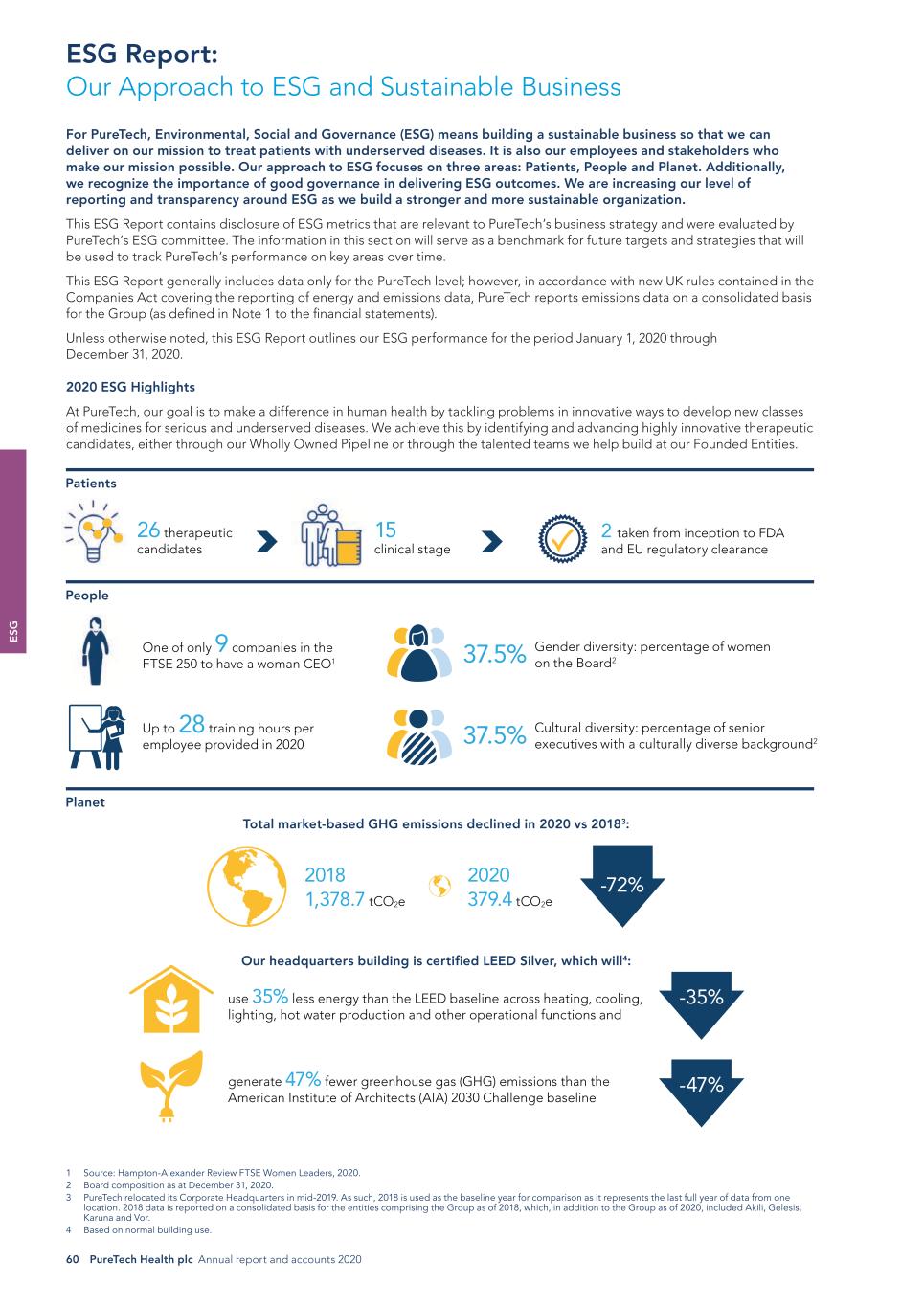 E S G 60 PureTech Health plc Annual report and accounts 2020 For PureTech, Environmental, Social and Governance (ESG) means building a sustainable business so that we can deliver on our mission to treat patients with underserved diseases. It is also our employees and stakeholders who make our mission possible. Our approach to ESG focuses on three areas: Patients, People and Planet. Additionally, we recognize the importance of good governance in delivering ESG outcomes. We are increasing our level of reporting and transparency around ESG as we build a stronger and more sustainable organization. This ESG Report contains disclosure of ESG metrics that are relevant to PureTech’s business strategy and were evaluated by PureTech’s ESG committee. The information in this section will serve as a benchmark for future targets and strategies that will be used to track PureTech’s performance on key areas over time. This ESG Report generally includes data only for the PureTech level; however, in accordance with new UK rules contained in the Companies Act covering the reporting of energy and emissions data, PureTech reports emissions data on a consolidated basis for the Group (as defined in Note 1 to the financial statements). Unless otherwise noted, this ESG Report outlines our ESG performance for the period January 1, 2020 through December 31, 2020. 2020 ESG Highlights At PureTech, our goal is to make a difference in human health by tackling problems in innovative ways to develop new classes of medicines for serious and underserved diseases. We achieve this by identifying and advancing highly innovative therapeutic candidates, either through our Wholly Owned Pipeline or through the talented teams we help build at our Founded Entities. ESG Report: Our Approach to ESG and Sustainable Business 1 Source: Hampton-Alexander Review FTSE Women Leaders, 2020. 2 Board composition as at December 31, 2020. 3 PureTech relocated its Corporate Headquarters in mid-2019. As such, 2018 is used as the baseline year for comparison as it represents the last full year of data from one location. 2018 data is reported on a consolidated basis for the entities comprising the Group as of 2018, which, in addition to the Group as of 2020, included Akili, Gelesis, Karuna and Vor. 4 Based on normal building use. Patients Our headquarters building is certified LEED Silver, which will4: Total market-based GHG emissions declined in 2020 vs 20183: -35% -47% One of only 9 companies in the FTSE 250 to have a woman CEO1 Up to 28 training hours per employee provided in 2020 26 therapeutic candidates 15 clinical stage use 35% less energy than the LEED baseline across heating, cooling, lighting, hot water production and other operational functions and generate 47% fewer greenhouse gas (GHG) emissions than the American Institute of Architects (AIA) 2030 Challenge baseline 2 taken from inception to FDA and EU regulatory clearance People Planet -72%2018 1,378.7 tCO2e 2020 379.4 tCO2e 37.5% 37.5% Gender diversity: percentage of women on the Board2 Cultural diversity: percentage of senior executives with a culturally diverse background2