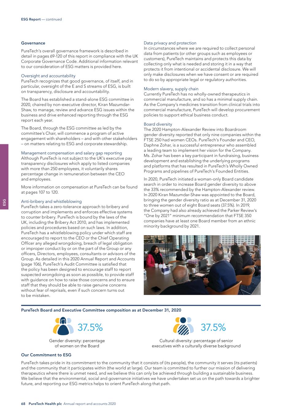 E S G 68 PureTech Health plc Annual report and accounts 2020 Governance PureTech’s overall governance framework is described in detail in pages 69-120 of this report in compliance with the UK Corporate Governance Code. Additional information relevant to our consideration of ESG matters is provided here. Oversight and accountability PureTech recognizes that good governance, of itself, and in particular, oversight of the E and S streams of ESG, is built on transparency, disclosure and accountability. The Board has established a stand-alone ESG committee in 2020, chaired by non-executive director, Kiran Mazumdar- Shaw, to manage, review and advance ESG issues within the business and drive enhanced reporting through the ESG report each year. The Board, through the ESG committee as led by the committee’s Chair, will commence a program of active engagement with shareholders – and with other stakeholders – on matters relating to ESG and corporate stewardship. Management compensation and salary gap reporting Although PureTech is not subject to the UK’s executive pay transparency disclosures which apply to listed companies with more than 250 employees, it voluntarily shares percentage change in remuneration between the CEO and employees. More information on compensation at PureTech can be found at pages 107 to 120. Anti-bribery and whistleblowing PureTech takes a zero-tolerance approach to bribery and corruption and implements and enforces effective systems to counter bribery. PureTech is bound by the laws of the UK, including the Bribery Act 2010, and has implemented policies and procedures based on such laws. In addition, PureTech has a whistleblowing policy under which staff are encouraged to report to the CEO or the Chief Operating Officer any alleged wrongdoing, breach of legal obligation or improper conduct by or on the part of the Group or any officers, Directors, employees, consultants or advisors of the Group. As detailed in this 2020 Annual Report and Accounts (page 106), PureTech’s Audit Committee is satisfied that the policy has been designed to encourage staff to report suspected wrongdoing as soon as possible, to provide staff with guidance on how to raise those concerns and to ensure staff that they should be able to raise genuine concerns without fear of reprisals, even if such concern turns out to be mistaken. Data privacy and protection In circumstances where we are required to collect personal data from patients (or other groups such as employees or customers), PureTech maintains and protects this data by collecting only what is needed and storing it in a way that protects it from intentional or accidental disclosure. We will only make disclosures when we have consent or are required to do so by appropriate legal or regulatory authorities. Modern slavery, supply chain Currently PureTech has no wholly-owned therapeutics in commercial manufacture, and so has a minimal supply chain. As the Company’s medicines transition from clinical trials into commercial manufacture, PureTech will develop procurement policies to support ethical business conduct. Board diversity The 2020 Hampton-Alexander Review into Boardroom gender diversity reported that only nine companies within the FTSE 250 had women CEOs. PureTech’s Founder and CEO, Daphne Zohar, is a successful entrepreneur who assembled a leading team to implement her vision for the Company. Ms. Zohar has been a key participant in fundraising, business development and establishing the underlying programs and platforms that has resulted in PureTech’s Wholly Owned Programs and pipelines of PureTech’s Founded Entities. In 2020, PureTech initiated a woman-only Board candidate search in order to increase Board gender diversity to above the 33% recommended by the Hampton-Alexander review. In 2020 Kiran Mazumdar-Shaw was appointed to the Board, bringing the gender diversity ratio as at December 31, 2020 to three women out of eight Board seats (37.5%). In 2019, the Company had also already achieved the Parker Review’s “One by 2021” minimum recommendation that FTSE 350 companies have at least one Board member from an ethnic minority background by 2021. PureTech Board and Executive Committee composition as at December 31, 2020 37.5% Gender diversity: percentage of women on the Board 37.5% Cultural diversity: percentage of senior executives with a culturally diverse background Our Commitment to ESG PureTech takes pride in its commitment to the community that it consists of (its people), the community it serves (its patients) and the community that it participates within (the world at large). Our team is committed to further our mission of delivering therapeutics where there is unmet need, and we believe this can only be achieved through building a sustainable business. We believe that the environmental, social and governance initiatives we have undertaken set us on the path towards a brighter future, and reporting our ESG metrics helps to orient PureTech along that path. ESG Report — continued