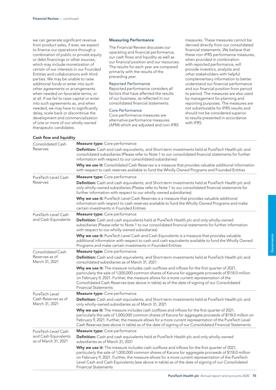 PureTech Health plc Annual report and accounts 2020 75 G o ve rn a n ce we can generate significant revenue from product sales, if ever, we expect to finance our operations through a combination of public or private equity or debt financings or other sources, which may include monetization of certain of our interests in our Founded Entities and collaborations with third parties. We may be unable to raise additional funds or enter into such other agreements or arrangements when needed on favorable terms, or at all. If we fail to raise capital or enter into such agreements as, and when needed, we may have to significantly delay, scale back or discontinue the development and commercialization of one or more of our wholly-owned therapeutic candidates. Measuring Performance The Financial Review discusses our operating and financial performance, our cash flows and liquidity as well as our financial position and our resources. The results for each year are compared primarily with the results of the preceding year. Reported Performance Reported performance considers all factors that have affected the results of our business, as reflected in our consolidated financial statements. Core Performance Core performance measures are alternative performance measures (APM) which are adjusted and non-IFRS measures. These measures cannot be derived directly from our consolidated financial statements. We believe that these non-IFRS performance measures, when provided in combination with reported performance, will provide investors, analysts and other stakeholders with helpful complementary information to better understand our financial performance and our financial position from period to period. The measures are also used by management for planning and reporting purposes. The measures are not substitutable for IFRS results and should not be considered superior to results presented in accordance with IFRS. Financial Review — continued Cash flow and liquidity Consolidated Cash Reserves Measure type: Core performance Definition: Cash and cash equivalents, and Short-term investments held at PureTech Health plc and consolidated subsidiaries (Please refer to Note 1 to our consolidated financial statements for further information with respect to our consolidated subsidiaries) Why we use it: Consolidated Cash Reserves is a measure that provides valuable additional information with respect to cash reserves available to fund the Wholly Owned Programs and Founded Entities PureTech Level Cash Reserves Measure type: Core performance Definition: Cash and cash equivalents, and Short-term investments held at PureTech Health plc and only wholly-owned subsidiaries (Please refer to Note 1 to our consolidated financial statements for further information with respect to our wholly-owned subsidiaries) Why we use it: PureTech Level Cash Reserves is a measure that provides valuable additional information with respect to cash reserves available to fund the Wholly Owned Programs and make certain investments in Founded Entities PureTech Level Cash and Cash Equivalents Measure type: Core performance Definition: Cash and cash equivalents held at PureTech Health plc and only wholly-owned subsidiaries (Please refer to Note 1 to our consolidated financial statements for further information with respect to our wholly-owned subsidiaries) Why we use it: PureTech Level Cash and Cash Equivalents is a measure that provides valuable additional information with respect to cash and cash equivalents available to fund the Wholly Owned Programs and make certain investments in Founded Entities Consolidated Cash Reserves as of March 31, 2021 Measure type: Core performance Definition: Cash and cash equivalents, and Short-term investments held at PureTech Health plc and consolidated subsidiaries as of March 31, 2021 Why we use it: The measure includes cash outflows and inflows for the first quarter of 2021, particularly the sale of 1,000,000 common shares of Karuna for aggregate proceeds of $118.0 million on February 9, 2021. Further, the measure allows for a more current representation of the Consolidated Cash Reserves (see above in table) as of the date of signing of our Consolidated Financial Statements PureTech Level Cash Reserves as of March 31, 2021 Measure type: Core performance Definition: Cash and cash equivalents, and Short-term investments held at PureTech Health plc and only wholly-owned subsidiaries as of March 31, 2021 Why we use it: The measure includes cash outflows and inflows for the first quarter of 2021, particularly the sale of 1,000,000 common shares of Karuna for aggregate proceeds of $118.0 million on February 9, 2021. Further, the measure allows for a more current representation of the PureTech Level Cash Reserves (see above in table) as of the date of signing of our Consolidated Financial Statements PureTech Level Cash and Cash Equivalents as of March 31, 2021 Measure type: Core performance Definition: Cash and cash equivalents held at PureTech Health plc and only wholly-owned subsidiaries as of March 31, 2021 Why we use it: The measure includes cash outflows and inflows for the first quarter of 2021, particularly the sale of 1,000,000 common shares of Karuna for aggregate proceeds of $118.0 million on February 9, 2021. Further, the measure allows for a more current representation of the PureTech Level Cash and Cash Equivalents (see above in table) as of the date of signing of our Consolidated Financial Statements
