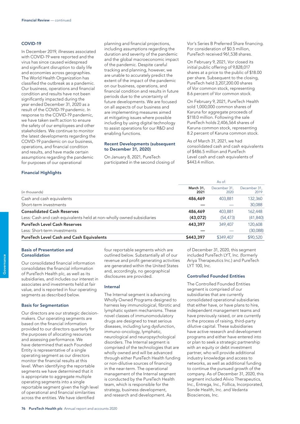 76 PureTech Health plc Annual report and accounts 2020 G o ve rn a n ce Financial Review — continued COVID-19 In December 2019, illnesses associated with COVID-19 were reported and the virus has since caused widespread and significant disruption to daily life and economies across geographies. The World Health Organization has classified the outbreak as a pandemic. Our business, operations and financial condition and results have not been significantly impacted during the year ended December 31, 2020 as a result of the COVID-19 pandemic. In response to the COVID-19 pandemic, we have taken swift action to ensure the safety of our employees and other stakeholders. We continue to monitor the latest developments regarding the COVID-19 pandemic on our business, operations, and financial condition and results, and have made certain assumptions regarding the pandemic for purposes of our operational planning and financial projections, including assumptions regarding the duration and severity of the pandemic and the global macroeconomic impact of the pandemic. Despite careful tracking and planning, however, we are unable to accurately predict the extent of the impact of the pandemic on our business, operations, and financial condition and results in future periods due to the uncertainty of future developments. We are focused on all aspects of our business and are implementing measures aimed at mitigating issues where possible including by using digital technology to assist operations for our R&D and enabling functions. Recent Developments (subsequent to December 31, 2020) On January 8, 2021, PureTech participated in the second closing of Vor’s Series B Preferred Share financing. For consideration of $0.5 million, PureTech received 961,538 shares. On February 9, 2021, Vor closed its initial public offering of 9,828,017 shares at a price to the public of $18.00 per share. Subsequent to the closing, PureTech held 3,207,200.00 shares of Vor common stock, representing 8.6 percent of Vor common stock. On February 9, 2021, PureTech Health sold 1,000,000 common shares of Karuna for aggregate proceeds of $118.0 million. Following the sale PureTech holds 2,406,564 shares of Karuna common stock, representing 8.2 percent of Karuna common stock. As of March 31, 2021, we had consolidated cash and cash equivalents of $486.5 million and PureTech Level cash and cash equivalents of $443.4 million. Basis of Presentation and Consolidation Our consolidated financial information consolidates the financial information of PureTech Health plc, as well as its subsidiaries, and includes our interest in associates and investments held at fair value, and is reported in four operating segments as described below. Basis for Segmentation Our directors are our strategic decision- makers. Our operating segments are based on the financial information provided to our directors quarterly for the purposes of allocating resources and assessing performance. We have determined that each Founded Entity is representative of a single operating segment as our directors monitor the financial results at this level. When identifying the reportable segments we have determined that it is appropriate to aggregate multiple operating segments into a single reportable segment given the high level of operational and financial similarities across the entities. We have identified four reportable segments which are outlined below. Substantially all of our revenue and profit generating activities are generated within the United States and, accordingly, no geographical disclosures are provided. Internal The Internal segment is advancing Wholly Owned Programs designed to harness key immunological, fibrotic and lymphatic system mechanisms. These novel classes of immunomodulatory drugs are designed to treat serious diseases, including lung dysfunction, immuno-oncology, lymphatic, neurological and neuropsychological disorders. The Internal segment is comprised of the technologies that are wholly owned and will be advanced through either PureTech Health funding or non-dilutive sources of financing in the near-term. The operational management of the Internal segment is conducted by the PureTech Health team, which is responsible for the strategy, business development, and research and development. As of December 31, 2020, this segment included PureTech LYT, Inc. (formerly Ariya Therapeutics Inc.) and PureTech LYT 100, Inc. Controlled Founded Entities The Controlled Founded Entities segment is comprised of our subsidiaries that are currently consolidated operational subsidiaries that either have, or have plans to hire, independent management teams and have previously raised, or are currently in the process of raising, third-party dilutive capital. These subsidiaries have active research and development programs and either have entered into or plan to seek a strategic partnership with an equity or debt investment partner, who will provide additional industry knowledge and access to networks, as well as additional funding to continue the pursued growth of the company. As of December 31, 2020, this segment included Alivio Therapeutics, Inc., Entrega, Inc., Follica, Incorporated, Sonde Health, Inc. and Vedanta Biosciences, Inc. Financial Highlights As of: (in thousands) March 31, 2021 December 31, 2020 December 31, 2019 Cash and cash equivalents 486,469 403,881 132,360 Short-term investments — — 30,088 Consolidated Cash Reserves 486,469 403,881 162,448 Less: Cash and cash equivalents held at non-wholly owned subsidiaries (43,072) (54,473) (41,840) PureTech Level Cash Reserves 443,397 349,407 120,608 Less: Short-term investments — — (30,088) PureTech Level Cash and Cash Equivalents $443,397 $349,407 $90,520