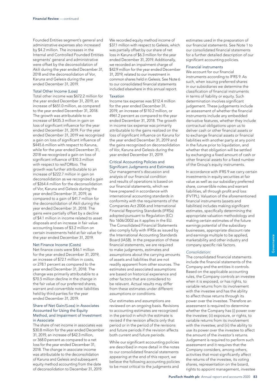 PureTech Health plc Annual report and accounts 2020 83 G o ve rn a n ce Founded Entities segment’s general and administrative expenses also increased by $4.2 million. The increases in the Internal and Controlled Founded Entities segments’ general and administrative were offset by the deconsolidation of Akili during the year ended December 31, 2018 and the deconsolidation of Vor, Karuna and Gelesis during the year ended December 31, 2019. Total Other Income (Loss) Total other income was $672.2 million for the year ended December 31, 2019, an increase of $651.0 million, as compared to the year ended December 31, 2018. The growth was attributable to an increase of $435.3 million in gain on loss of significant influence for the year ended December 31, 2019. For the year ended December 31, 2019 we recognized a gain on loss of significant influence of $445.6 million with respect to Karuna, while for the year ended December 31, 2018 we recognized a gain on loss of significant influence of $10.3 million with respect to resTORbio. The growth was further attributable to an increase of $222.7 million in gain on deconsolidation as we recognized a gain of $264.4 million for the deconsolidation of Vor, Karuna and Gelesis during the year ended December 31, 2019, as compared to a gain of $41.7 million for the deconsolidation of Akili during the year ended December 31, 2018. The gains were partially offset by a decline of $4.1 million in income related to asset disposals and an increase in fair value accounting losses of $3.2 million on certain investments held at fair value for the year ended December 31, 2019. Net Finance Income (Costs) Net finance costs were $46.1 million for the year ended December 31, 2019, an increase of $72.1 million in costs, or 278.1 percent as compared to the year ended December 31, 2018. The change was primarily attributable to a $70.5 million decline in the change in the fair value of our preferred shares, warrant and convertible note liabilities held by third parties for the year ended December 31, 2019. Share of Net Gain/(Loss) in Associates Accounted for Using the Equity Method, and Impairment of Investment in Associate The share of net income in associates was $30.8 million for the year ended December 31, 2019, an increase of $42.3 million, or 368.0 percent as compared to a net loss for the year ended December 31, 2018. The change in associate income was attributable to the deconsolidation of Karuna and Gelesis and subsequent equity method accounting from the date of deconsolidation to December 31, 2019. We recorded equity method income of $37.1 million with respect to Gelesis, which was partially offset by our share of net loss in Karuna of $6.3 million for the year ended December 31, 2019. Additionally, we recorded an impairment charge of $42.9 million for the year ended December 31, 2019, related to our investment in common shares held in Gelesis. See Note 6 to our consolidated financial statements included elsewhere in this annual report. Taxation Income tax expense was $112.4 million for the year ended December 31, 2019, an increase of $110.2 million, or 4961.2 percent as compared to the year ended December 31, 2018. The growth in income tax expense was primarily attributable to the gains realized on the loss of significant influence on Karuna for the year ended December 31, 2019 and the gains recognized on deconsolidation of Vor, Karuna and Gelesis during the year ended December 31, 2019. Critical Accounting Policies and Significant Judgments and Estimates Our management’s discussion and analysis of our financial condition and results of operations is based on our financial statements, which we have prepared in accordance with international accounting standards in conformity with the requirements of the Companies Act 2006 and International Financial Reporting Standards (IFRSs) adopted pursuant to Regulation (EC) No 1606/2002 as it applies in the EU. The Consolidated Financial Statements also comply fully with IFRSs as issued by the International Accounting Standards Board (IASB). In the preparation of these financial statements, we are required to make judgments, estimates and assumptions about the carrying amounts of assets and liabilities that are not readily apparent from other sources. The estimates and associated assumptions are based on historical experience and other factors that are considered to be relevant. Actual results may differ from these estimates under different assumptions or conditions. Our estimates and assumptions are reviewed on an ongoing basis. Revisions to accounting estimates are recognized in the period in which the estimate is revised if the revision affects only that period or in the period of the revisions and future periods if the revision affects both current and future periods. While our significant accounting policies are described in more detail in the notes to our consolidated financial statements appearing at the end of this report, we believe the following accounting policies to be most critical to the judgments and estimates used in the preparation of our financial statements. See Note 1 to our consolidated financial statements for a further detailed description of our significant accounting policies. Financial instruments We account for our financial instruments according to IFRS 9. As such, when issuing preferred shares in our subsidiaries we determine the classification of financial instruments in terms of liability or equity. Such determination involves significant judgement. These judgements include an assessment of whether the financial instruments include any embedded derivative features, whether they include contractual obligations upon us to deliver cash or other financial assets or to exchange financial assets or financial liabilities with another party at any point in the future prior to liquidation, and whether that obligation will be settled by exchanging a fixed amount of cash or other financial assets for a