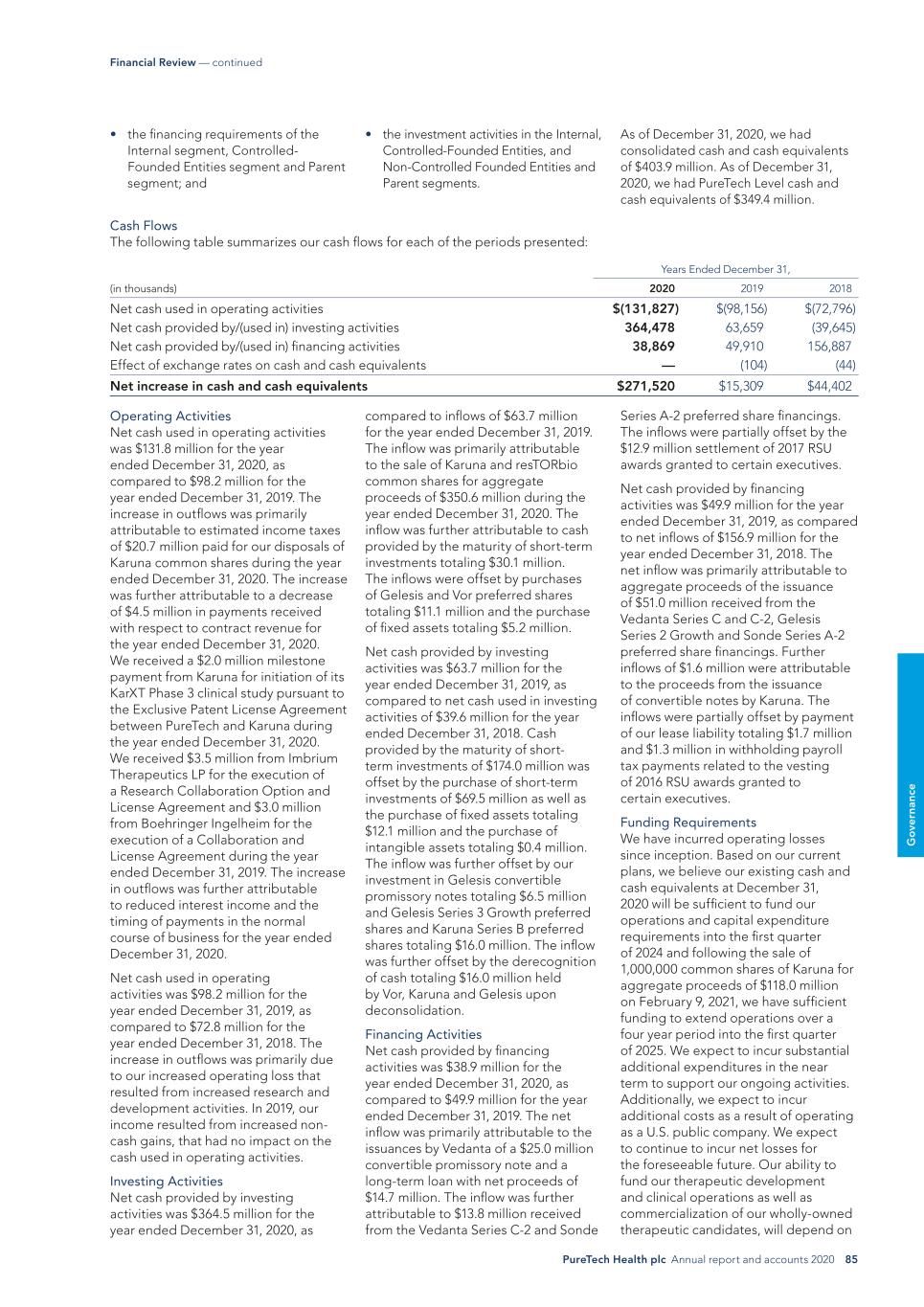 PureTech Health plc Annual report and accounts 2020 85 G o ve rn a n ce • the financing requirements of the Internal segment, Controlled- Founded Entities segment and Parent segment; and • the investment activities in the Internal, Controlled-Founded Entities, and Non-Controlled Founded Entities and Parent segments. As of December 31, 2020, we had consolidated cash and cash equivalents of $403.9 million. As of December 31, 2020, we had PureTech Level cash and cash equivalents of $349.4 million. Financial Review — continued Cash Flows The following table summarizes our cash flows for each of the periods presented: Years Ended December 31, (in thousands) 2020 2019 2018 Net cash used in operating activities $(131,827) $(98,156) $(72,796) Net cash provided by/(used in) investing activities 364,478 63,659 (39,645) Net cash provided by/(used in) financing activities 38,869 49,910 156,887 Effect of exchange rates on cash and cash equivalents — (104) (44) Net increase in cash and cash equivalents $271,520 $15,309 $44,402 Operating Activities Net cash used in operating activities was $131.8 million for the year ended December 31, 2020, as compared to $98.2 million for the year ended December 31, 2019. The increase in outflows was primarily attributable to estimated income taxes of $20.7 million paid for our disposals of Karuna common shares during the year ended December 31, 2020. The increase was further attributable to a decrease of $4.5 million in payments received with respect to contract revenue for the year ended December 31, 2020. We received a $2.0 million milestone payment from Karuna for initiation of its KarXT Phase 3 clinical study pursuant to the Exclusive Patent License Agreement between PureTech and Karuna during the year ended December 31, 2020. We received $3.5 million from Imbrium Therapeutics LP for the execution of a Research Collaboration Option and License Agreement and $3.0 million from Boehringer Ingelheim for the execution of a Collaboration and License Agreement during the year ended December 31, 2019. The increase in outflows was further attributable to reduced interest income and the timing of payments in the normal course of business for the year ended December 31, 2020. Net cash used in operating activities was $98.2 million for the year ended December 31, 2019, as compared to $72.8 million for the year ended December 31, 2018. The increase in outflows was primarily due to our increased operating loss that resulted from increased research and development activities. In 2019, our income resulted from increased non- cash gains, that had no impact on the cash used in operating activities. Investing Activities Net cash provided by investing activities was $364.5 million for the year ended December 31, 2020, as compared to inflows of $63.7 million for the year ended December 31, 2019. The inflow was primarily attributable to the sale of Karuna and resTORbio common shares for aggregate proceeds of $350.6 million during the year ended December 31, 2020. The inflow was further attributable to cash provided by the maturity of short-term investments totaling $30.1 million. The inflows were offset by purchases of Gelesis and Vor preferred shares totaling $11.1 million and the purchase of fixed assets totaling $5.2 million. Net cash provided by investing activities was $63.7 million for the year ended December 31, 2019, as compared to net cash used in investing activities of $39.6 million for the year ended December 31, 2018. Cash provided by the maturity of short- term investments of $174.0 million was offset by the purchase of short-term investments of $69.5 million as well as the purchase of fixed assets totaling $12.1 million and the purchase of intangible assets totaling $0.4 million. The inflow was further offset by our investment in Gelesis convertible promissory notes totaling $6.5 million and Gelesis Series 3 Growth preferred shares and Karuna Series B preferred shares totaling $16.0 million. The inflow was further offset by the derecognition of cash totaling $16.0 million held by Vor, Karuna and Gelesis upon deconsolidation. Financing Activities Net cash provided by financing activities was $38.9 million for the year ended December 31, 2020, as compared to $49.9 million for the year ended December 31, 2019. The net inflow was primarily attributable to the issuances by Vedanta of a $25.0 million convertible promissory note and a long-term loan with net proceeds of $14.7 million. The inflow was further attributable to $13.8 million received from the Vedanta Series C-2 and Sonde Series A-2 preferred share financings. The inflows were partially offset by the $12.9 million settlement of 2017 RSU awards granted to certain executives. Net cash provided by financing activities was $49.9 million for the year ended December 31, 2019, as compared to net inflows of $156.9 million for the year ended December 31, 2018. The net inflow was primarily attributable to aggregate proceeds of the issuance of $51.0 million received from the Vedanta Series C and C-2, Gelesis Series 2 Growth and Sonde Series A-2 preferred share financings. Further inflows of $1.6 million were attributable to the proceeds from the issuance of convertible notes by Karuna. The inflows were partially offset by payment of our lease liability totaling $1.7 million and $1.3 million in withholding payroll tax payments related to the vesting of 2016 RSU awards granted to certain executives. Funding Requirements We have incurred operating losses since inception. Based on our current plans, we believe our existing cash and cash equivalents at December 31, 2020 will be sufficient to fund our operations and capital expenditure requirements into the first quarter of 2024 and following the sale of 1,000,000 common shares of Karuna for aggregate proceeds of $118.0 million on February 9, 2021, we have sufficient funding to extend operations over a four year period into the first quarter of 2025. We expect to incur subs