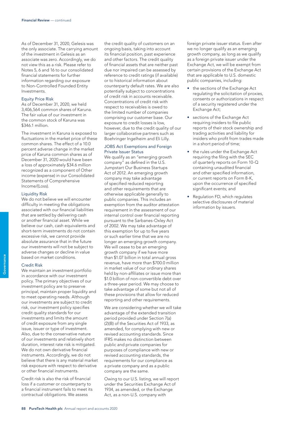 88 PureTech Health plc Annual report and accounts 2020 G o ve rn a n ce As of December 31, 2020, Gelesis was the only associate. The carrying amount of the investment in Gelesis as an associate was zero. Accordingly, we do not view this as a risk. Please refer to Notes 5, 6 and 16 to our consolidated financial statements for further information regarding our exposure to Non-Controlled Founded Entity Investments. Equity Price Risk As of December 31, 2020, we held 3,406,564 common shares of Karuna. The fair value of our investment in the common stock of Karuna was $346.1 million. The investment in Karuna is exposed to fluctuations in the market price of these common shares. The effect of a 10.0 percent adverse change in the market price of Karuna common shares as of December 31, 2020 would have been a loss of approximately $34.6 million recognized as a component of Other income (expense) in our Consolidated Statements of Comprehensive Income/(Loss). Liquidity Risk We do not believe we will encounter difficulty in meeting the obligations associated with our financial liabilities that are settled by delivering cash or another financial asset. While we believe our cash, cash equivalents and short-term investments do not contain excessive risk, we cannot provide absolute assurance that in the future our investments will not be subject to adverse changes or decline in value based on market conditions. Credit Risk We maintain an investment portfolio in accordance with our investment policy. The primary objectives of our investment policy are to preserve principal, maintain proper liquidity and to meet operating needs. Although our investments are subject to credit risk, our investment policy specifies credit quality standards for our investments and limits the amount of credit exposure from any single issue, issuer or type of investment. Also, due to the conservative nature of our investments and relatively short duration, interest rate risk is mitigated. We do not own derivative financial instruments. Accordingly, we do not believe that there is any material market risk exposure with respect to derivative or other financial instruments. Credit risk is also the risk of financial loss if a customer or counterparty to a financial instrument fails to meet its contractual obligations. We assess the credit quality of customers on an ongoing basis, taking into account its financial position, past experience and other factors. The credit quality of financial assets that are neither past due nor impaired can be assessed by reference to credit ratings (if available) or to historical information about counterparty default rates. We are also potentially subject to concentrations of credit risk in accounts receivable. Concentrations of credit risk with respect to receivables is owed to the limited number of companies comprising our customer base. Our exposure to credit losses is low, however, due to the credit quality of our larger collaborative partners such as Boehringer Ingelheim and Eli Lilly. JOBS Act Exemptions and Foreign Private Issuer Status We qualify as an “emerging growth company” as defined in the U.S. Jumpstart Our Business Startups Act of 2012. An emerging growth company may take advantage of specified reduced reporting and other requirements that are otherwise applicable generally to public companies. This includes an exemption from the auditor attestation requirement in the assessment of our internal control over financial reporting pursuant to the Sarbanes-Oxley Act of 2002. We may take advantage of this exemption for up to five years or such earlier time that we are no longer an emerging growth company. We will cease to be an emerging growth company if we have more than $1.07 billion in total annual gross revenue, have more than $700.0 million in market value of our ordinary shares held by non-affiliates or issue more than $1.0 billion of non-convertible debt over a three-year period. We may choose to take advantage of some but not all of these provisions that allow for reduced reporting and other requirements. We are considering whether we will take advantage of the extended transition period provided under Section 7(a) (2)(B) of the Securities Act of 1933, as amended, for complying with new or revised accounting standards. Since IFRS makes no distinction between public and private companies for purposes of compliance with new or revised accounting standards, the requirements for our compliance as a private company and as a public company are the same. Owing to our U.S. listing, we will report under the Securities Exchange Act of 1934, as amended, or the Exchange Act, as a non-U.S. company with foreign private issuer status. Even after we no longer qualify as an emerging growth company, as long as we qualify as a foreign private issuer under the Exchange Act, we will be exempt from certain provisions of the Exchange Act that are applicable to U.S. domestic public companies, including: • the sections of the Exchange Act regulating the solicitation of proxies, consents or authorizations in respect of a security registered under the Exchange Act; • sections of the Exchange Act requiring insiders to file public reports of their stock ownership and trading activities and liability for insiders who profit from trades made in a short period of time; • the rules under the Exchange Act requiring the filing with the SEC of quarterly reports on Form 10-Q containing unaudited financial and other specified information, or current reports on Form 8-K, upon the occurrence of specified significant events; and • Regulation FD, which regulates selective disclosures of material information by issuers. Financial Review — continued