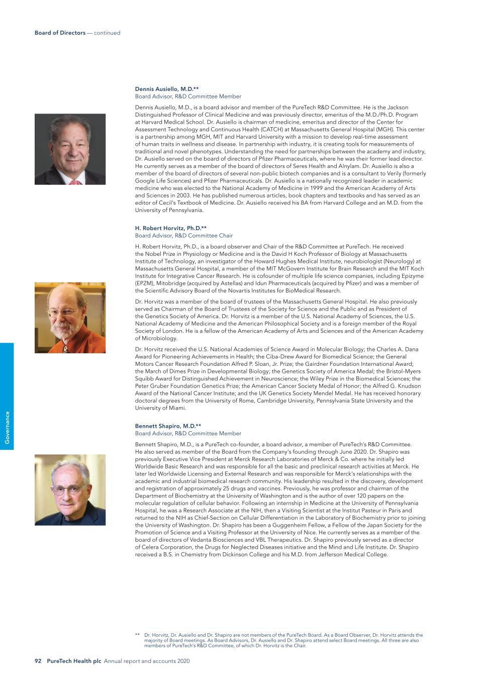 92 PureTech Health plc Annual report and accounts 2020 G o ve rn a n ce Dennis Ausiello, M.D.** Board Advisor, R&D Committee Member Dennis Ausiello, M.D., is a board advisor and member of the PureTech R&D Committee. He is the Jackson Distinguished Professor of Clinical Medicine and was previously director, emeritus of the M.D./Ph.D. Program at Harvard Medical School. Dr. Ausiello is chairman of medicine, emeritus and director of the Center for Assessment Technology and Continuous Health (CATCH) at Massachusetts General Hospital (MGH). This center is a partnership among MGH, MIT and Harvard University with a mission to develop real-time assessment of human traits in wellness and disease. In partnership with industry, it is creating tools for measurements of traditional and novel phenotypes. Understanding the need for partnerships between the academy and industry, Dr. Ausiello served on the board of directors of Pfizer Pharmaceuticals, where he was their former lead director. He currently serves as a member of the board of directors of Seres Health and Alnylam. Dr. Ausiello is also a member of the board of directors of several non-public biotech companies and is a consultant to Verily (formerly Google Life Sciences) and Pfizer Pharmaceuticals. Dr. Ausiello is a nationally recognized leader in academic medicine who was elected to the National Academy of Medicine in 1999 and the American Academy of Arts and Sciences in 2003. He has published numerous articles, book chapters and textbooks and has served as an editor of Cecil’s Textbook of Medicine. Dr. Ausiello received his BA from Harvard College and an M.D. from the University of Pennsylvania. H. Robert Horvitz, Ph.D.** Board Advisor, R&D Committee Chair H. Robert Horvitz, Ph.D., is a board observer and Chair of the R&D Committee at PureTech. He received the Nobel Prize in Physiology or Medicine and is the David H Koch Professor of Biology at Massachusetts Institute of Technology, an investigator of the Howard Hughes Medical Institute, neurobiologist (Neurology) at Massachusetts General Hospital, a member of the MIT McGovern Institute for Brain Research and the MIT Koch Institute for Integrative Cancer Research. He is cofounder of multiple life science companies, including Epizyme (EPZM), Mitobridge (acquired by Astellas) and Idun Pharmaceuticals (acquired by Pfizer) and was a member of the Scientific Advisory Board of the Novartis Institutes for BioMedical Research. Dr. Horvitz was a member of the board of trustees of the Massachusetts General Hospital. He also previously served as Chairman of the Board of Trustees of the Society for Science and the Public and as President of the Genetics Society of America. Dr. Horvitz is a member of the U.S. National Academy of Sciences, the U.S. National Academy of Medicine and the American Philosophical Society and is a foreign member of the Royal Society of London. He is a fellow of the American Academy of Arts and Sciences and of the American Academy of Microbiology. Dr. Horvitz received the U.S. National Academies of Science Award in Molecular Biology; the Charles A. Dana Award for Pioneering Achievements in Health; the Ciba-Drew Award for Biomedical Science; the General Motors Cancer Research Foundation Alfred P. Sloan, Jr. Prize; the Gairdner Foundation International Award; the March of Dimes Prize in Developmental Biology; the Genetics Society of America Medal; the Bristol-Myers Squibb Award for Distinguished Achievement in Neuroscience; the Wiley Prize in the Biomedical Sciences; the Peter Gruber Foundation Genetics Prize; the American Cancer Society Medal of Honor; the Alfred G. Knudson Award of the National Cancer Institute; and the UK Genetics Society Mendel Medal. He has received honorary doctoral degrees from the University of Rome, Cambridge University, Pennsylvania State University and the University of Miami. Bennett Shapiro, M.D.** Board Advisor, R&D Committee Member Bennett Shapiro, M.D., is a PureTech co-founder, a board advisor, a member of PureTech’s R&D Committee. He also served as member of the Board from the Company’s founding through June 2020. Dr. Shapiro was previously Executive Vice President at Merck Research Laboratories of Merck & Co. where he initially led Worldwide Basic Research and was responsible for all the basic and preclinical research activities at Merck. He later led Worldwide Licensing and External Research and was responsible for Merck’s relationships with the academic and industrial biomedical research community. His leadership resulted in the discovery, development and registration of approximately 25 drugs and vaccines. Previously, he was professor and chairman of the Department of Biochemistry at the University of Washington and is the author of over 120 papers on the molecular regulation of cellular behavior. Following an internship in Medicine at the University of Pennsylvania Hospital, he was a Research Associate at the NIH, then a Visiting Scientist at the Institut Pasteur in Paris and returned to the NIH as Chief-Section on Cellular Differentiation in the Laboratory of Biochemistry prior to joining the University of Washington. Dr. Shapiro has been a Guggenheim Fellow, a Fellow of the Japan Society for the Promotion of Science and a Visiting Professor at the University of Nice. He currently serves as a member of the board of directors of Vedanta Biosciences and VBL Therapeutics. Dr. Shapiro previously served as a director of Celera Corporation, the Drugs for Neglected Diseases initiative and the Mind and Life Institute. Dr. Shapiro received a B.S. in Chemistry from Dickinson College and his M.D. from Jefferson Medical College. Board of Directors — continued ** Dr. Horvitz, Dr. Ausiello and Dr. Shapiro are not members of the PureTech Board. As a Board Observer, Dr. Horvitz attends the majority of Board meetings. As Board Advisors, Dr. Ausiello and Dr. Shapiro attend select Board meetings. All three are also members of PureTech’s R&D Committe