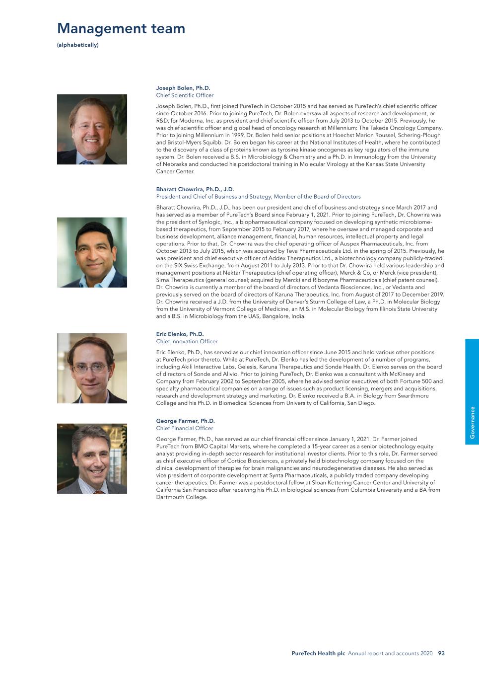 PureTech Health plc Annual report and accounts 2020 93 G o ve rn a n ce Joseph Bolen, Ph.D. Chief Scientific Officer Joseph Bolen, Ph.D., first joined PureTech in October 2015 and has served as PureTech’s chief scientific officer since October 2016. Prior to joining PureTech, Dr. Bolen oversaw all aspects of research and development, or R&D, for Moderna, Inc. as president and chief scientific officer from July 2013 to October 2015. Previously, he was chief scientific officer and global head of oncology research at Millennium: The Takeda Oncology Company. Prior to joining Millennium in 1999, Dr. Bolen held senior positions at Hoechst Marion Roussel, Schering-Plough and Bristol-Myers Squibb. Dr. Bolen began his career at the National Institutes of Health, where he contributed to the discovery of a class of proteins known as tyrosine kinase oncogenes as key regulators of the immune system. Dr. Bolen received a B.S. in Microbiology & Chemistry and a Ph.D. in Immunology from the University of Nebraska and conducted his postdoctoral training in Molecular Virology at the Kansas State University Cancer Center. Bharatt Chowrira, Ph.D., J.D. President and Chief of Business and Strategy, Member of the Board of Directors Bharatt Chowrira, Ph.D., J.D., has been our president and chief of business and strategy since March 2017 and has served as a member of PureTech’s Board since February 1, 2021. Prior to joining PureTech, Dr. Chowrira was the president of Synlogic, Inc., a biopharmaceutical company focused on developing synthetic microbiome- based therapeutics, from September 2015 to February 2017, where he oversaw and managed corporate and business development, alliance management, financial, human resources, intellectual property and legal operations. Prior to that, Dr. Chowrira was the chief operating officer of Auspex Pharmaceuticals, Inc. from October 2013 to July 2015, which was acquired by Teva Pharmaceuticals Ltd. in the spring of 2015. Previously, he was president and chief executive officer of Addex Therapeutics Ltd., a biotechnology company publicly-traded on the SIX Swiss Exchange, from August 2011 to July 2013. Prior to that Dr. Chowrira held various leadership and management positions at Nektar Therapeutics (chief operating officer), Merck & Co, or Merck (vice president), Sirna Therapeutics (general counsel; acquired by Merck) and Ribozyme Pharmaceuticals (chief patent counsel). Dr. Chowrira is currently a member of the board of directors of Vedanta Biosciences, Inc., or Vedanta and previously served on the board of directors of Karuna Therapeutics, Inc. from August of 2017 to December 2019. Dr. Chowrira received a J.D. from the University of Denver’s Sturm College of Law, a Ph.D. in Molecular Biology from the University of Vermont College of Medicine, an M.S. in Molecular Biology from Illinois State University and a B.S. in Microbiology from the UAS, Bangalore, India. Eric Elenko, Ph.D. Chief Innovation Officer Eric Elenko, Ph.D., has served as our chief innovation officer since June 2015 and held various other positions at PureTech prior thereto. While at PureTech, Dr. Elenko has led the development of a number of programs, including Akili Interactive Labs, Gelesis, Karuna Therapeutics and Sonde Health. Dr. Elenko serves on the board of directors of Sonde and Alivio. Prior to joining PureTech, Dr. Elenko was a consultant with McKinsey and Company from February 2002 to September 2005, where he advised senior executives of both Fortune 500 and specialty pharmaceutical companies on a range of issues such as product licensing, mergers and acquisitions, research and development strategy and marketing. Dr. Elenko received a B.A. in Biology from Swarthmore College and his Ph.D. in Biomedical Sciences from University of California, San Diego. George Farmer, Ph.D. Chief Financial Officer George Farmer, Ph.D., has served as our chief financial officer since January 1, 2021. Dr. Farmer joined PureTech from BMO Capital Markets, where he completed a 15-year career as a senior biotechnology equity analyst providing in-depth sector research for institutional investor clients. Prior to this role, Dr. Farmer served as chief executive officer of Cortice Biosciences, a privately held biotechnology company focused on the clinical development of therapies for brain malignancies and neurodegenerative diseases. He also served as vice president of corporate development at Synta Pharmaceuticals, a publicly traded company developing cancer therapeutics. Dr. Farmer was a postdoctoral fellow at Sloan Kettering Cancer Center and University of California San Francisco after receiving his Ph.D. in biological sciences from Columbia University and a BA from Dartmouth College. Management team (alphabetically)