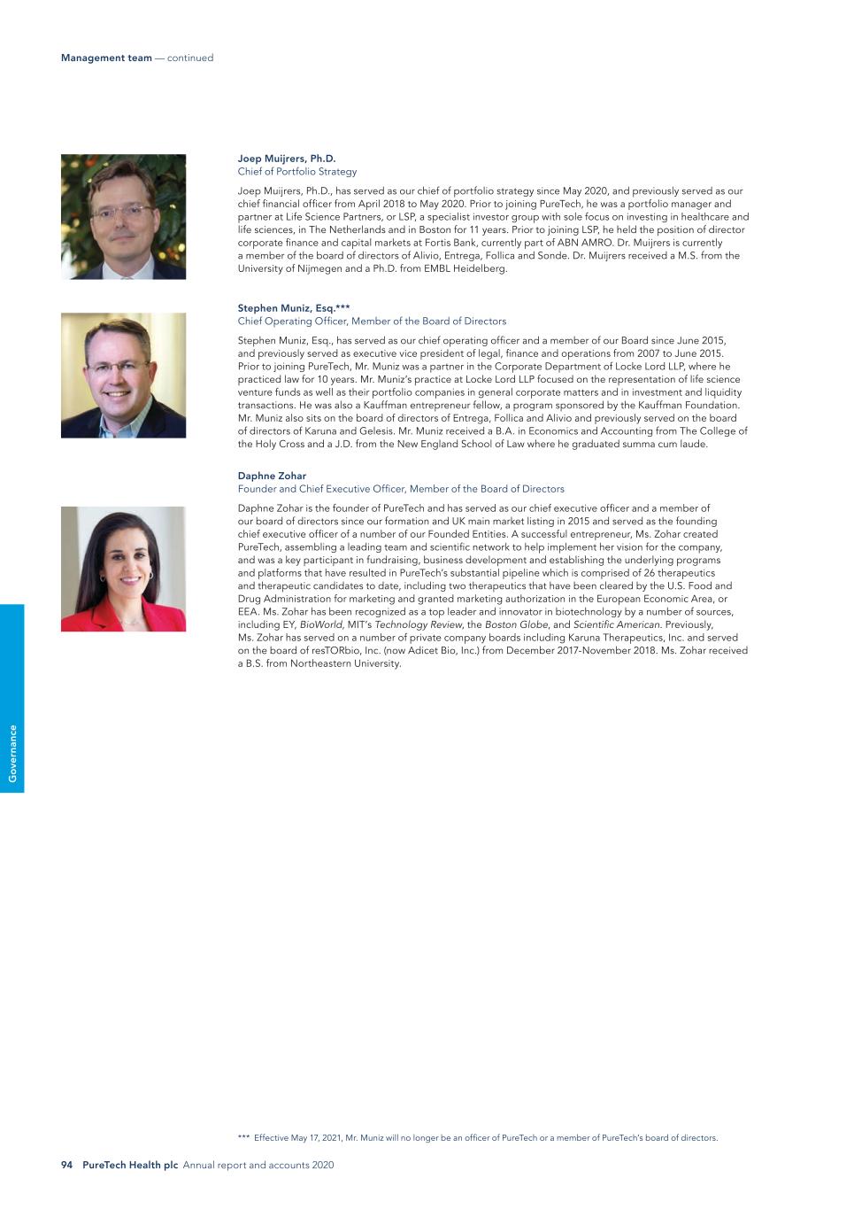 94 PureTech Health plc Annual report and accounts 2020 G o ve rn a n ce Joep Muijrers, Ph.D. Chief of Portfolio Strategy Joep Muijrers, Ph.D., has served as our chief of portfolio strategy since May 2020, and previously served as our chief financial officer from April 2018 to May 2020. Prior to joining PureTech, he was a portfolio manager and partner at Life Science Partners, or LSP, a specialist investor group with sole focus on investing in healthcare and life sciences, in The Netherlands and in Boston for 11 years. Prior to joining LSP, he held the position of director corporate finance and capital markets at Fortis Bank, currently part of ABN AMRO. Dr. Muijrers is currently a member of the board of directors of Alivio, Entrega, Follica and Sonde. Dr. Muijrers received a M.S. from the University of Nijmegen and a Ph.D. from EMBL Heidelberg. Stephen Muniz, Esq.*** Chief Operating Officer, Member of the Board of Directors Stephen Muniz, Esq., has served as our chief operating officer and a member of our Board since June 2015, and previously served as executive vice president of legal, finance and operations from 2007 to June 2015. Prior to joining PureTech, Mr. Muniz was a partner in the Corporate Department of Locke Lord LLP, where he practiced law for 10 years. Mr. Muniz’s practice at Locke Lord LLP focused on the representation of life science venture funds as well as their portfolio companies in general corporate matters and in investment and liquidity transactions. He was also a Kauffman entrepreneur fellow, a program sponsored by the Kauffman Foundation. Mr. Muniz also sits on the board of directors of Entrega, Follica and Alivio and previously served on the board of directors of Karuna and Gelesis. Mr. Muniz received a B.A. in Economics and Accounting from The College of the Holy Cross and a J.D. from the New England School of Law where he graduated summa cum laude. Daphne Zohar Founder and Chief Executive Officer, Member of the Board of Directors Daphne Zohar is the founder of PureTech and has served as our chief executive officer and a member of our board of directors since our formation and UK main market listing in 2015 and served as the founding chief executive officer of a number of our Founded Entities. A successful entrepreneur, Ms. Zohar created PureTech, assembling a leading team and scientific network to help implement her vision for the company, and was a key participant in fundraising, business development and establishing the underlying programs and platforms that have resulted in PureTech’s substantial pipeline which is comprised of 26 therapeutics and therapeutic candidates to date, including two therapeutics that have been cleared by the U.S. Food and Drug Administration for marketing and granted marketing authorization in the European Economic Area, or EEA. Ms. Zohar has been recognized as a top leader and innovator in biotechnology by a number of sources, including EY, BioWorld, MIT’s Technology Review, the Boston Globe, and Scientific American. Previously, Ms. Zohar has served on a number of private company boards including Karuna Therapeutics, Inc. and served on the board of resTORbio, Inc. (now Adicet Bio, Inc.) from December 2017-November 2018. Ms. Zohar received a B.S. from Northeastern University. Management team — continued *** Effective May 17, 2021, Mr. Muniz will no longer be an officer of PureTech or a member of PureTech’s board of directors.