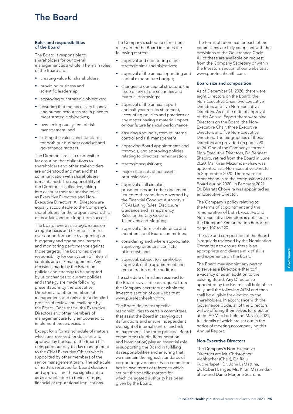 PureTech Health plc Annual report and accounts 2020 95 G o ve rn a n ce Roles and responsibilities of the Board The Board is responsible to shareholders for our overall management as a whole. The main roles of the Board are: • creating value for shareholders; • providing business and scientific leadership; • approving our strategic objectives; • ensuring that the necessary financial and human resources are in place to meet strategic objectives; • overseeing our system of risk management; and • setting the values and standards for both our business conduct and governance matters. The Directors are also responsible for ensuring that obligations to shareholders and other stakeholders are understood and met and that communication with shareholders is maintained. The responsibility of the Directors is collective, taking into account their respective roles as Executive Directors and Non- Executive Directors. All Directors are equally accountable to the Company’s shareholders for the proper stewardship of its affairs and our long-term success. The Board reviews strategic issues on a regular basis and exercises control over our performance by agreeing on budgetary and operational targets and monitoring performance against those targets. The Board has overall responsibility for our system of internal controls and risk management. Any decisions made by the Board on policies and strategy to be adopted by us or changes to current policies and strategy are made following presentations by the Executive Directors and other members of management, and only after a detailed process of review and challenge by the Board. Once made, the Executive Directors and other members of management are fully empowered to implement those decisions. Except for a formal schedule of matters which are reserved for decision and approval by the Board, the Board has delegated our day-to-day management to the Chief Executive Officer who is supported by other members of the senior management team. The schedule of matters reserved for Board decision and approval are those significant to us as a whole due to their strategic, financial or reputational implications. The Company’s schedule of matters reserved for the Board includes the following matters: • approval and monitoring of our strategic aims and objectives; • approval of the annual operating and capital expenditure budget; • changes to our capital structure, the issue of any of our securities and material borrowings; • approval of the annual report and half-year results statement, accounting policies and practices or any matter having a material impact on our future financial performance; • ensuring a sound system of internal control and risk management; • approving Board appointments and removals, and approving policies relating to directors’ remuneration; • strategic acquisitions; • major disposals of our assets or subsidiaries; • approval of all circulars, prospectuses and other documents issued to shareholders governed by the Financial Conduct Authority’s (FCA) Listing Rules, Disclosure Guidance and Transparency Rules or the City Code on Takeovers and Mergers; • approval of terms of reference and membership of Board committees; • considering and, where appropriate, approving directors’ conflicts of interest; and • approval, subject to shareholder approval, of the appointment and remuneration of the auditors. The schedule of matters reserved to the Board is available on request from the Company Secretary or within the Investors section of our website at www.puretechhealth.com. The Board delegates specific responsibilities to certain committees that assist the Board in carrying out its functions and ensure independent oversight of internal control and risk management. The three principal Board committees (Audit, Remuneration and Nomination) play an essential role in supporting the Board in fulfilling its responsibilities and ensuring that we maintain the highest standards of corporate governance. Each committee has its own terms of reference which set out the specific matters for which delegated authority has been given by the Board. The terms of reference for each of the committees are fully compliant with the provisions of the Governance Code. All of these are available on request from the Company Secretary or within the Investors section of our website at www.puretechhealth.com. Board size and composition As of December 31, 2020, there were eight Directors on the Board: the Non-Executive Chair, two Executive Directors and five Non-Executive Directors. As of the date of approval of this Annual Report there were nine Directors on the Board: the Non- Executive Chair, three Executive Directors and five Non-Executive Directors. The biographies of these Directors are provided on pages 90 to 94. One of the Company’s former Non-Executive Directors, Dr. Bennett Shapiro, retired from the Board in June 2020. Ms. Kiran Mazumdar-Shaw was appointed as a Non-Executive Director in September 2020. There were no other changes to the composition of the Board during 2020. In February 2021, Dr. Bharatt Chowrira was appointed as an Executive Director. The Company’s policy relating to the terms of appointment and the remuneration of both Executive and Non-Executive Directors is detailed in the Directors’ Remuneration Report on pages 107 to 120. The size and composition of the Board is regularly reviewed by the Nomination Committee to ensure there is an appropriate and diverse mix of skills and experience on the Board. The Board may appoint any person to serve as a Director, either to fill a vacancy or as an addition to the existing Board. Any Director so appointed by the Board shall hold office only until the following AGM and then shall be eligible for election by the shareholders. In accordance with the Governance Code, all of the Directors will be offering themselves for election at the AGM to be held on May 27, 2021, full details of whi