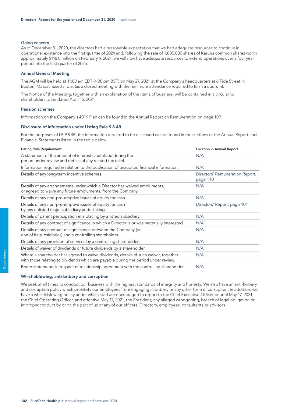 72 PureTech Health plc Annual report and accounts 2020 G o ve rn a n ce PureTech Health plc Viability Statement In accordance with the UK Corporate Governance Code (Governance Code) published in July 2018, the Directors have assessed the prospects of the Company, and with respect to the December 31, 2020 financial position, we have sufficient available funding to extend operations into the first quarter of 2024, and following the sale of 1,000,000 common shares of Karuna for aggregate proceeds of $118.0 million on February 9, 2021, we have sufficient funding to extend operations over a four-year period into the first quarter of 2025. This period is deemed appropriate having assessed the financial health as of December 31, 2020 along with the recent sale of Karuna shares. Further, we expect our Wholly Owned Programs (or “Internal segment”) to significantly progress during this period and for key Controlled Founded Entities and Non- Controlled Founded Entities to reach significant development milestones over the period of the assessment. We anticipate our funding to be used to advance our Wholly Owned Programs, to continue research and development efforts, to discover and progress new therapeutic candidates and to fund the Company’s head office costs into the first quarter of 2025. We have also reserved capital to support our Founded Entities, should they require it, to reach significant development milestones over the period of the assessment in conjunction with our external partners. However, the majority of funding has been allocated to the advancement of the Wholly Owned Programs. This budget projection is conservative as it includes only existing funds as well as some limited inflows from current collaborations. The budget projection does not include potential inflows of cash which may occur, for example, as a result of future strategic partnerships, sales of holdings, royalties on the sale of commercialized therapeutics and grants as well as equity fundraising at Founded Entities. The Directors confirm that they have a reasonable expectation that we will continue to operate and meet our obligations as they fall due over the period of the assessment. In making this statement the Directors carried out a robust assessment of the principal risks, including those that would threaten our business model, future performance, solvency or liquidity. This assessment was made in consideration of our strong financial position, current strategy and management of principal risks. The following facts support the Directors’ view of the viability: • We have significant influence over the spending and strategic direction of our Wholly Owned Programs and Controlled Founded Entities. • Our business model is structured so that we are not reliant on the successful outcomes of any one therapeutic or technology within the Wholly Owned Programs, or any Controlled Founded Entity or Non- Controlled Founded Entity. In addition, the fact that the Wholly Owned Programs, Controlled Founded Entities and Non-Controlled Founded Entities (with the exception of Gelesis and Akili) are currently in the research and development stage means that these therapeutics, technologies and entities are not reliant on cash inflows from product sales or services during the period of this assessment. This also means that we are not highly susceptible to conditions in one or more market sectors in this time frame. Although engaging with collaboration partners is highly valuable from a validation and, in some cases, funding perspective, we are not solely reliant on cash flows from such sources over the period of assessment. Our PureTech Level cash and cash equivalents as of December 31, 2020 was $349.4 million, and following the cash outflows and inflows for the three-months ended March 31, 2021, particularly the $118.0 million in additional cash following the Karuna share sale, our PureTech Level cash and cash equivalents was $443.4 million as of March 31, 2021. Our PureTech Level cash and cash equivalents is highly liquid and forecasts to support infrastructure costs, Wholly Owned Program research and development activities and the appropriate funding of key Controlled Founded Entities and Non-Controlled Founded Entities to reach significant development milestones over the period of the assessment. The Board reviews the near-term liquidity and regularly considers funding plans of our Wholly Owned Programs, Controlled Founded Entities and Non-Controlled Founded Entities in our assessment of long-term cash flow projections. While the review has considered all of the principal risks identified, the Board is focused on the pathway to regulatory approval of each therapeutic candidate being developed within our Wholly Owned Pipeline as well as those of our Founded Entities. Further, the Board has considered milestone funding based on existing collaboration and partnership arrangements, and the ability of the Wholly Owned Program, and each Controlled Founded Entity and Non-Controlled Founded Entity to enter into new collaboration agreements, all of which could be expected to generate cash in-flows but were not included in the assessment. Additionally, given that spending and investment decisions are largely discretionary, there is management control on reducing discretionary spending if unforeseen liquidity risks arise. The Directors note that our ownership stakes in the Controlled Founded Entities and Non-Controlled Founded Entities are expected to be illiquid in nature, with the exception of our ownership stakes in Karuna and Vor, which are both publicly traded on Nasdaq. While we anticipate holding these ownership stakes through the achievement of significant milestones or other events, we will continue to be diligent in exploring monetization opportunities similar to the execution of the sale of 1,000,000 common shares of Karuna for aggregate proceeds of $118.0 million on February 9, 2021. However, our budget does not include