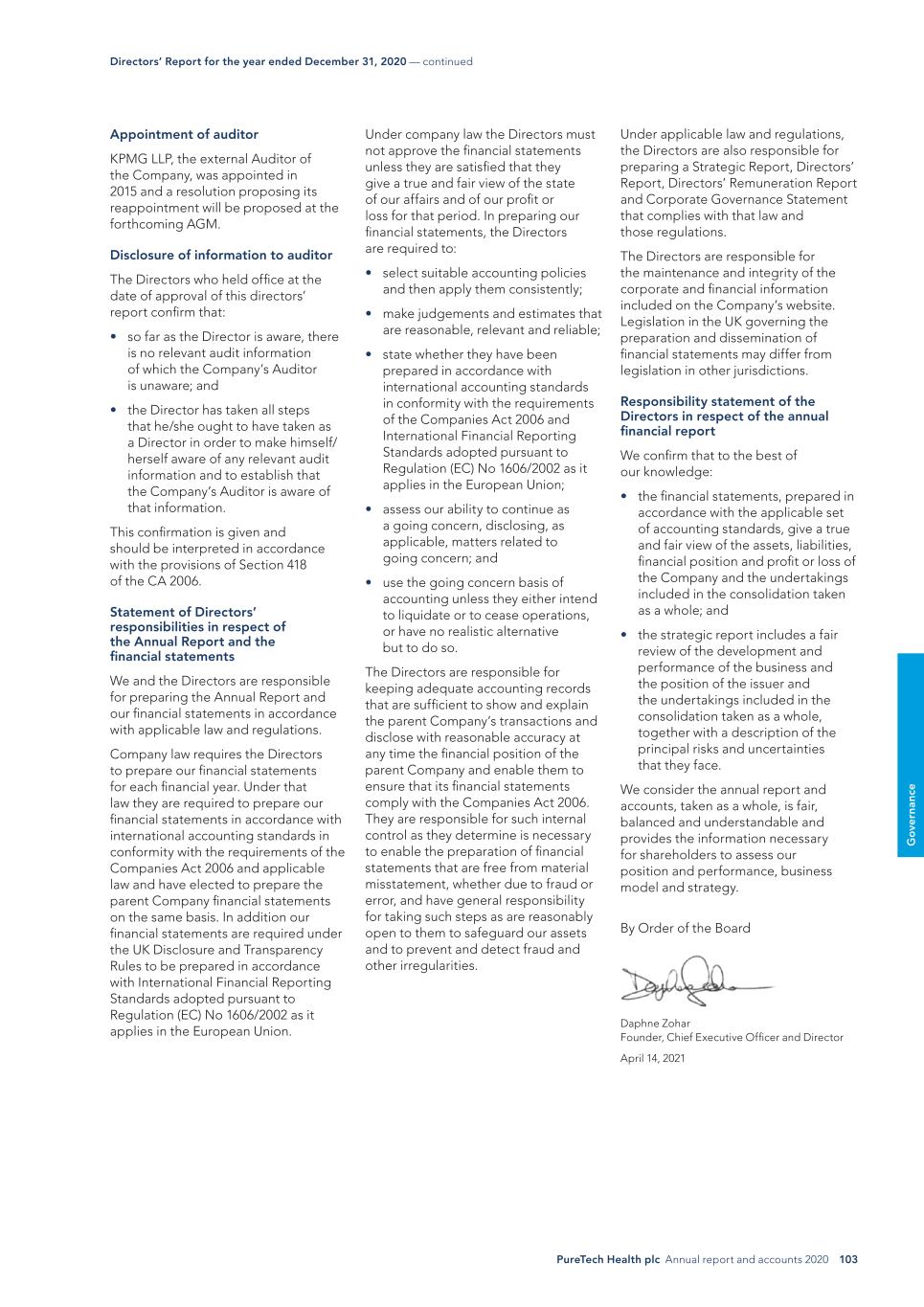 26 PureTech Health plc Annual report and accounts 2020 S tr a te g ic r e p o rt Our goal is to identify, invent, develop and commercialize innovative new categories of therapeutics that are derived from our deep understanding of the BIG Axis to address significant unmet medical needs. To achieve this goal, key components of our strategy include: • Advancing Wholly Owned Programs Through Development and Commercialization, Including Pipeline Expansion: − Progressing LYT-100, LYT-200, LYT-210 and LYT-300 through clinical studies: We are developing novel classes of immunomodulatory drugs to treat serious diseases, including lung dysfunction, immuno-oncology, lymphatic, neurological and neuropsychological disorders. − Harnessing our proprietary drug discovery and development capabilities to drive pipeline maturation and expansion: We are pioneering the development of therapeutic candidates by leveraging our unique insights into the lymphatic system and the BIG Axis. Our Wholly Owned Programs currently comprise four proprietary therapeutic candidates and three innovative technology platforms. We intend to leverage our proprietary technology platforms, as well as our extensive network with world-leading scientists in immunology and lymphatics and major pharmaceutical companies, to generate and acquire additional novel therapeutic candidates. To do so, we will rely on the track record of our team, which has been instrumental in the generation of 26 therapeutics and therapeutic candidates to date between our Wholly Owned Programs and our Founded Entities, including two that have been cleared for marketing by the FDA and granted marketing authorization in the EEA, as well as our established internal identification and prioritization approach. We will continue to take advantage of our differentiated model to manage the risk of any single program and quickly redeploy resources towards performing assets. − Maximizing the impact of our Wholly Owned Programs by expanding development across multiple indications: We aim to focus our development efforts on therapeutic candidates that have the potential to treat multiple diseases and plan to develop them in additional indications where warranted. For example, we believe that our therapeutic candidate LYT-100 has the potential to be evaluated in multiple inflammatory and fibrotic indications beyond our initial target indication of lymphedema, such as IPF and potentially other PF-ILDs and Long COVID respiratory complications and related sequelae. We are initially developing our other therapeutic candidates, LYT-200 and LYT-210, for the treatment of certain cancers, including CCA, colorectal cancer, or CRC, and pancreatic cancers, among others, and we are evaluating LYT-210 for the potential treatment of GI autoimmune diseases as well. Lastly, we are evaluating LYT-300 for a range of neurological and neuropsychological conditions. • Deriving Value from Equity Growth of Our Founded Entities: Historically, we have pursued a variety of strategic options to fund and drive the development of our Founded Entities’ therapeutic candidates, including private and public financings and multiple partnerships and collaborations with selected partners. In the preliminary stages of our growth, we partnered with equity investors, pharmaceutical and biotechnology companies and government and non-governmental organizations for certain of our Founded Entities which are now in advanced stages and have the potential for near-term value creation with significant upside potential. Going forward, our Founded Entities may participate in private and public financings, enter into partnerships and collaborations, partner with equity investors, pharmaceutical and biotechnology companies and government and non-governmental organizations and generate revenues from sales of products. We hold equity ownership in our Founded Entities and benefit from their growth and catalysts such as M&A transactions, IPOs and royalties from sales. We also intend to strategically monetize our equity holdings in our Founded Entities after significant value creation has occurred, generating non-dilutive financing. For example, PureTech generated cash proceeds of $350.6 million in 2020 and an additional $118 million in the 2021 post-period, from the sales of equity in our Founded Entities, which we intend to use to fund our operations and growth and to further expand and advance our clinical-stage Wholly Owned Pipeline, while still maintaining significant equity ownership to derive value from future growth of that entity. We may create additional entities opportunistically based on future strategic imperatives. • Advancing Discovery Platforms by Partnering Non-Core Applications via Non-Dilutive Funding Sources, Including Partnerships and Grants, to Enable Retention of Value: As we further develop our Wholly Owned Programs through key value inflection points, we may opportunistically enter into strategic partnerships when we believe that such partnerships could add value to the development or potential commercialization of our wholly-owned therapeutic candidates. We will also continue to pursue government grant funding and discovery partnerships that allow us to maintain most of the value of our platforms while offsetting operational costs. We believe this combination of development of our Wholly Owned Programs, Founded Entity advancement and non-dilutive partnerships and funding provides us with a unique and multi-pronged engine fueling potential future growth. By Order of the Board Daphne Zohar Founder, Chief Executive Officer and Director April 14, 2021 How PureTech is building value for investors — continued