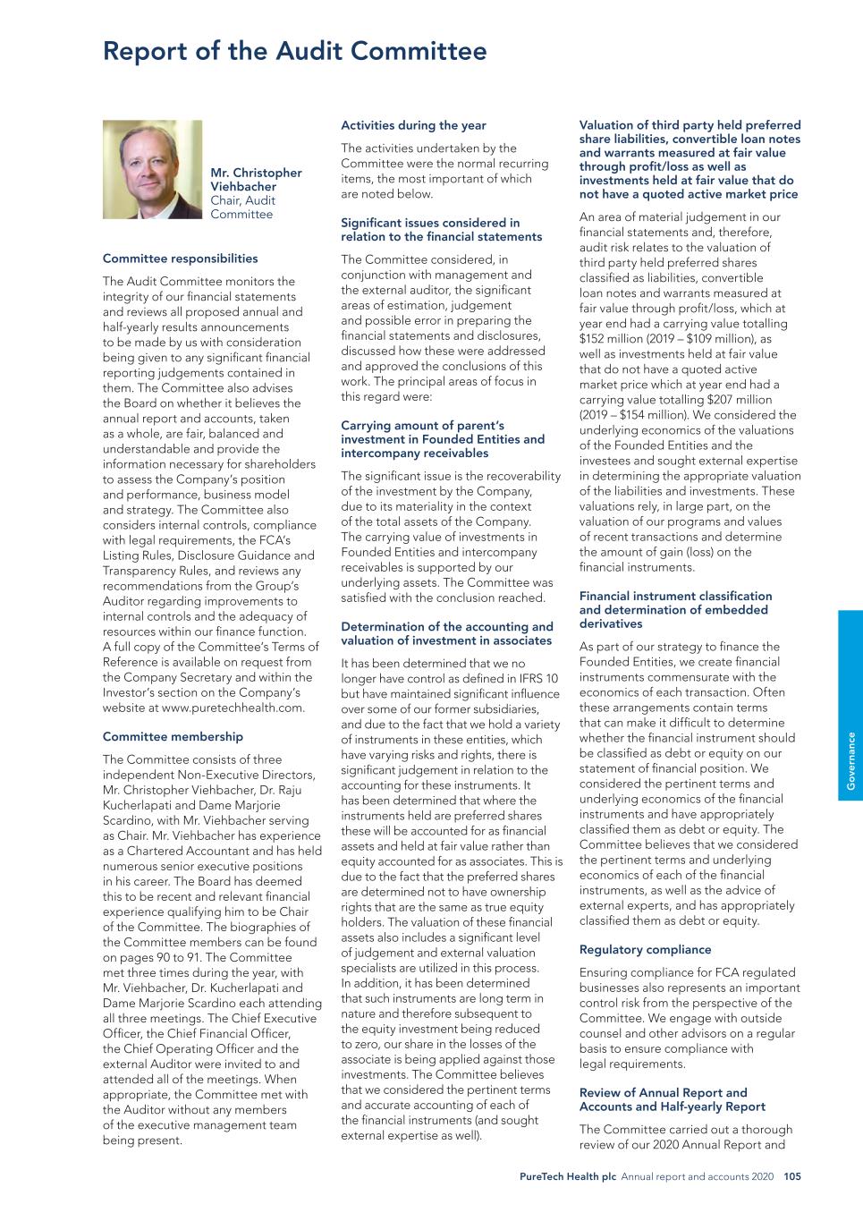 98 PureTech Health plc Annual report and accounts 2020 G o ve rn a n ce of the Directors on the Board and the performance of the committees of the Board will be reviewed by the Chair as deemed necessary. The performance of Executive Directors will be reviewed by the Board on an ongoing basis, as deemed necessary, in the absence of the Executive Director under review. Committees of the Board The Board has three principal committees: the Nomination Committee, the Audit Committee and the Remuneration Committee. The composition of the three principal committees of the Board and the attendance of the members throughout the year is set out in the respective committee reports contained in this Annual Report. The terms of reference of each committee are available on request from the Company Secretary and within the Investors section of our website at www.puretechhealth.com. Internal Control The Board fully recognizes the importance of the guidance contained in the Guidance on Risk Management, Internal Control and Related Financial and Business Reporting. Our internal controls were in place during the whole of 2020, with two significant failures in internal control identified for the year ended December 31, 2020. The Board is responsible for establishing and monitoring internal control systems and for reviewing the effectiveness of these systems. The Board views the effective operation of a rigorous system of internal control as critical to our success; however, it recognizes that such systems are designed to manage rather than eliminate risk of failure and can provide only reasonable and not absolute assurance against material misstatement or loss. The key elements of our internal control system, all of which have been in place during the financial year and up to the date these financial statements were approved, are as follows: Control environment and procedures We have a clear organizational structure with defined responsibilities and accountabilities. It adopts the highest values surrounding quality, integrity and ethics, and these values are communicated clearly throughout the whole organization. Detailed written policies and procedures have been established covering key operating and compliance risk areas. These policies and procedures are reviewed and the effectiveness of the systems of internal control is assessed periodically by the Board. Identification and evaluation of risks The Board actively identifies and evaluates the risks inherent in the business and ensures that appropriate controls and procedures are in place to manage these risks. The Board obtains an update regarding its Wholly Owned Pipeline and all Founded Entities on a regular basis and reviews our performance and the performance of our Wholly Owned Pipeline and Founded Entities on a quarterly basis, although performance of business units may be reviewed more frequently if deemed appropriate. The key risks and uncertainties we face, as well as the relevant mitigations, are set out on pages 69 to 71 and in the Additional Information section from pages 191 to 227. Information and financial reporting systems We evaluate and manage significant risks associated with the process for preparing consolidated accounts by having in place systems and controls that ensure adequate accounting records are maintained and transactions are recorded accurately and fairly to permit the preparation of financial statements in accordance with IFRS. The Board approves the annual operating budgets and regularly receives details of actual performance measured against the budget. Principal risks and uncertainties Our operations and the implementation of our objectives and strategy are subject to a number of key risks and uncertainties. Risks are formally reviewed by the Board at least annually and appropriate procedures are put in place to monitor and, to the extent possible, mitigate these risks. A summary of the key risks affecting us and the steps taken to manage these risks is set out on pages 69 to 71 and in the Additional Information section from pages 191 to 227. Relations with stakeholders The Company is committed to a continuous dialogue with shareholders as it believes that this is essential to ensure a greater understanding of and confidence amongst its shareholders in our medium and longer term strategy and in the Board’s ability to oversee its implementation. It is the responsibility of the Board as a whole to ensure that a satisfactory dialogue takes place. Section 172 of the CA 2006 requires Directors to take into consideration the interests of stakeholders in their decision making. The Board is committed to understanding and engaging with all key stakeholder groups of the Company in order to maximise value and promote long- term Company success in line with our strategic objectives. The Board recognizes its duties under Section 172 and continuously has regard to how the Company’s activities and decisions will impact employees, those with which it has a business relationship, the community and environment and its reputation for high standards of business conduct. In weighing all of the relevant factors, the Board, acting in good faith and fairly between members, makes decisions and takes actions that it considers will best lead to the long- term success of the Company. During the year, the Board assessed its current activities between the Board and its stakeholders, which demonstrated that the Board actively engages with its stakeholders and takes their various objectives into consideration when making decisions. Specifically, actions the Board has taken to engage with its stakeholders in 2020 include: Investors • Our shareholders are the owners and investors in our business and we make significant efforts to engage with our shareholders and understand their objectives. Unfortunately, we were unable to meet shareholders in person at our 2020 AGM due to the COVID-19 pandemic, but we provided an opportunity for shareholders to su