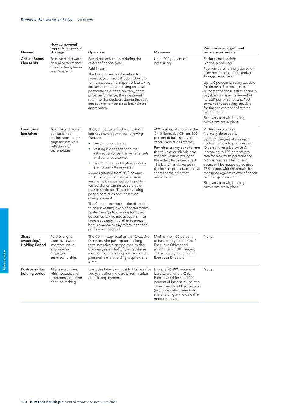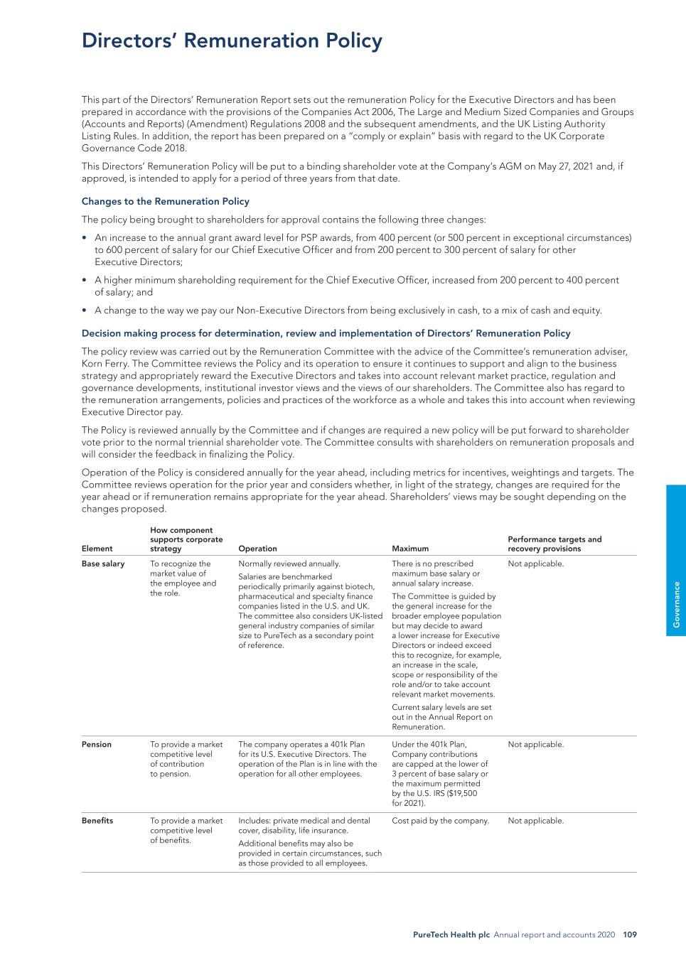 PureTech Health plc Annual report and accounts 2020 97 G o ve rn a n ce The Board — continued Where absences were unavoidable, the impacted Director reviewed with management the topics and materials to be discussed at the meeting, and provided appropriate feedback to be conveyed at such meeting. The Board also acted by unanimous written consent four times in 2020. At each meeting of the Board, there was a closed session held in which only the Chair and the other Non-Executive Directors participated. The schedule of Board and Committee meetings each year is, so far as is possible, determined before the commencement of that year and all Directors or, if applicable, all Committee members, are expected to attend each meeting. Supplementary meetings of the Board and/or the Committees are held as and when necessary. Each member of the Board receives in advance of each scheduled meeting detailed Board packages, which include an agenda based upon matters to be addressed and appropriate presentation and background materials. If a Director is unable to attend a meeting due to exceptional circumstances, he or she will nonetheless receive the meeting materials and discuss the materials with the Chief Executive Officer. The Chair, Chief Executive Officer and senior management team work together to ensure that the Directors receive relevant information to enable them to discharge their duties and that such information is accurate, timely and clear. This information includes quarterly management accounts containing analysis of performance against budget as well as a summary of the operational performance of each of our businesses against its goals. Additional information is provided as appropriate for the topics being addressed at the meeting. At each meeting, the Board receives presentations from the Chief Executive Officer and, by invitation, other members of senior management as required. This ensures that all Directors are in a position to monitor effectively our overall performance, and to contribute to the development and implementation of its strategy. The majority of Board meetings are held at our offices in Boston, Massachusetts, U.S., which gives members of the Company’s senior management team, as well as the senior management of the Founded Entities, the opportunity to formally present to the Board on new technology development and business strategies. During the COVID-19 pandemic, for the safety of the Board and the Company’s employees, all board meetings have been held by videoconference. Most Directors also serve on the boards of directors of our Founded Entities. These Founded Entity boards of directors meet regularly during the year, as well as on an ad hoc basis as required by business need. This service enables the Directors to have deep understanding of the businesses and contribute significantly to the strategy and oversight of these businesses. Directors’ conflicts of interest Each Director has a statutory duty under the Companies Act 2006 (the CA 2006) to avoid a situation in which he or she has or can have a direct or indirect interest that conflicts or may potentially conflict with the interests of the Company. This duty is in addition to the continuing duty that a director owes to the Company to disclose to the Board any transaction or arrangement under consideration by the Company in which he or she is interested. The Company’s Articles of Association permit the Board to authorize conflicts or potential conflicts of interest. The Board has established procedures for managing and, where appropriate, authorizing any such conflicts or potential conflicts of interest. In deciding whether to authorize any conflict, the Directors must have regard to their general duties under the CA 2006 and their overriding obligation to act in a way they consider, in good faith, will be most likely to promote the Company’s success. In addition, the Directors are able to impose limits or conditions when giving authorization to a conflict or potential conflict of interest if they think this is appropriate. The authorization of any conflict matter, and the terms of any authorization, may be reviewed by the Board at any time. The Board believes that the procedures established to deal with conflicts of interest are operating effectively. Induction, awareness and development In preparation for the Company’s initial public offering (IPO), all Directors received an induction briefing from the Company’s legal advisors on their duties and responsibilities as Directors of a publicly quoted company. The Directors also received presentations from the Company’s corporate brokers prior to the IPO. In addition, in order to ensure that the Directors continue to further their understanding of the challenges facing our Founded Entities and Wholly Owned Pipeline, the Board periodically receives the presentations and reports covering the business and operations of each of our Founded Entities as well as its Wholly Owned Pipeline. We have put in place a comprehensive induction plan for any new Directors. This program will be tailored to the needs of each individual Director and agreed with him or her so that he or she can gain a better understanding of us and our businesses. In addition, the Company facilitates sessions as appropriate with our advisers, as well as appropriate governance specialists, to ensure that any new Directors are fully aware of, and understand, their responsibilities and obligations of a publicly quoted company and of the governance framework within which they must operate. Board effectiveness and performance evaluation The Board periodically reviews its effectiveness and performance. The Board seeks the assistance of an independent third party provider at least once every three years in its evaluation in compliance with the Governance Code, and will otherwise carry out an internally facilitated Board evaluation led by the Senior Independent Director, assisted by the Company Sec