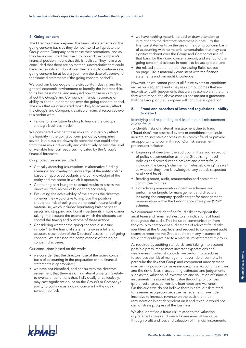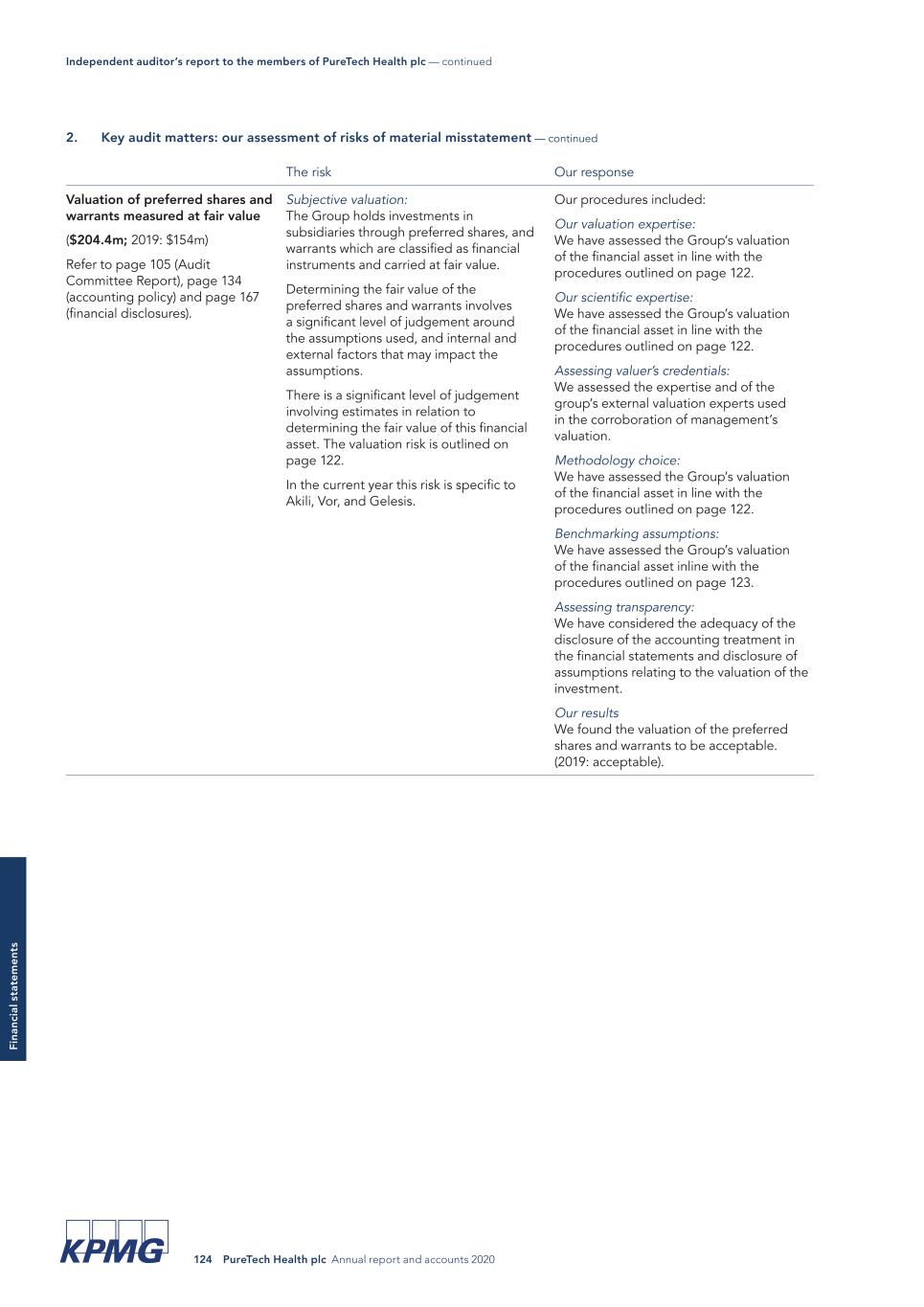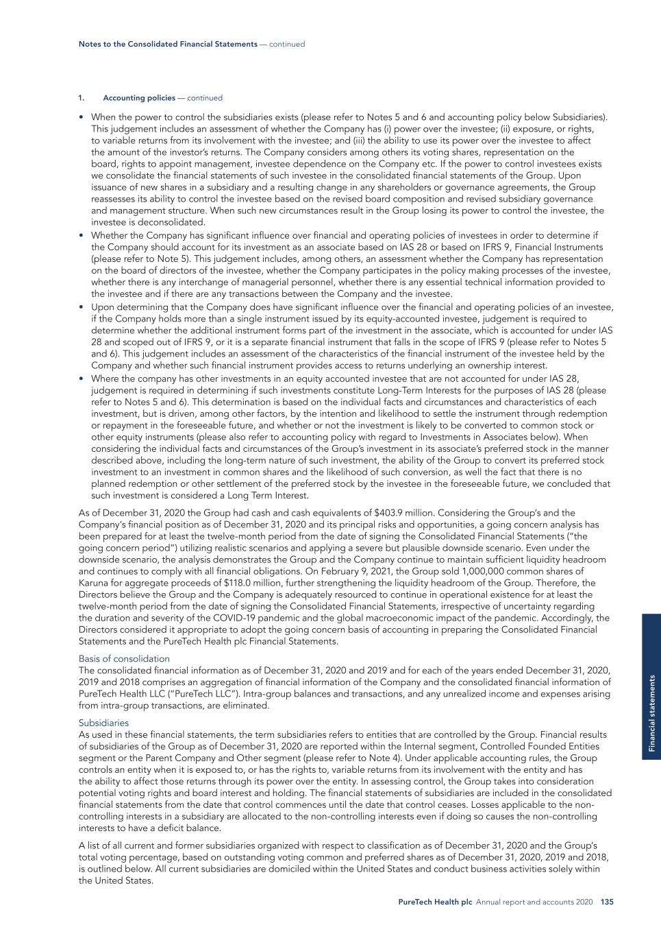 PureTech Health plc Annual report and accounts 2020 135 F in a n ci a l st a te m e n ts • When the power to control the subsidiaries exists (please refer to Notes 5 and 6 and accounting policy below Subsidiaries). This judgement includes an assessment of whether the Company has (i) power over the investee; (ii) exposure, or rights, to variable returns from its involvement with the investee; and (iii) the ability to use its power over the investee to affect the amount of the investor’s returns. The Company considers among others its voting shares, representation on the board, rights to appoint management, investee dependence on the Company etc. If the power to control investees exists we consolidate the financial statements of such investee in the consolidated financial statements of the Group. Upon issuance of new shares in a subsidiary and a resulting change in any shareholders or governance agreements, the Group reassesses its ability to control the investee based on the revised board composition and revised subsidiary governance and management structure. When such new circumstances result in the Group losing its power to control the investee, the investee is deconsolidated. • Whether the Company has significant influence over financial and operating policies of investees in order to determine if the Company should account for its investment as an associate based on IAS 28 or based on IFRS 9, Financial Instruments (please refer to Note 5). This judgement includes, among others, an assessment whether the Company has representation on the board of directors of the investee, whether the Company participates in the policy making processes of the investee, whether there is any interchange of managerial personnel, whether there is any essential technical information provided to the investee and if there are any transactions between the Company and the investee. • Upon determining that the Company does have significant influence over the financial and operating policies of an investee, if the Company holds more than a single instrument issued by its equity-accounted investee, judgement is required to determine whether the additional instrument forms part of the investment in the associate, which is accounted for under IAS 28 and scoped out of IFRS 9, or it is a separate financial instrument that falls in the scope of IFRS 9 (please refer to Notes 5 and 6). This judgement includes an assessment of the characteristics of the financial instrument of the investee held by the Company and whether such financial instrument provides access to returns underlying an ownership interest. • Where the company has other investments in an equity accounted investee that are not accounted for under IAS 28, judgement is required in determining if such investments constitute Long-Term Interests for the purposes of IAS 28 (please refer to Notes 5 and 6). This determination is based on the individual facts and circumstances and characteristics of each investment, but is driven, among other factors, by the intention and likelihood to settle the instrument through redemption or repayment in the foreseeable future, and whether or not the investment is likely to be converted to common stock or other equity instruments (please also refer to accounting policy with regard to Investments in Associates below). When considering the individual facts and circumstances of the Group’s investment in its associate’s preferred stock in the manner described above, including the long-term nature of such investment, the ability of the Group to convert its preferred stock investment to an investment in common shares and the likelihood of such conversion, as well the fact that there is no planned redemption or other settlement of the preferred stock by the investee in the foreseeable future, we concluded that such investment is considered a Long Term Interest. As of December 31, 2020 the Group had cash and cash equivalents of $403.9 million. Considering the Group’s and the Company’s financial position as of December 31, 2020 and its principal risks and opportunities, a going concern analysis has been prepared for at least the twelve-month period from the date of signing the Consolidated Financial Statements (“the going concern period”) utilizing realistic scenarios and applying a severe but plausible downside scenario. Even under the downside scenario, the analysis demonstrates the Group and the Company continue to maintain sufficient liquidity headroom and continues to comply with all financial obligations. On February 9, 2021, the Group sold 1,000,000 common shares of Karuna for aggregate proceeds of $118.0 million, further strengthening the liquidity headroom of the Group. Therefore, the Directors believe the Group and the Company is adequately resourced to continue in operational existence for at least the twelve-month period from the date of signing the Consolidated Financial Statements, irrespective of uncertainty regarding the duration and severity of the COVID-19 pandemic and the global macroeconomic impact of the pandemic. Accordingly, the Directors considered it appropriate to adopt the going concern basis of accounting in preparing the Consolidated Financial Statements and the PureTech Health plc Financial Statements. Basis of consolidation The consolidated financial information as of December 31, 2020 and 2019 and for each of the years ended December 31, 2020, 2019 and 2018 comprises an aggregation of financial information of the Company and the consolidated financial information of PureTech Health LLC (“PureTech LLC”). Intra-group balances and transactions, and any unrealized income and expenses arising from intra-group transactions, are eliminated. Subsidiaries As used in these financial statements, the term subsidiaries refers to entities that are controlled by the Group. Financial results of subsidiaries of the Group as of December 31, 2020 are reported within the Internal segment, Controlled 