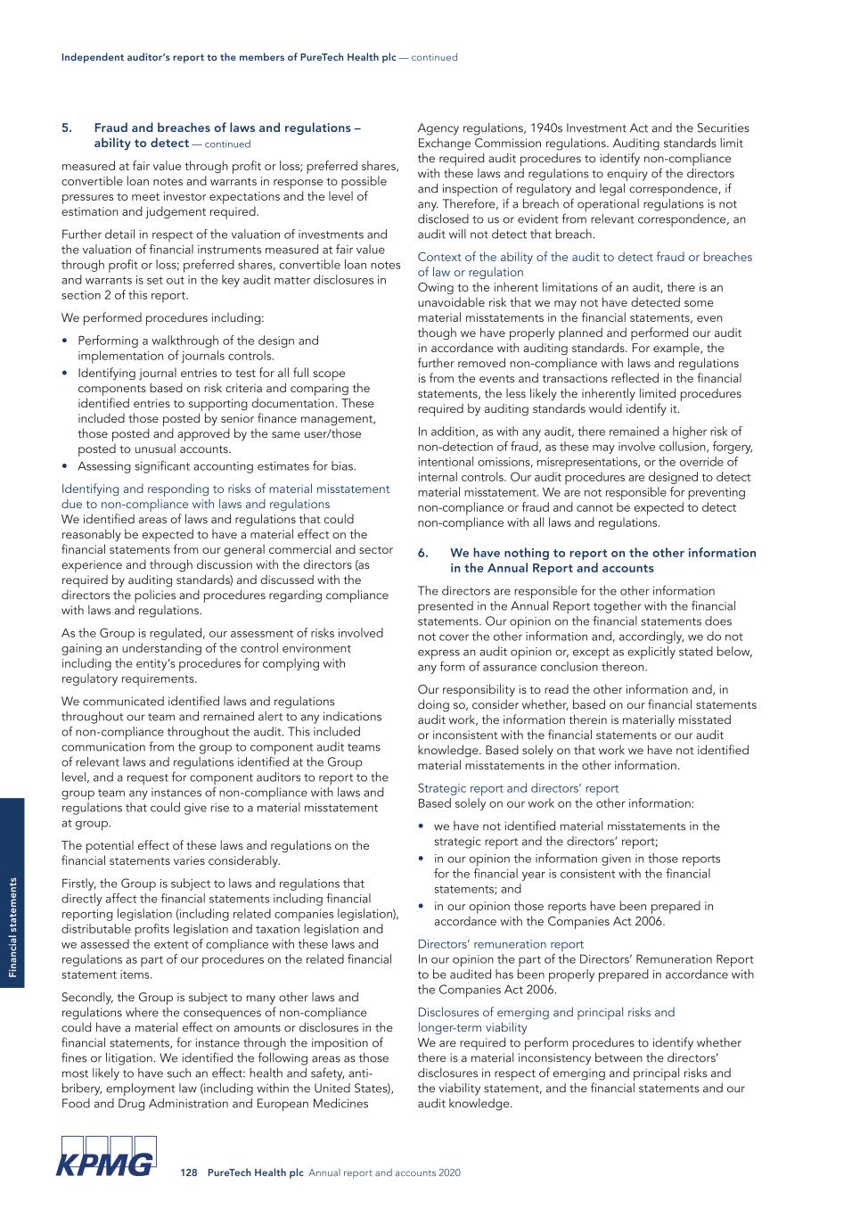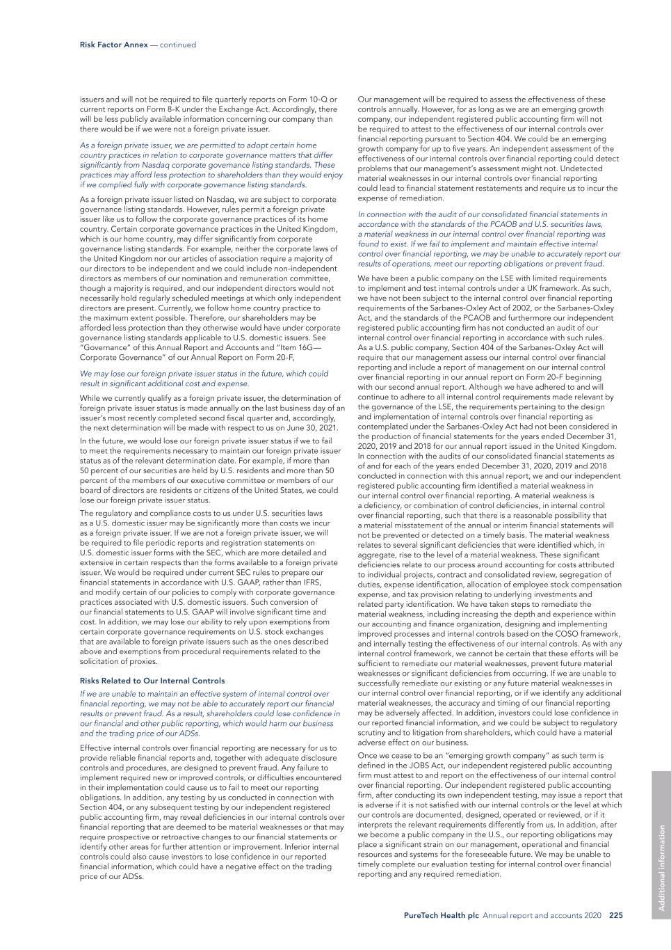 PureTech Health plc Annual report and accounts 2020 225 Risk Factor Annex — continued A d d it io n a l in fo rm a ti o n issuers and will not be required to file quarterly reports on Form 10-Q or current reports on Form 8-K under the Exchange Act. Accordingly, there will be less publicly available information concerning our company than there would be if we were not a foreign private issuer. As a foreign private issuer, we are permitted to adopt certain home country practices in relation to corporate governance matters that differ significantly from Nasdaq corporate governance listing standards. These practices may afford less protection to shareholders than they would enjoy if we complied fully with corporate governance listing standards. As a foreign private issuer listed on Nasdaq, we are subject to corporate governance listing standards. However, rules permit a foreign private issuer like us to follow the corporate governance practices of its home country. Certain corporate governance practices in the United Kingdom, which is our home country, may differ significantly from corporate governance listing standards. For example, neither the corporate laws of the United Kingdom nor our articles of association require a majority of our directors to be independent and we could include non-independent directors as members of our nomination and remuneration committee, though a majority is required, and our independent directors would not necessarily hold regularly scheduled meetings at which only independent directors are present. Currently, we follow home country practice to the maximum extent possible. Therefore, our shareholders may be afforded less protection than they otherwise would have under corporate governance listing standards applicable to U.S. domestic issuers. See “Governance” of this Annual Report and Accounts and “Item 16G— Corporate Governance” of our Annual Report on Form 20-F, We may lose our foreign private issuer status in the future, which could result in significant additional cost and expense. While we currently qualify as a foreign private issuer, the determination of foreign private issuer status is made annually on the last business day of an issuer’s most recently completed second fiscal quarter and, accordingly, the next determination will be made with respect to us on June 30, 2021. In the future, we would lose our foreign private issuer status if we to fail to meet the requirements necessary to maintain our foreign private issuer status as of the relevant determination date. For example, if more than 50 percent of our securities are held by U.S. residents and more than 50 percent of the members of our executive committee or members of our board of directors are residents or citizens of the United States, we could lose our foreign private issuer status. The regulatory and compliance costs to us under U.S. securities laws as a U.S. domestic issuer may be significantly more than costs we incur as a foreign private issuer. If we are not a foreign private issuer, we will be required to file periodic reports and registration statements on U.S. domestic issuer forms with the SEC, which are more detailed and extensive in certain respects than the forms available to a foreign private issuer. We would be required under current SEC rules to prepare our financial statements in accordance with U.S. GAAP, rather than IFRS, and modify certain of our policies to comply with corporate governance practices associated with U.S. domestic issuers. Such conversion of our financial statements to U.S. GAAP will involve significant time and cost. In addition, we may lose our ability to rely upon exemptions from certain corporate governance requirements on U.S. stock exchanges that are available to foreign private issuers such as the ones described above and exemptions from procedural requirements related to the solicitation of proxies. Risks Related to Our Internal Controls If we are unable to maintain an effective system of internal control over financial reporting, we may not be able to accurately report our financial results or prevent fraud. As a result, shareholders could lose confidence in our financial and other public reporting, which would harm our business and the trading price of our ADSs. Effective internal controls over financial reporting are necessary for us to provide reliable financial reports and, together with adequate disclosure controls and procedures, are designed to prevent fraud. Any failure to implement required new or improved controls, or difficulties encountered in their implementation could cause us to fail to meet our reporting obligations. In addition, any testing by us conducted in connection with Section 404, or any subsequent testing by our independent registered public accounting firm, may reveal deficiencies in our internal controls over financial reporting that are deemed to be material weaknesses or that may require prospective or retroactive changes to our financial statements or identify other areas for further attention or improvement. Inferior internal controls could also cause investors to lose confidence in our reported financial information, which could have a negative effect on the trading price of our ADSs. Our management will be required to assess the effectiveness of these controls annually. However, for as long as we are an emerging growth company, our independent registered public accounting firm will not be required to attest to the effectiveness of our internal controls over financial reporting pursuant to Section 404. We could be an emerging growth company for up to five years. An independent assessment of the effectiveness of our internal controls over financial reporting could detect problems that our management’s assessment might not. Undetected material weaknesses in our internal controls over financial reporting could lead to financial statement restatements and require us to incur the expense of remediation. In