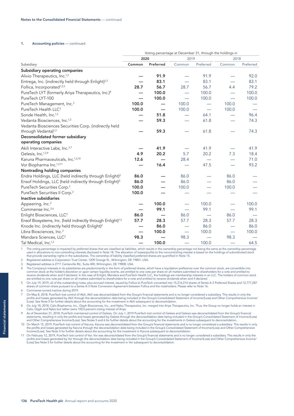 136 PureTech Health plc Annual report and accounts 2020 F in a n ci a l st a te m e n ts Voting percentage at December 31, through the holdings in 2020 2019 2018 Subsidiary Common Preferred Common Preferred Common Preferred Subsidiary operating companies Alivio Therapeutics, Inc.1,2 — 91.9 — 91.9 — 92.0 Entrega, Inc. (indirectly held through Enlight)1,2 — 83.1 — 83.1 — 83.1 Follica, Incorporated1,2,5 28.7 56.7 28.7 56.7 4.4 79.2 PureTech LYT (formerly Ariya Therapeutics, Inc.)8 — 100.0 — 100.0 — 100.0 PureTech LYT-100 — 100.0 — 100.0 — 100.0 PureTech Management, Inc.3 100.0 — 100.0 — 100.0 — PureTech Health LLC3 100.0 — 100.0 — 100.0 — Sonde Health, Inc.1,2 — 51.8 — 64.1 — 96.4 Vedanta Biosciences, Inc.1,2 — 59.3 — 61.8 — 74.3 Vedanta Biosciences Securities Corp. (indirectly held through Vedanta)1,2 — 59.3 — 61.8 — 74.3 Deconsolidated former subsidiary operating companies Akili Interactive Labs, Inc.2,7 — 41.9 — 41.9 — 41.9 Gelesis, Inc.1,2,9 4.9 20.2 5.7 20.2 7.3 18.4 Karuna Pharmaceuticals, Inc.1,2,10 12.6 — 28.4 — — 71.0 Vor Biopharma Inc.1,2,11 — 16.4 — 47.5 — 93.2 Nontrading holding companies Endra Holdings, LLC (held indirectly through Enlight)2 86.0 — 86.0 — 86.0 — Ensof Holdings, LLC (held indirectly through Enlight)2 86.0 — 86.0 — 86.0 — PureTech Securities Corp.2 100.0 — 100.0 — 100.0 — PureTech Securities II Corp.2 100.0 — — — — — Inactive subsidiaries Appeering, Inc.2 — 100.0 — 100.0 — 100.0 Commense Inc.2,6 — 99.1 — 99.1 — 99.1 Enlight Biosciences, LLC2 86.0 — 86.0 — 86.0 — Ensof Biosystems, Inc. (held indirectly through Enlight)1,2 57.7 28.3 57.7 28.3 57.7 28.3 Knode Inc. (indirectly held through Enlight)2 — 86.0 — 86.0 — 86.0 Libra Biosciences, Inc.2 — 100.0 — 100.0 — 100.0 Mandara Sciences, LLC2 98.3 — 98.3 — 98.3 — Tal Medical, Inc.1,2 — 100.0 — 100.0 — 64.5 1 The voting percentage is impacted by preferred shares that are classified as liabilities, which results in the ownership percentage not being the same as the ownership percentage used in allocations to non-controlling interests disclosed in Note 18. The allocation of losses/profits to the noncontrolling interest is based on the holdings of subordinated stock that provide ownership rights in the subsidiaries. The ownership of liability classified preferred shares are quantified in Note 15. 2 Registered address is Corporation Trust Center, 1209 Orange St., Wilmington, DE 19801, USA. 3 Registered address is 2711 Centerville Rd., Suite 400, Wilmington, DE 19808, USA. 4 The Company’s interests in its subsidiaries are predominantly in the form of preferred shares, which have a liquidation preference over the common stock, are convertible into common stock at the holder’s discretion or upon certain liquidity events, are entitled to one vote per share on all matters submitted to shareholders for a vote and entitled to receive dividends when and if declared. In the case of Enlight, Mandara and PureTech Health LLC, the holdings are membership interests in an LLC. The holders of common stock are entitled to one vote per share on all matters submitted to shareholders for a vote and entitled to receive dividends when and if declared. 5 On July 19, 2019, all of the outstanding notes, plus accrued interest, issued by Follica to PureTech converted into 15,216,214 shares of Series A-3 Preferred Shares and 12,777,287 shares of common share pursuant to a Series A-3 Note Conversion Agreement between Follica and the noteholders. Please refer to Note 16. 6 Commense turned inactive during 2019. 7 On May 8, 2018, PureTech lost control of Akili, Akili was deconsolidated from the Group’s financial statements and is no longer considered a subsidiary. This results in only the profits and losses generated by Akili through the deconsolidation date being included in the Group’s Consolidated Statement of Income/(Loss) and Other Comprehensive Income/ (Loss). See Note 5 for further details about the accounting for the investment in Akili subsequent to deconsolidation. 8 On July 18, 2018, Calix Biopharma, Inc., Glyph Biosciences, Inc., and Nybo Therapeutics, Inc. merged into Ariya Therapeutics, Inc. Thus, the Group no longer holds an interest in Calix, Glyph and Nybo but rather owns 100.0 percent voting interest of Ariya. 9 As of December 31, 2018, PureTech maintained control of Gelesis. On July 1, 2019 PureTech lost control of Gelesis and Gelesis was deconsolidated from the Group’s financial statements, resulting in only the profits and losses generated by Gelesis through the deconsolidation date being included in the Group’s Consolidated Statement of Income/(Loss) and Other Comprehensive Income/(Loss). See Notes 5 and 6 for further details about the accounting for the investments in Gelesis subsequent to deconsolidation. 10 On March 15, 2019, PureTech lost control of Karuna, Karuna was deconsolidated from the Group’s financial statements and is no longer considered a subsidiary. This results in only the profits and losses generated by Karuna through the deconsolidation date being included in the Group’s Consolidated Statement of Income/(Loss) and Other Comprehensive Income/(Loss). See Note 5 for further details about the accounting for the investment in Karuna subsequent to deconsolidation. 11 On February 12, 2019, PureTech lost control of Vor, Vor was deconsolidated from the Group’s financial statements and is no longer considered a subsidiary. This results in only the profits and losses generated by Vor through the deconsolidation date being included in the Group’s Consolidated Statement of Income/(Loss) and Other Comprehensive Income/ (Loss).See Note 5 for further details about the accounting for the investment in Vor subsequent to deconsolidation. 1. Accounting policies — continued Notes to the Consolidated Financial Statements — continued