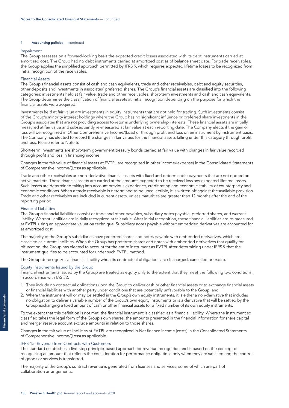 138 PureTech Health plc Annual report and accounts 2020 F in a n ci a l st a te m e n ts Impairment The Group assesses on a forward-looking basis the expected credit losses associated with its debt instruments carried at amortized cost. The Group had no debt instruments carried at amortized cost as of balance sheet date. For trade receivables, the Group applies the simplified approach permitted by IFRS 9, which requires expected lifetime losses to be recognized from initial recognition of the receivables. Financial Assets The Group’s financial assets consist of cash and cash equivalents, trade and other receivables, debt and equity securities, other deposits and investments in associates’ preferred shares. The Group’s financial assets are classified into the following categories: investments held at fair value, trade and other receivables, short-term investments and cash and cash equivalents. The Group determines the classification of financial assets at initial recognition depending on the purpose for which the financial assets were acquired. Investments held at fair value are investments in equity instruments that are not held for trading. Such investments consist of the Group’s minority interest holdings where the Group has no significant influence or preferred share investments in the Group’s associates that are not providing access to returns underlying ownership interests. These financial assets are initially measured at fair value and subsequently re-measured at fair value at each reporting date. The Company elects if the gain or loss will be recognized in Other Comprehensive Income/(Loss) or through profit and loss on an instrument by instrument basis. The Company has elected to record the changes in fair values for the financial assets falling under this category through profit and loss. Please refer to Note 5. Short-term investments are short-term government treasury bonds carried at fair value with changes in fair value recorded through profit and loss in financing income. Changes in the fair value of financial assets at FVTPL are recognized in other income/(expense) in the Consolidated Statements of Comprehensive Income/(Loss) as applicable. Trade and other receivables are non-derivative financial assets with fixed and determinable payments that are not quoted on active markets. These financial assets are carried at the amounts expected to be received less any expected lifetime losses. Such losses are determined taking into account previous experience, credit rating and economic stability of counterparty and economic conditions. When a trade receivable is determined to be uncollectible, it is written off against the available provision. Trade and other receivables are included in current assets, unless maturities are greater than 12 months after the end of the reporting period. Financial Liabilities The Group’s financial liabilities consist of trade and other payables, subsidiary notes payable, preferred shares, and warrant liability. Warrant liabilities are initially recognized at fair value. After initial recognition, these financial liabilities are re-measured at FVTPL using an appropriate valuation technique. Subsidiary notes payable without embedded derivatives are accounted for at amortized cost. The majority of the Group’s subsidiaries have preferred shares and notes payable with embedded derivatives, which are classified as current liabilities. When the Group has preferred shares and notes with embedded derivatives that qualify for bifurcation, the Group has elected to account for the entire instrument as FVTPL after determining under IFRS 9 that the instrument qualifies to be accounted for under such FVTPL method. The Group derecognizes a financial liability when its contractual obligations are discharged, cancelled or expire. Equity Instruments Issued by the Group Financial instruments issued by the Group are treated as equity only to the extent that they meet the following two conditions, in accordance with IAS 32: 1. They include no contractual obligations upon the Group to deliver cash or other financial assets or to exchange financial assets or financial liabilities with another party under conditions that are potentially unfavorable to the Group; and 2. Where the instrument will or may be settled in the Group’s own equity instruments, it is either a non-derivative that includes no obligation to deliver a variable number of the Group’s own equity instruments or is a derivative that will be settled by the Group exchanging a fixed amount of cash or other financial assets for a fixed number of its own equity instruments. To the extent that this definition is not met, the financial instrument is classified as a financial liability. Where the instrument so classified takes the legal form of the Group’s own shares, the amounts presented in the financial information for share capital and merger reserve account exclude amounts in relation to those shares. Changes in the fair value of liabilities at FVTPL are recognized in Net finance income (costs) in the Consolidated Statements of Comprehensive Income/(Loss) as applicable. IFRS 15, Revenue from Contracts with Customers The standard establishes a five-step principle-based approach for revenue recognition and is based on the concept of recognizing an amount that reflects the consideration for performance obligations only when they are satisfied and the control of goods or services is transferred. The majority of the Group’s contract revenue is generated from licenses and services, some of which are part of collaboration arrangements. 1. Accounting policies — continued Notes to the Consolidated Financial Statements — continued