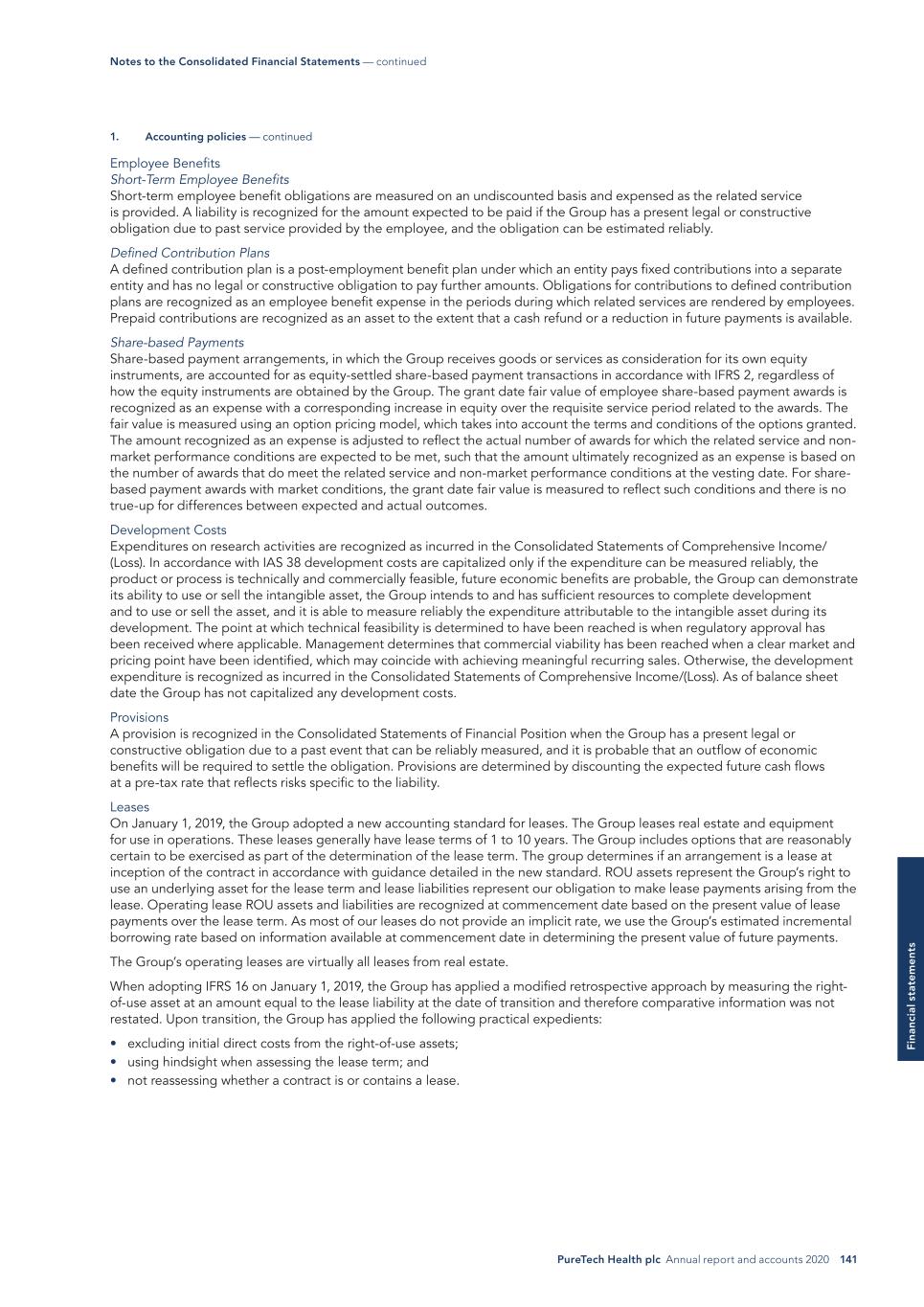 PureTech Health plc Annual report and accounts 2020 141 F in a n ci a l st a te m e n ts Employee Benefits Short-Term Employee Benefits Short-term employee benefit obligations are measured on an undiscounted basis and expensed as the related service is provided. A liability is recognized for the amount expected to be paid if the Group has a present legal or constructive obligation due to past service provided by the employee, and the obligation can be estimated reliably. Defined Contribution Plans A defined contribution plan is a post-employment benefit plan under which an entity pays fixed contributions into a separate entity and has no legal or constructive obligation to pay further amounts. Obligations for contributions to defined contribution plans are recognized as an employee benefit expense in the periods during which related services are rendered by employees. Prepaid contributions are recognized as an asset to the extent that a cash refund or a reduction in future payments is available. Share-based Payments Share-based payment arrangements, in which the Group receives goods or services as consideration for its own equity instruments, are accounted for as equity-settled share-based payment transactions in accordance with IFRS 2, regardless of how the equity instruments are obtained by the Group. The grant date fair value of employee share-based payment awards is recognized as an expense with a corresponding increase in equity over the requisite service period related to the awards. The fair value is measured using an option pricing model, which takes into account the terms and conditions of the options granted. The amount recognized as an expense is adjusted to reflect the actual number of awards for which the related service and non- market performance conditions are expected to be met, such that the amount ultimately recognized as an expense is based on the number of awards that do meet the related service and non-market performance conditions at the vesting date. For share- based payment awards with market conditions, the grant date fair value is measured to reflect such conditions and there is no true-up for differences between expected and actual outcomes. Development Costs Expenditures on research activities are recognized as incurred in the Consolidated Statements of Comprehensive Income/ (Loss). In accordance with IAS 38 development costs are capitalized only if the expenditure can be measured reliably, the product or process is technically and commercially feasible, future economic benefits are probable, the Group can demonstrate its ability to use or sell the intangible asset, the Group intends to and has sufficient resources to complete development and to use or sell the asset, and it is able to measure reliably the expenditure attributable to the intangible asset during its development. The point at which technical feasibility is determined to have been reached is when regulatory approval has been received where applicable. Management determines that commercial viability has been reached when a clear market and pricing point have been identified, which may coincide with achieving meaningful recurring sales. Otherwise, the development expenditure is recognized as incurred in the Consolidated Statements of Comprehensive Income/(Loss). As of balance sheet date the Group has not capitalized any development costs. Provisions A provision is recognized in the Consolidated Statements of Financial Position when the Group has a present legal or constructive obligation due to a past event that can be reliably measured, and it is probable that an outflow of economic benefits will be required to settle the obligation. Provisions are determined by discounting the expected future cash flows at a pre-tax rate that reflects risks specific to the liability. Leases On January 1, 2019, the Group adopted a new accounting standard for leases. The Group leases real estate and equipment for use in operations. These leases generally have lease terms of 1 to 10 years. The Group includes options that are reasonably certain to be exercised as part of the determination of the lease term. The group determines if an arrangement is a lease at inception of the contract in accordance with guidance detailed in the new standard. ROU assets represent the Group’s right to use an underlying asset for the lease term and lease liabilities represent our obligation to make lease payments arising from the lease. Operating lease ROU assets and liabilities are recognized at commencement date based on the present value of lease payments over the lease term. As most of our leases do not provide an implicit rate, we use the Group’s estimated incremental borrowing rate based on information available at commencement date in determining the present value of future payments. The Group’s operating leases are virtually all leases from real estate. When adopting IFRS 16 on January 1, 2019, the Group has applied a modified retrospective approach by measuring the right- of-use asset at an amount equal to the lease liability at the date of transition and therefore comparative information was not restated. Upon transition, the Group has applied the following practical expedients: • excluding initial direct costs from the right-of-use assets; • using hindsight when assessing the lease term; and • not reassessing whether a contract is or contains a lease. 1. Accounting policies — continued Notes to the Consolidated Financial Statements — continued