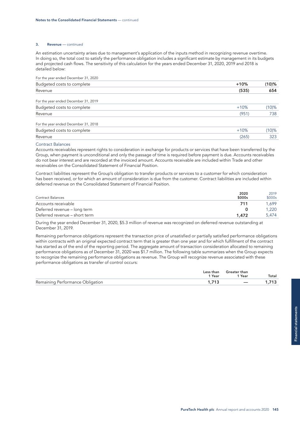 PureTech Health plc Annual report and accounts 2020 145 F in a n ci a l st a te m e n ts An estimation uncertainty arises due to management’s application of the inputs method in recognizing revenue overtime. In doing so, the total cost to satisfy the performance obligation includes a significant estimate by management in its budgets and projected cash flows. The sensitivity of this calculation for the years ended December 31, 2020, 2019 and 2018 is detailed below: For the year ended December 31, 2020 Budgeted costs to complete +10% (10)% Revenue (535) 654 For the year ended December 31, 2019 Budgeted costs to complete +10% (10)% Revenue (951) 738 For the year ended December 31, 2018 Budgeted costs to complete +10% (10)% Revenue (265) 323 Contract Balances Accounts receivables represent rights to consideration in exchange for products or services that have been transferred by the Group, when payment is unconditional and only the passage of time is required before payment is due. Accounts receivables do not bear interest and are recorded at the invoiced amount. Accounts receivable are included within Trade and other receivables on the Consolidated Statement of Financial Position. Contract liabilities represent the Group’s obligation to transfer products or services to a customer for which consideration has been received, or for which an amount of consideration is due from the customer. Contract liabilities are included within deferred revenue on the Consolidated Statement of Financial Position. Contract Balances 2020 $000s 2019 $000s Accounts receivable 711 1,699 Deferred revenue – long term 0 1,220 Deferred revenue – short term 1,472 5,474 During the year ended December 31, 2020, $5.3 million of revenue was recognized on deferred revenue outstanding at December 31, 2019. Remaining performance obligations represent the transaction price of unsatisfied or partially satisfied performance obligations within contracts with an original expected contract term that is greater than one year and for which fulfillment of the contract has started as of the end of the reporting period. The aggregate amount of transaction consideration allocated to remaining performance obligations as of December 31, 2020 was $1.7 million. The following table summarizes when the Group expects to recognize the remaining performance obligations as revenue. The Group will recognize revenue associated with these performance obligations as transfer of control occurs: Less than 1 Year Greater than 1 Year Total Remaining Performance Obligation 1,713 — 1,713 Notes to the Consolidated Financial Statements — continued 3. Revenue — continued