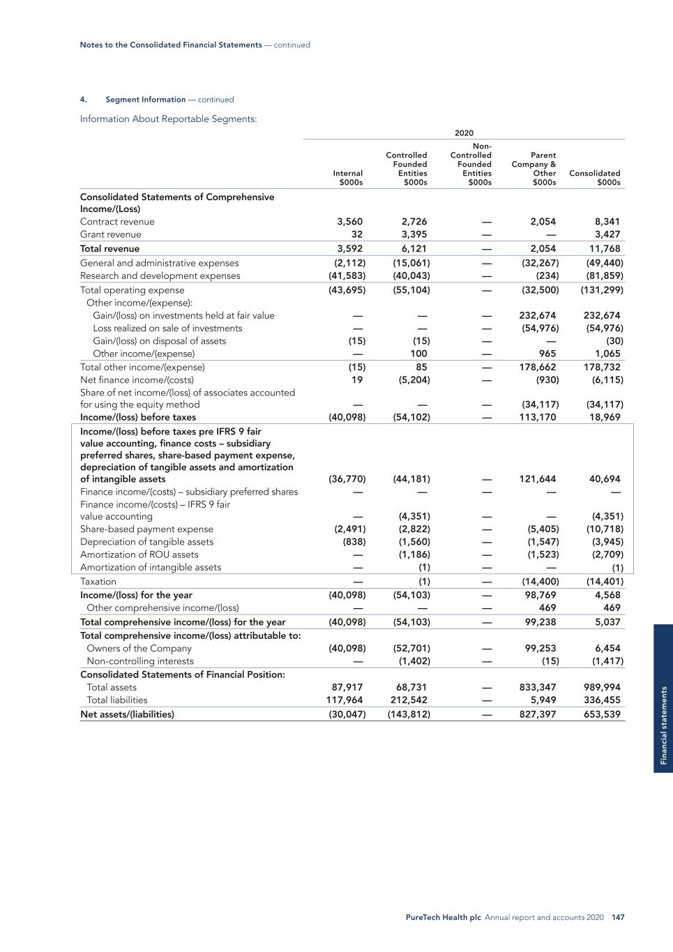 PureTech Health plc Annual report and accounts 2020 147 F in a n ci a l st a te m e n ts Information About Reportable Segments: 2020 Internal $000s Controlled Founded Entities $000s Non- Controlled Founded Entities $000s Parent Company & Other $000s Consolidated $000s Consolidated Statements of Comprehensive Income/(Loss) Contract revenue 3,560 2,726 — 2,054 8,341 Grant revenue 32 3,395 — — 3,427 Total revenue 3,592 6,121 — 2,054 11,768 General and administrative expenses (2,112) (15,061) — (32,267) (49,440) Research and development expenses (41,583) (40,043) — (234) (81,859) Total operating expense (43,695) (55,104) — (32,500) (131,299) Other income/(expense): Gain/(loss) on investments held at fair value — — — 232,674 232,674 Loss realized on sale of investments — — — (54,976) (54,976) Gain/(loss) on disposal of assets (15) (15) — — (30) Other income/(expense) — 100 — 965 1,065 Total other income/(expense) (15) 85 — 178,662 178,732 Net finance income/(costs) 19 (5,204) — (930) (6,115) Share of net income/(loss) of associates accounted for using the equity method — — — (34,117) (34,117) Income/(loss) before taxes (40,098) (54,102) — 113,170 18,969 Income/(loss) before taxes pre IFRS 9 fair value accounting, finance costs – subsidiary preferred shares, share-based payment expense, depreciation of tangible assets and amortization of intangible assets (36,770) (44,181) — 121,644 40,694 Finance income/(costs) – subsidiary preferred shares — — — — — Finance income/(costs) – IFRS 9 fair value accounting — (4,351) — — (4,351) Share-based payment expense (2,491) (2,822) — (5,405) (10,718) Depreciation of tangible assets (838) (1,560) — (1,547) (3,945) Amortization of ROU assets — (1,186) — (1,523) (2,709) Amortization of intangible assets — (1) — — (1) Taxation — (1) — (14,400) (14,401) Income/(loss) for the year (40,098) (54,103) — 98,769 4,568 Other comprehensive income/(loss) — — — 469 469 Total comprehensive income/(loss) for the year (40,098) (54,103) — 99,238 5,037 Total comprehensive income/(loss) attributable to: Owners of the Company (40,098) (52,701) — 99,253 6,454 Non-controlling interests — (1,402) — (15) (1,417) Consolidated Statements of Financial Position: Total assets 87,917 68,731 — 833,347 989,994 Total liabilities 117,964 212,542 — 5,949 336,455 Net assets/(liabilities) (30,047) (143,812) — 827,397 653,539 Notes to the Consolidated Financial Statements — continued 4. Segment Information — continued