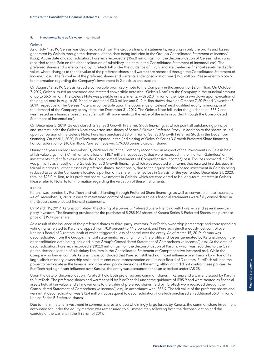 PureTech Health plc Annual report and accounts 2020 151 F in a n ci a l st a te m e n ts Gelesis As of July 1, 2019, Gelesis was deconsolidated from the Group’s financial statements, resulting in only the profits and losses generated by Gelesis through the deconsolidation date being included in the Group’s Consolidated Statement of Income/ (Loss). At the date of deconsolidation, PureTech recorded a $156.0 million gain on the deconsolidation of Gelesis, which was recorded to the Gain on the deconsolidation of subsidiary line item in the Consolidated Statement of Income/(Loss). The preferred shares and warrants held by PureTech fall under the guidance of IFRS 9 and are treated as financial assets held at fair value, where changes to the fair value of the preferred shares and warrant are recorded through the Consolidated Statement of Income/(Loss). The fair value of the preferred shares and warrants at deconsolidation was $49.2 million. Please refer to Note 6 for information regarding the Company’s investment in Gelesis as an associate. On August 12, 2019, Gelesis issued a convertible promissory note to the Company in the amount of $2.0 million. On October 7, 2019, Gelesis issued an amended and restated convertible note (the “Gelesis Note”) to the Company in the principal amount of up to $6.5 million. The Gelesis Note was payable in installments, with $2.0 million of the note drawn down upon execution of the original note in August 2019 and an additional $3.3 million and $1.2 million drawn down on October 7, 2019 and November 5, 2019, respectively. The Gelesis Note was convertible upon the occurrence of Gelesis’ next qualified equity financing, or at the demand of the Company at any date after December 31, 2019. The Gelesis Note fell under the guidance of IFRS 9 and was treated as a financial asset held at fair with all movements to the value of the note recorded through the Consolidated Statement of Income/(Loss). On December 5, 2019, Gelesis closed its Series 3 Growth Preferred Stock financing, at which point all outstanding principal and interest under the Gelesis Note converted into shares of Series 3 Growth Preferred Stock. In addition to the shares issued upon conversion of the Gelesis Note, PureTech purchased $8.0 million of Series 3 Growth Preferred Stock in the December financing. On April 1, 2020, PureTech participated in the 2nd closing of Gelesis’s Series 3 Growth Preferred Share financing. For consideration of $10.0 million, PureTech received 579,038 Series 3 Growth shares. During the years ended December 31, 2020 and 2019, the Company recognized in respect of the investments in Gelesis held at fair value a gain of $7.1 million and a loss of $18.7 million, respectively, that were recorded in the line item Gain/(loss) on investments held at fair value within the Consolidated Statements of Comprehensive Income/(Loss). The loss recorded in 2019 was primarily as a result of the Gelesis Series 3 Growth financing, which was executed with terms that resulted in a decrease in fair value across all other classes of preferred shares. Additionally, due to the equity method based investment in Gelesis being reduced to zero, the Company allocated a portion of its share in the net loss in Gelesis for the year ended December 31, 2020, totaling $23.0 million, to its preferred share investments in Gelesis, which are considered to be long-term interests in Gelesis. Please refer to Note 16 for information regarding the valuation of these instruments. Karuna Karuna was founded by PureTech and raised funding through Preferred Share financings as well as convertible note issuances. As of December 31, 2018, PureTech maintained control of Karuna and Karuna’s financial statements were fully consolidated in the Group’s consolidated financial statements. On March 15, 2019, Karuna completed the closing of a Series B Preferred Share financing with PureTech and several new third party investors. The financing provided for the purchase of 5,285,102 shares of Karuna Series B Preferred Shares at a purchase price of $15.14 per share. As a result of the issuance of the preferred shares to third-party investors, PureTech’s ownership percentage and corresponding voting rights related to Karuna dropped from 70.9 percent to 44.3 percent, and PureTech simultaneously lost control over Karuna’s Board of Directors, both of which triggered a loss of control over the entity. As of March 15, 2019, Karuna was deconsolidated from the Group’s financial statements, resulting in only the profits and losses generated by Karuna through the deconsolidation date being included in the Group’s Consolidated Statement of Comprehensive Income/(Loss). At the date of deconsolidation, PureTech recorded a $102.0 million gain on the deconsolidation of Karuna, which was recorded to the Gain on the deconsolidation of subsidiary line item in the Consolidated Statement of Comprehensive Income/(Loss). While the Company no longer controls Karuna, it was concluded that PureTech still had significant influence over Karuna by virtue of its large, albeit minority, ownership stake and its continued representation on Karuna’s Board of Directors. PureTech still had the power to participate in the financial and operating policy decisions of the entity, although it did not control these policies. As PureTech had significant influence over Karuna, the entity was accounted for as an associate under IAS 28. Upon the date of deconsolidation, PureTech held both preferred and common shares in Karuna and a warrant issued by Karuna to PureTech. The preferred shares and warrant held by PureTech fell under the guidance of IFRS 9 and were treated as financial assets held at fair value, and all movements to the value of preferred shares held by PureTech were recorded through the Consolidated Statement of Comprehensive Income/(Loss), in accordance with IFRS 9. The fair value of the preferred shares and warrant at deconsolidation was $72.4 mi