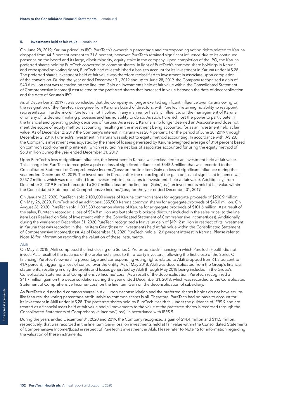 152 PureTech Health plc Annual report and accounts 2020 F in a n ci a l st a te m e n ts On June 28, 2019, Karuna priced its IPO. PureTech’s ownership percentage and corresponding voting rights related to Karuna dropped from 44.3 percent percent to 31.6 percent; however, PureTech retained significant influence due to its continued presence on the board and its large, albeit minority, equity stake in the company. Upon completion of the IPO, the Karuna preferred shares held by PureTech converted to common shares. In light of PureTech’s common share holdings in Karuna and corresponding voting rights, PureTech had re-established a basis to account for its investment in Karuna under IAS 28. The preferred shares investment held at fair value was therefore reclassified to investment in associate upon completion of the conversion. During the year ended December 31, 2019 and up to June 28, 2019, the Company recognized a gain of $40.6 million that was recorded on the line item Gain on investments held at fair value within the Consolidated Statement of Comprehensive Income/(Loss) related to the preferred shares that increased in value between the date of deconsolidation and the date of Karuna’s IPO. As of December 2, 2019 it was concluded that the Company no longer exerted significant influence over Karuna owing to the resignation of the PureTech designee from Karuna’s board of directors, with PureTech retaining no ability to reappoint representation. Furthermore, PureTech is not involved in any manner, or has any influence, on the management of Karuna, or on any of its decision making processes and has no ability to do so. As such, PureTech lost the power to participate in the financial and operating policy decisions of Karuna. As a result, Karuna is no longer deemed an Associate and does not meet the scope of equity method accounting, resulting in the investment being accounted for as an investment held at fair value. As of December 2, 2019 the Company’s interest in Karuna was 28.4 percent. For the period of June 28, 2019 through December 2, 2019, PureTech’s investment in Karuna was subject to equity method accounting. In accordance with IAS 28, the Company’s investment was adjusted by the share of losses generated by Karuna (weighted average of 31.4 percent based on common stock ownership interest), which resulted in a net loss of associates accounted for using the equity method of $6.3 million during the year ended December 31, 2019. Upon PureTech’s loss of significant influence, the investment in Karuna was reclassified to an investment held at fair value. This change led PureTech to recognize a gain on loss of significant influence of $445.6 million that was recorded to the Consolidated Statement of Comprehensive Income/(Loss) on the line item Gain on loss of significant influence during the year ended December 31, 2019. The investment in Karuna after the recording of the gain on loss of significant influence was $557.2 million, which was reclassified from Investments in associates to Investments held at fair value. Additionally, from December 2, 2019 PureTech recorded a $0.7 million loss on the line item Gain/(loss) on investments held at fair value within the Consolidated Statement of Comprehensive Income/(Loss) for the year ended December 31, 2019. On January 22, 2020, PureTech sold 2,100,000 shares of Karuna common shares for aggregate proceeds of $200.9 million. On May 26, 2020, PureTech sold an additional 555,500 Karuna common shares for aggregate proceeds of $45.0 million. On August 26, 2020, PureTech sold 1,333,333 common shares of Karuna for aggregate proceeds of $101.6 million. As a result of the sales, Puretech recorded a loss of $54.8 million attributable to blockage discount included in the sales price, to the line item Loss Realized on Sale of Investment within the Consolidated Statement of Comprehensive Income/(Loss). Additionally, during the year ended December 31, 2020 PureTech recognized a fair value gain of $191.2 million in respect of its investment in Karuna that was recorded in the line item Gain/(loss) on investments held at fair value within the Consolidated Statement of Comprehensive Income/(Loss). As of December 31, 2020 PureTech held a 12.6 percent interest in Karuna. Please refer to Note 16 for information regarding the valuation of these instruments. Akili On May 8, 2018, Akili completed the first closing of a Series C Preferred Stock financing in which PureTech Health did not invest. As a result of the issuance of the preferred shares to third-party investors, following the first close of the Series C financing, PureTech’s ownership percentage and corresponding voting rights related to Akili dropped from 61.8 percent to 41.9 percent, triggering a loss of control over the entity. As of May 2018, Akili was deconsolidated from the Group’s financial statements, resulting in only the profits and losses generated by Akili through May 2018 being included in the Group’s Consolidated Statements of Comprehensive Income/(Loss). As a result of the deconsolidation, PureTech recognized a $41.7 million gain on the deconsolidation during the year ended December 31, 2018, which was recorded to the Consolidated Statement of Comprehensive Income/(Loss) on the line item Gain on the deconsolidation of subsidiary. As PureTech did not hold common shares in Akili upon deconsolidation and the preferred shares it holds do not have equity- like features, the voting percentage attributable to common shares is nil. Therefore, PureTech had no basis to account for its investment in Akili under IAS 28. The preferred shares held by PureTech Health fall under the guidance of IFRS 9 and are treated as a financial asset held at fair value and all movements to the value of the preferred shares is recorded through the Consolidated Statements of Comprehensive Income/(Loss), in accordance with IFRS 9. During the years ended December 31, 2020 and 2019, the Company recognized a gain
