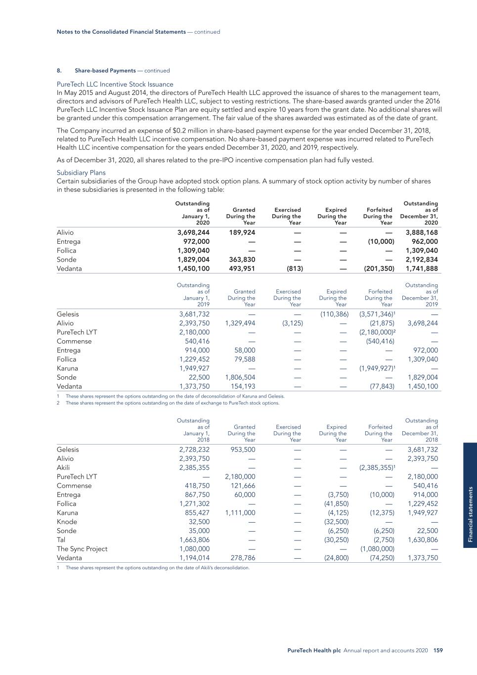 PureTech Health plc Annual report and accounts 2020 159 F in a n ci a l st a te m e n ts PureTech LLC Incentive Stock Issuance In May 2015 and August 2014, the directors of PureTech Health LLC approved the issuance of shares to the management team, directors and advisors of PureTech Health LLC, subject to vesting restrictions. The share-based awards granted under the 2016 PureTech LLC Incentive Stock Issuance Plan are equity settled and expire 10 years from the grant date. No additional shares will be granted under this compensation arrangement. The fair value of the shares awarded was estimated as of the date of grant. The Company incurred an expense of $0.2 million in share-based payment expense for the year ended December 31, 2018, related to PureTech Health LLC incentive compensation. No share-based payment expense was incurred related to PureTech Health LLC incentive compensation for the years ended December 31, 2020, and 2019, respectively. As of December 31, 2020, all shares related to the pre-IPO incentive compensation plan had fully vested. Subsidiary Plans Certain subsidiaries of the Group have adopted stock option plans. A summary of stock option activity by number of shares in these subsidiaries is presented in the following table: Outstanding as of January 1, 2020 Granted During the Year Exercised During the Year Expired During the Year Forfeited During the Year Outstanding as of December 31, 2020 Alivio 3,698,244 189,924 — — — 3,888,168 Entrega 972,000 — — — (10,000) 962,000 Follica 1,309,040 — — — — 1,309,040 Sonde 1,829,004 363,830 — — — 2,192,834 Vedanta 1,450,100 493,951 (813) — (201,350) 1,741,888 Outstanding as of January 1, 2019 Granted During the Year Exercised During the Year Expired During the Year Forfeited During the Year Outstanding as of December 31, 2019 Gelesis 3,681,732 — — (110,386) (3,571,346)¹ — Alivio 2,393,750 1,329,494 (3,125) — (21,875) 3,698,244 PureTech LYT 2,180,000 — — — (2,180,000)² — Commense 540,416 — — — (540,416) — Entrega 914,000 58,000 — — — 972,000 Follica 1,229,452 79,588 — — — 1,309,040 Karuna 1,949,927 — — — (1,949,927)¹ — Sonde 22,500 1,806,504 — — — 1,829,004 Vedanta 1,373,750 154,193 — — (77,843) 1,450,100 1 These shares represent the options outstanding on the date of deconsolidation of Karuna and Gelesis. 2 These shares represent the options outstanding on the date of exchange to PureTech stock options. Outstanding as of January 1, 2018 Granted During the Year Exercised During the Year Expired During the Year Forfeited During the Year Outstanding as of December 31, 2018 Gelesis 2,728,232 953,500 — — — 3,681,732 Alivio 2,393,750 — — — — 2,393,750 Akili 2,385,355 — — — (2,385,355)¹ — PureTech LYT — 2,180,000 — — — 2,180,000 Commense 418,750 121,666 — — — 540,416 Entrega 867,750 60,000 — (3,750) (10,000) 914,000 Follica 1,271,302 — — (41,850) — 1,229,452 Karuna 855,427 1,111,000 — (4,125) (12,375) 1,949,927 Knode 32,500 — — (32,500) — — Sonde 35,000 — — (6,250) (6,250) 22,500 Tal 1,663,806 — — (30,250) (2,750) 1,630,806 The Sync Project 1,080,000 — — — (1,080,000) — Vedanta 1,194,014 278,786 — (24,800) (74,250) 1,373,750 1 These shares represent the options outstanding on the date of Akili’s deconsolidation. 8. Share-based Payments — continued Notes to the Consolidated Financial Statements — continued