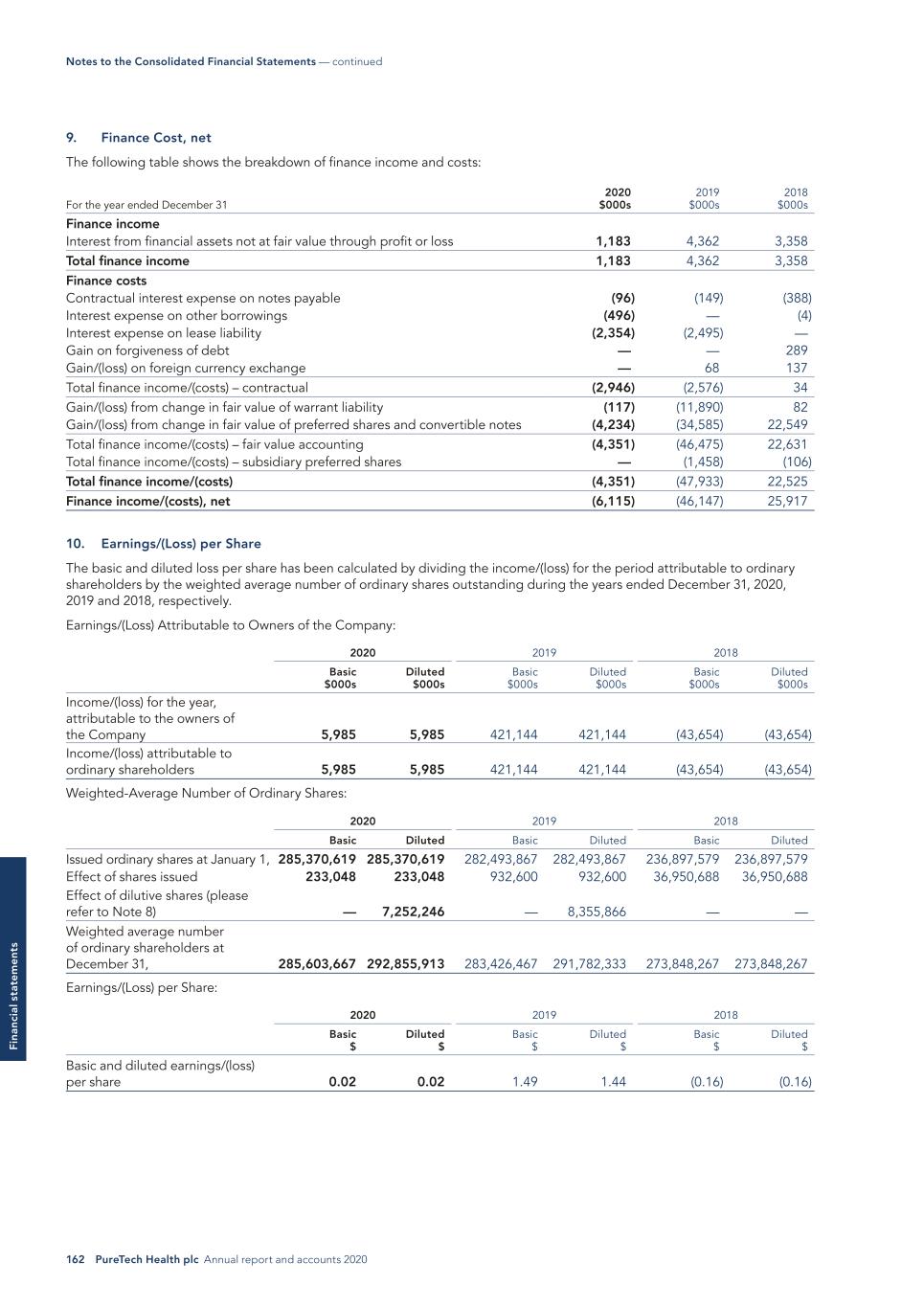 162 PureTech Health plc Annual report and accounts 2020 F in a n ci a l st a te m e n ts 9. Finance Cost, net The following table shows the breakdown of finance income and costs: 2020 $000s 2019 $000s 2018 $000sFor the year ended December 31 Finance income Interest from financial assets not at fair value through profit or loss 1,183 4,362 3,358 Total finance income 1,183 4,362 3,358 Finance costs Contractual interest expense on notes payable (96) (149) (388) Interest expense on other borrowings (496) — (4) Interest expense on lease liability (2,354) (2,495) — Gain on forgiveness of debt — — 289 Gain/(loss) on foreign currency exchange — 68 137 Total finance income/(costs) – contractual (2,946) (2,576) 34 Gain/(loss) from change in fair value of warrant liability (117) (11,890) 82 Gain/(loss) from change in fair value of preferred shares and convertible notes (4,234) (34,585) 22,549 Total finance income/(costs) – fair value accounting (4,351) (46,475) 22,631 Total finance income/(costs) – subsidiary preferred shares — (1,458) (106) Total finance income/(costs) (4,351) (47,933) 22,525 Finance income/(costs), net (6,115) (46,147) 25,917 Notes to the Consolidated Financial Statements — continued 10. Earnings/(Loss) per Share The basic and diluted loss per share has been calculated by dividing the income/(loss) for the period attributable to ordinary shareholders by the weighted average number of ordinary shares outstanding during the years ended December 31, 2020, 2019 and 2018, respectively. Earnings/(Loss) Attributable to Owners of the Company: 2020 2019 2018 Basic $000s Diluted $000s Basic $000s Diluted $000s Basic $000s Diluted $000s Income/(loss) for the year, attributable to the owners of the Company 5,985 5,985 421,144 421,144 (43,654) (43,654) Income/(loss) attributable to ordinary shareholders 5,985 5,985 421,144 421,144 (43,654) (43,654) Weighted-Average Number of Ordinary Shares: 2020 2019 2018 Basic Diluted Basic Diluted Basic Diluted Issued ordinary shares at January 1, 285,370,619 285,370,619 282,493,867 282,493,867 236,897,579 236,897,579 Effect of shares issued 233,048 233,048 932,600 932,600 36,950,688 36,950,688 Effect of dilutive shares (please refer to Note 8) — 7,252,246 — 8,355,866 — — Weighted average number of ordinary shareholders at December 31, 285,603,667 292,855,913 283,426,467 291,782,333 273,848,267 273,848,267 Earnings/(Loss) per Share: 2020 2019 2018 Basic $ Diluted $ Basic $ Diluted $ Basic $ Diluted $ Basic and diluted earnings/(loss) per share 0.02 0.02 1.49 1.44 (0.16) (0.16)