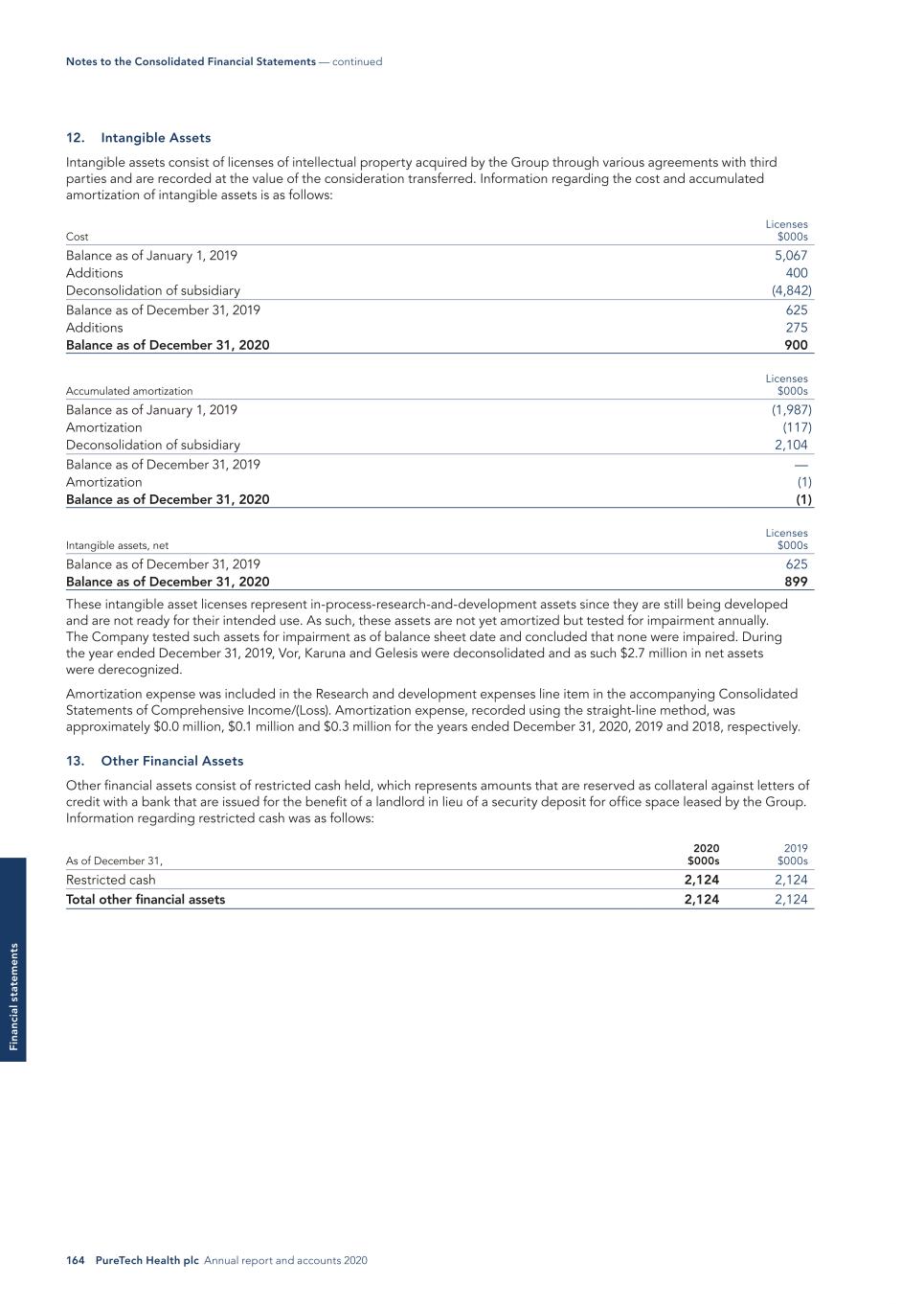 164 PureTech Health plc Annual report and accounts 2020 F in a n ci a l st a te m e n ts 12. Intangible Assets Intangible assets consist of licenses of intellectual property acquired by the Group through various agreements with third parties and are recorded at the value of the consideration transferred. Information regarding the cost and accumulated amortization of intangible assets is as follows: Cost Licenses $000s Balance as of January 1, 2019 5,067 Additions 400 Deconsolidation of subsidiary (4,842) Balance as of December 31, 2019 625 Additions 275 Balance as of December 31, 2020 900 Accumulated amortization Licenses $000s Balance as of January 1, 2019 (1,987) Amortization (117) Deconsolidation of subsidiary 2,104 Balance as of December 31, 2019 — Amortization (1) Balance as of December 31, 2020 (1) Intangible assets, net Licenses $000s Balance as of December 31, 2019 625 Balance as of December 31, 2020 899 These intangible asset licenses represent in-process-research-and-development assets since they are still being developed and are not ready for their intended use. As such, these assets are not yet amortized but tested for impairment annually. The Company tested such assets for impairment as of balance sheet date and concluded that none were impaired. During the year ended December 31, 2019, Vor, Karuna and Gelesis were deconsolidated and as such $2.7 million in net assets were derecognized. Amortization expense was included in the Research and development expenses line item in the accompanying Consolidated Statements of Comprehensive Income/(Loss). Amortization expense, recorded using the straight-line method, was approximately $0.0 million, $0.1 million and $0.3 million for the years ended December 31, 2020, 2019 and 2018, respectively. Notes to the Consolidated Financial Statements — continued 13. Other Financial Assets Other financial assets consist of restricted cash held, which represents amounts that are reserved as collateral against letters of credit with a bank that are issued for the benefit of a landlord in lieu of a security deposit for office space leased by the Group. Information regarding restricted cash was as follows: 2020 $000s 2019 $000sAs of December 31, Restricted cash 2,124 2,124 Total other financial assets 2,124 2,124