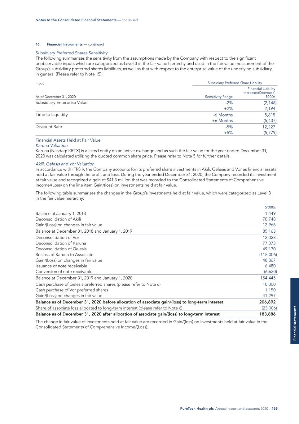 PureTech Health plc Annual report and accounts 2020 169 F in a n ci a l st a te m e n ts Subsidiary Preferred Shares Sensitivity The following summarizes the sensitivity from the assumptions made by the Company with respect to the significant unobservable inputs which are categorized as Level 3 in the fair value hierarchy and used in the fair value measurement of the Group’s subsidiary preferred shares liabilities, as well as that with respect to the enterprise value of the underlying subsidiary in general (Please refer to Note 15): Input Subsidiary Preferred Share Liability As of December 31, 2020 Sensitivity Range Financial Liability Increase/(Decrease) $000s Subsidiary Enterprise Value -2% (2,146) +2% 2,194 Time to Liquidity ’-6 Months 5,815 ’+6 Months (5,437) Discount Rate -5% 12,227 +5% (5,779) Financial Assets Held at Fair Value Karuna Valuation Karuna (Nasdaq: KRTX) is a listed entity on an active exchange and as such the fair value for the year ended December 31, 2020 was calculated utilizing the quoted common share price. Please refer to Note 5 for further details. Akili, Gelesis and Vor Valuation In accordance with IFRS 9, the Company accounts for its preferred share investments in Akili, Gelesis and Vor as financial assets held at fair value through the profit and loss. During the year ended December 31, 2020, the Company recorded its investment at fair value and recognized a gain of $41.3 million that was recorded to the Consolidated Statements of Comprehensive Income/(Loss) on the line item Gain/(loss) on investments held at fair value. The following table summarizes the changes in the Group’s investments held at fair value, which were categorized as Level 3 in the fair value hierarchy: $’000s Balance at January 1, 2018 1,449 Deconsolidation of Akili 70,748 Gain/(Loss) on changes in fair value 12,966 Balance at December 31, 2018 and January 1, 2019 85,163 Deconsolidation of Vor 12,028 Deconsolidation of Karuna 77,373 Deconsolidation of Gelesis 49,170 Reclass of Karuna to Associate (118,006) Gain/(Loss) on changes in fair value 48,867 Issuance of note receivable 6,480 Conversion of note receivable (6,630) Balance at December 31, 2019 and January 1, 2020 154,445 Cash purchase of Gelesis preferred shares (please refer to Note 6) 10,000 Cash purchase of Vor preferred shares 1,150 Gain/(Loss) on changes in fair value 41,297 Balance as of December 31, 2020 before allocation of associate gain/(loss) to long-term interest 206,892 Share of associate loss allocated to long-term interest (please refer to Note 6) (23,006) Balance as of December 31, 2020 after allocation of associate gain/(loss) to long-term interest 183,886 The change in fair value of investments held at fair value are recorded in Gain/(loss) on investments held at fair value in the Consolidated Statements of Comprehensive Income/(Loss). 16. Financial Instruments — continued Notes to the Consolidated Financial Statements — continued