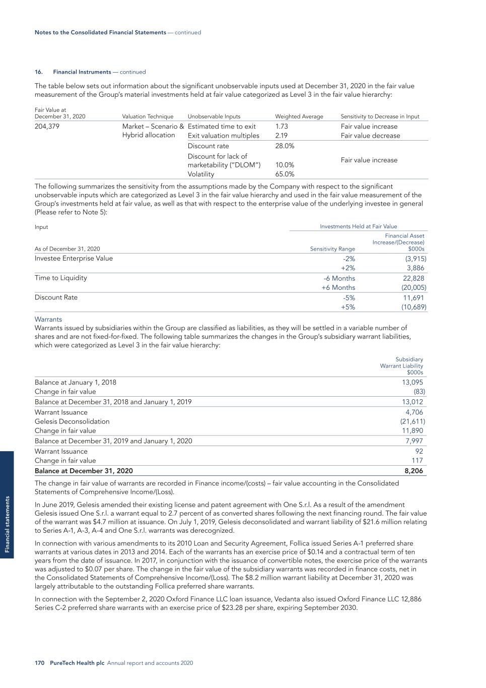 170 PureTech Health plc Annual report and accounts 2020 F in a n ci a l st a te m e n ts The table below sets out information about the significant unobservable inputs used at December 31, 2020 in the fair value measurement of the Group’s material investments held at fair value categorized as Level 3 in the fair value hierarchy: Fair Value at December 31, 2020 Valuation Technique Unobservable Inputs Weighted Average Sensitivity to Decrease in Input 204,379 Market – Scenario & Hybrid allocation Estimated time to exit 1.73 Fair value increase Exit valuation multiples 2.19 Fair value decrease Discount rate 28.0% Fair value increaseDiscount for lack of marketability (“DLOM”) 10.0% Volatility 65.0% The following summarizes the sensitivity from the assumptions made by the Company with respect to the significant unobservable inputs which are categorized as Level 3 in the fair value hierarchy and used in the fair value measurement of the Group’s investments held at fair value, as well as that with respect to the enterprise value of the underlying investee in general (Please refer to Note 5): Input Investments Held at Fair Value As of December 31, 2020 Sensitivity Range Financial Asset Increase/(Decrease) $000s Investee Enterprise Value -2% (3,915) +2% 3,886 Time to Liquidity ’-6 Months 22,828 ’+6 Months (20,005) Discount Rate -5% 11,691 +5% (10,689) Warrants Warrants issued by subsidiaries within the Group are classified as liabilities, as they will be settled in a variable number of shares and are not fixed-for-fixed. The following table summarizes the changes in the Group’s subsidiary warrant liabilities, which were categorized as Level 3 in the fair value hierarchy: Subsidiary Warrant Liability $000s Balance at January 1, 2018 13,095 Change in fair value (83) Balance at December 31, 2018 and January 1, 2019 13,012 Warrant Issuance 4,706 Gelesis Deconsolidation (21,611) Change in fair value 11,890 Balance at December 31, 2019 and January 1, 2020 7,997 Warrant Issuance 92 Change in fair value 117 Balance at December 31, 2020 8,206 The change in fair value of warrants are recorded in Finance income/(costs) – fair value accounting in the Consolidated Statements of Comprehensive Income/(Loss). In June 2019, Gelesis amended their existing license and patent agreement with One S.r.l. As a result of the amendment Gelesis issued One S.r.l. a warrant equal to 2.7 percent of as converted shares following the next financing round. The fair value of the warrant was $4.7 million at issuance. On July 1, 2019, Gelesis deconsolidated and warrant liability of $21.6 million relating to Series A-1, A-3, A-4 and One S.r.l. warrants was derecognized. In connection with various amendments to its 2010 Loan and Security Agreement, Follica issued Series A-1 preferred share warrants at various dates in 2013 and 2014. Each of the warrants has an exercise price of $0.14 and a contractual term of ten years from the date of issuance. In 2017, in conjunction with the issuance of convertible notes, the exercise price of the warrants was adjusted to $0.07 per share. The change in the fair value of the subsidiary warrants was recorded in finance costs, net in the Consolidated Statements of Comprehensive Income/(Loss). The $8.2 million warrant liability at December 31, 2020 was largely attributable to the outstanding Follica preferred share warrants. In connection with the September 2, 2020 Oxford Finance LLC loan issuance, Vedanta also issued Oxford Finance LLC 12,886 Series C-2 preferred share warrants with an exercise price of $23.28 per share, expiring September 2030. 16. Financial Instruments — continued Notes to the Consolidated Financial Statements — continued