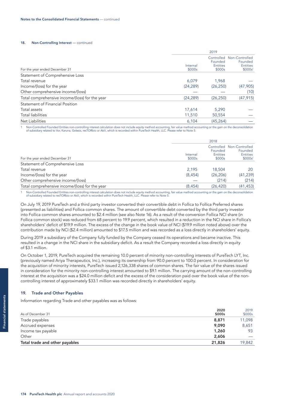 174 PureTech Health plc Annual report and accounts 2020 F in a n ci a l st a te m e n ts 19. Trade and Other Payables Information regarding Trade and other payables was as follows: 2020 $000s 2019 $000sAs of December 31 Trade payables 8,871 11,098 Accrued expenses 9,090 8,651 Income tax payable 1,260 93 Other 2,606 — Total trade and other payables 21,826 19,842 2019 For the year ended December 31 Internal $000s Controlled Founded Entities $000s Non-Controlled Founded Entities $000s1 Statement of Comprehensive Loss Total revenue 6,079 1,968 — Income/(loss) for the year (24,289) (26,250) (47,905) Other comprehensive income/(loss) — — (10) Total comprehensive income/(loss) for the year (24,289) (26,250) (47,915) Statement of Financial Position Total assets 17,614 5,290 — Total liabilities 11,510 50,554 — Net Liabilities 6,104 (45,264) — 1 Non-Controlled Founded Entities non-controlling interest calculation does not include equity method accounting, fair value method accounting or the gain on the deconsolidation of subsidiary related to Vor, Karuna, Gelesis, resTORbio or Akili, which is recorded within PureTech Health, LLC. Please refer to Note 5. 2018 For the year ended December 31 Internal $000s Controlled Founded Entities $000s Non-Controlled Founded Entities $000s1 Statement of Comprehensive Loss Total revenue 2,195 18,504 20 Income/(loss) for the year (8,454) (26,206) (41,239) Other comprehensive income/(loss) — (214) (214) Total comprehensive income/(loss) for the year (8,454) (26,420) (41,453) 1 Non-Controlled Founded Entities non-controlling interest calculation does not include equity method accounting, fair value method accounting or the gain on the deconsolidation of subsidiary related to resTORbio or Akili, which is recorded within PureTech Health, LLC. Please refer to Note 5. On July 19, 2019 PureTech and a third party investor converted their convertible debt in Follica to Follica Preferred shares (presented as liabilities) and Follica common shares. The amount of convertible debt converted by the third party investor into Follica common shares amounted to $2.4 million (see also Note 16). As a result of the conversion Follica NCI share (in Follica common stock) was reduced from 68 percent to 19.9 percent, which resulted in a reduction in the NCI share in Follica’s shareholders’ deficit of $19.9 million. The excess of the change in the book value of NCI ($19.9 million noted above) over the contribution made by NCI ($2.4 million) amounted to $17.5 million and was recorded as a loss directly in shareholders’ equity. During 2019 a subsidiary of the Company fully funded by the Company ceased its operations and became inactive. This resulted in a change in the NCI share in the subsidiary deficit. As a result the Company recorded a loss directly in equity of $3.1 million. On October 1, 2019, PureTech acquired the remaining 10.0 percent of minority non-controlling interests of PureTech LYT, Inc. (previously named Ariya Therapeutics, Inc.), increasing its ownership from 90.0 percent to 100.0 percent. In consideration for the acquisition of minority interests, PureTech issued 2,126,338 shares of common shares. The fair value of the shares issued in consideration for the minority non-controlling interest amounted to $9.1 million. The carrying amount of the non-controlling interest at the acquisition was a $24.0 million deficit and the excess of the consideration paid over the book value of the non- controlling interest of approximately $33.1 million was recorded directly in shareholders’ equity. 18. Non-Controlling Interest — continued Notes to the Consolidated Financial Statements — continued