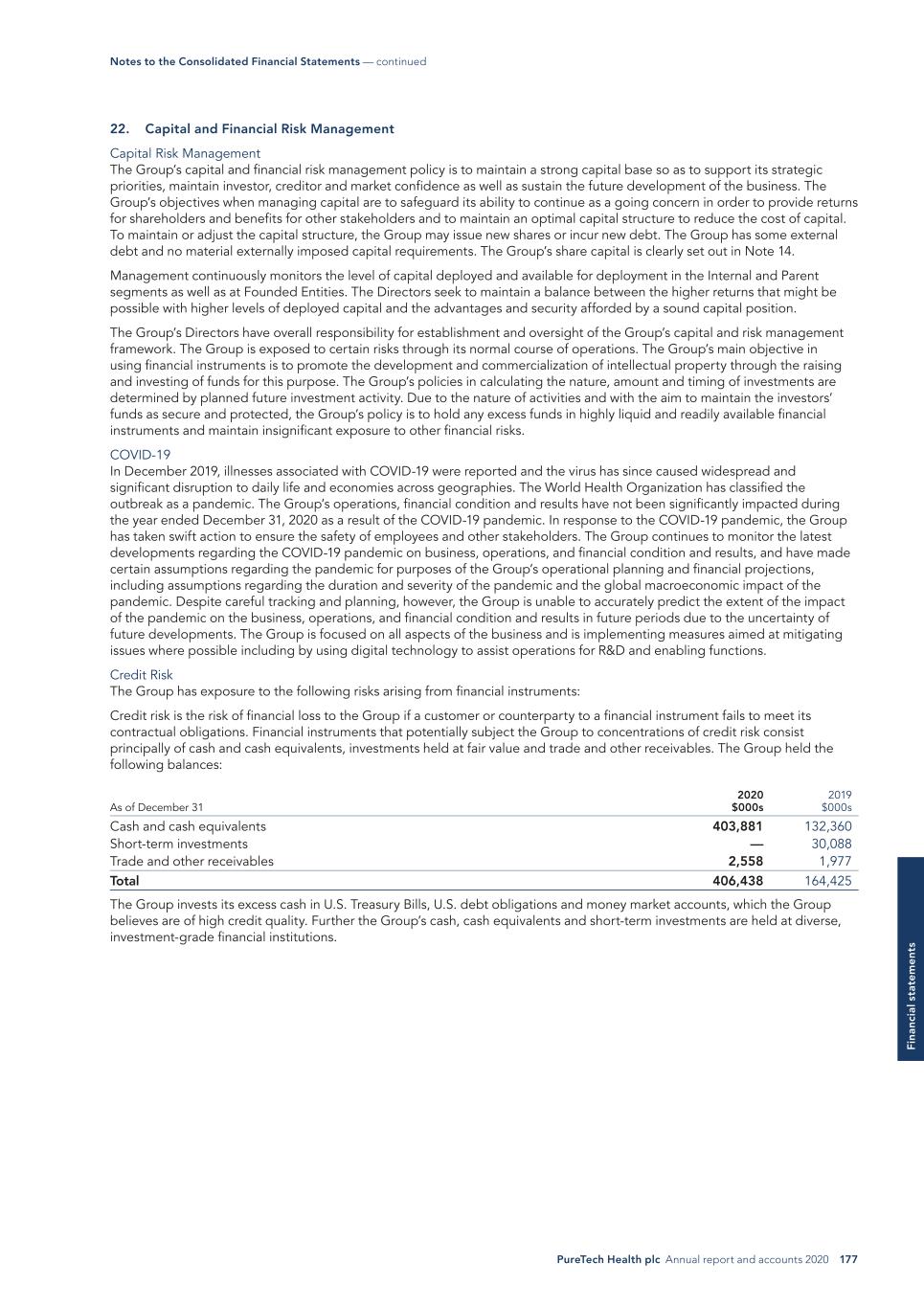 PureTech Health plc Annual report and accounts 2020 177 F in a n ci a l st a te m e n ts Notes to the Consolidated Financial Statements — continued 22. Capital and Financial Risk Management Capital Risk Management The Group’s capital and financial risk management policy is to maintain a strong capital base so as to support its strategic priorities, maintain investor, creditor and market confidence as well as sustain the future development of the business. The Group’s objectives when managing capital are to safeguard its ability to continue as a going concern in order to provide returns for shareholders and benefits for other stakeholders and to maintain an optimal capital structure to reduce the cost of capital. To maintain or adjust the capital structure, the Group may issue new shares or incur new debt. The Group has some external debt and no material externally imposed capital requirements. The Group’s share capital is clearly set out in Note 14. Management continuously monitors the level of capital deployed and available for deployment in the Internal and Parent segments as well as at Founded Entities. The Directors seek to maintain a balance between the higher returns that might be possible with higher levels of deployed capital and the advantages and security afforded by a sound capital position. The Group’s Directors have overall responsibility for establishment and oversight of the Group’s capital and risk management framework. The Group is exposed to certain risks through its normal course of operations. The Group’s main objective in using financial instruments is to promote the development and commercialization of intellectual property through the raising and investing of funds for this purpose. The Group’s policies in calculating the nature, amount and timing of investments are determined by planned future investment activity. Due to the nature of activities and with the aim to maintain the investors’ funds as secure and protected, the Group’s policy is to hold any excess funds in highly liquid and readily available financial instruments and maintain insignificant exposure to other financial risks. COVID-19 In December 2019, illnesses associated with COVID-19 were reported and the virus has since caused widespread and significant disruption to daily life and economies across geographies. The World Health Organization has classified the outbreak as a pandemic. The Group’s operations, financial condition and results have not been significantly impacted during the year ended December 31, 2020 as a result of the COVID-19 pandemic. In response to the COVID-19 pandemic, the Group has taken swift action to ensure the safety of employees and other stakeholders. The Group continues to monitor the latest developments regarding the COVID-19 pandemic on business, operations, and financial condition and results, and have made certain assumptions regarding the pandemic for purposes of the Group’s operational planning and financial projections, including assumptions regarding the duration and severity of the pandemic and the global macroeconomic impact of the pandemic. Despite careful tracking and planning, however, the Group is unable to accurately predict the extent of the impact of the pandemic on the business, operations, and financial condition and results in future periods due to the uncertainty of future developments. The Group is focused on all aspects of the business and is implementing measures aimed at mitigating issues where possible including by using digital technology to assist operations for R&D and enabling functions. Credit Risk The Group has exposure to the following risks arising from financial instruments: Credit risk is the risk of financial loss to the Group if a customer or counterparty to a financial instrument fails to meet its contractual obligations. Financial instruments that potentially subject the Group to concentrations of credit risk consist principally of cash and cash equivalents, investments held at fair value and trade and other receivables. The Group held the following balances: 2020 $000s 2019 $000sAs of December 31 Cash and cash equivalents 403,881 132,360 Short-term investments — 30,088 Trade and other receivables 2,558 1,977 Total 406,438 164,425 The Group invests its excess cash in U.S. Treasury Bills, U.S. debt obligations and money market accounts, which the Group believes are of high credit quality. Further the Group’s cash, cash equivalents and short-term investments are held at diverse, investment-grade financial institutions.
