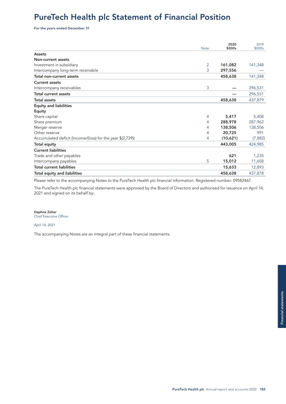 PureTech Health plc Annual report and accounts 2020 185 F in a n ci a l st a te m e n ts 2020 $000s 2019 $000sNote Assets Non-current assets Investment in subsidiary 2 161,082 141,348 Intercompany long-term receivable 3 297,556 — Total non-current assets 458,638 141,348 Current assets Intercompany receivables 3 — 296,531 Total current assets — 296,531 Total assets 458,638 437,879 Equity and liabilities Equity Share capital 4 5,417 5,408 Share premium 4 288,978 287,962 Merger reserve 4 138,506 138,506 Other reserve 4 20,725 991 Accumulated deficit (Income/(loss) for the year $(2,739)) 4 (10,621) (7,882) Total equity 443,005 424,985 Current liabilities Trade and other payables 621 1,235 Intercompany payables 5 15,012 11,658 Total current liabilities 15,633 12,893 Total equity and liabilities 458,638 437,878 Please refer to the accompanying Notes to the PureTech Health plc financial information. Registered number: 09582467. The PureTech Health plc financial statements were approved by the Board of Directors and authorized for issuance on April 14, 2021 and signed on its behalf by: Daphne Zohar Chief Executive Officer April 14, 2021 The accompanying Notes are an integral part of these financial statements. PureTech Health plc Statement of Financial Position For the years ended December 31