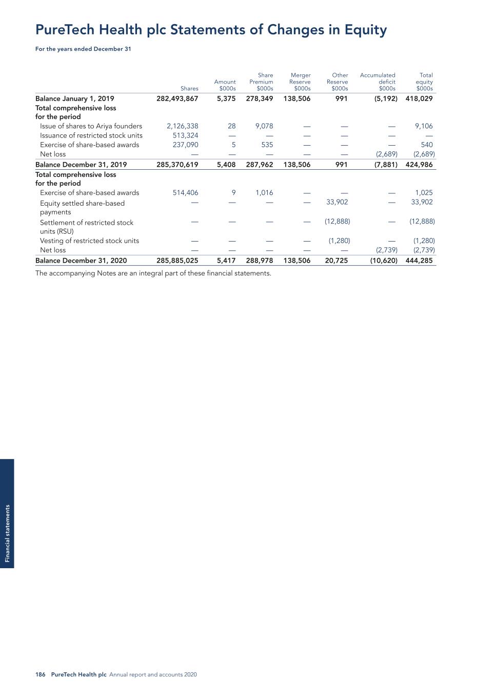 186 PureTech Health plc Annual report and accounts 2020 F in a n ci a l st a te m e n ts Shares Amount $000s Share Premium $000s Merger Reserve $000s Other Reserve $000s Accumulated deficit $000s Total equity $000s Balance January 1, 2019 282,493,867 5,375 278,349 138,506 991 (5,192) 418,029 Total comprehensive loss for the period Issue of shares to Ariya founders 2,126,338 28 9,078 — — — 9,106 Issuance of restricted stock units 513,324 — — — — — — Exercise of share-based awards 237,090 5 535 — — — 540 Net loss — — — — — (2,689) (2,689) Balance December 31, 2019 285,370,619 5,408 287,962 138,506 991 (7,881) 424,986 Total comprehensive loss for the period Exercise of share-based awards 514,406 9 1,016 — — — 1,025 Equity settled share-based payments — — — — 33,902 — 33,902 Settlement of restricted stock units (RSU) — — — — (12,888) — (12,888) Vesting of restricted stock units — — — — (1,280) — (1,280) Net loss — — — — — (2,739) (2,739) Balance December 31, 2020 285,885,025 5,417 288,978 138,506 20,725 (10,620) 444,285 The accompanying Notes are an integral part of these financial statements. PureTech Health plc Statements of Changes in Equity For the years ended December 31